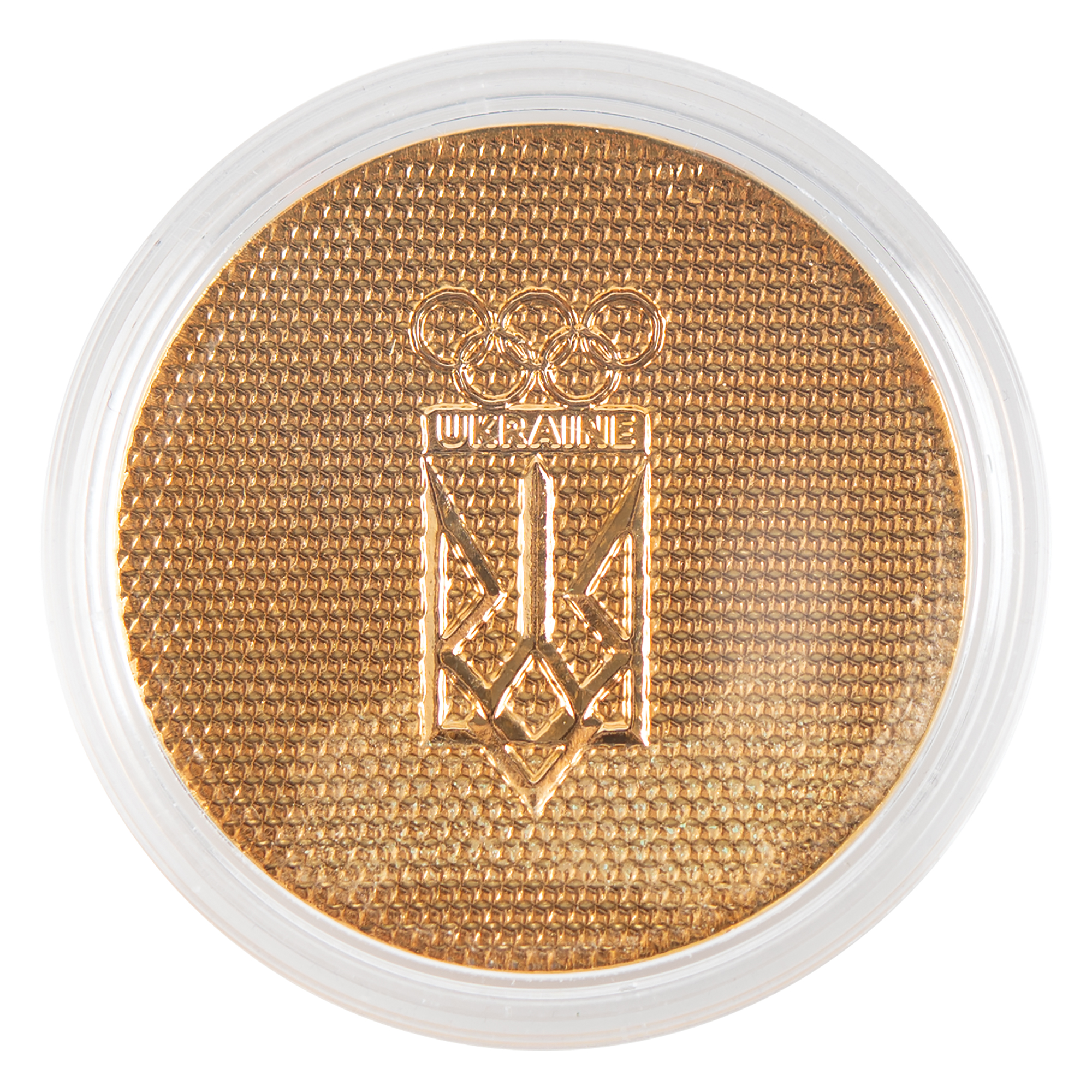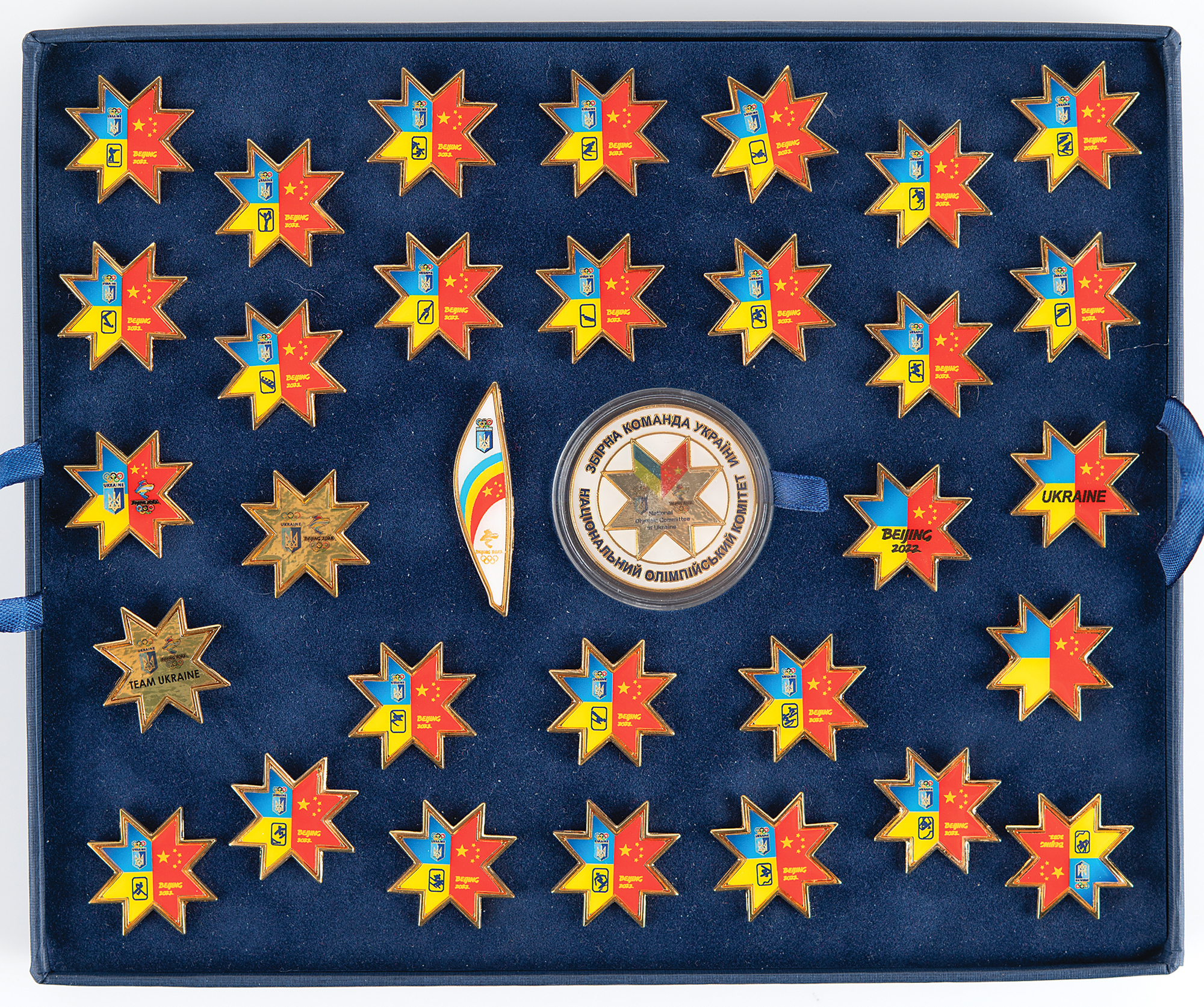 Attractive collection of 31 pins issued by the National Olympic Committee of Ukraine (NOCU) for the Beijing 2022 Winter Olympics. The set includes 30 star-shaped gold-tone pins, each 1˝ in diameter, the majority of which feature the flag colors of Ukraine and China, and 24 pins bearing the NOCU, the text “Beijing 2022,” and pictograms of the various winter Olympic sports. Also included is a 1.75˝ long torch-style pin and a central 1.5˝ medallion with enamel designs and star-shaped Ukraine-China logo, the reverse of which bears the NOCU emblem. Includes its original blue presentation box. In very fine condition.