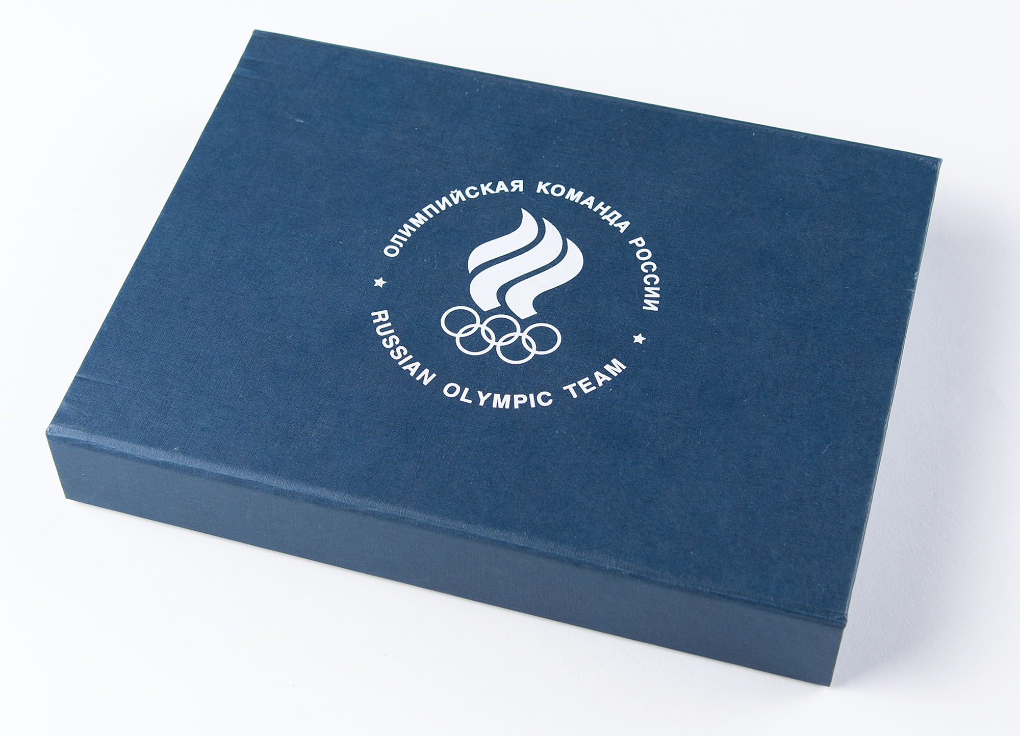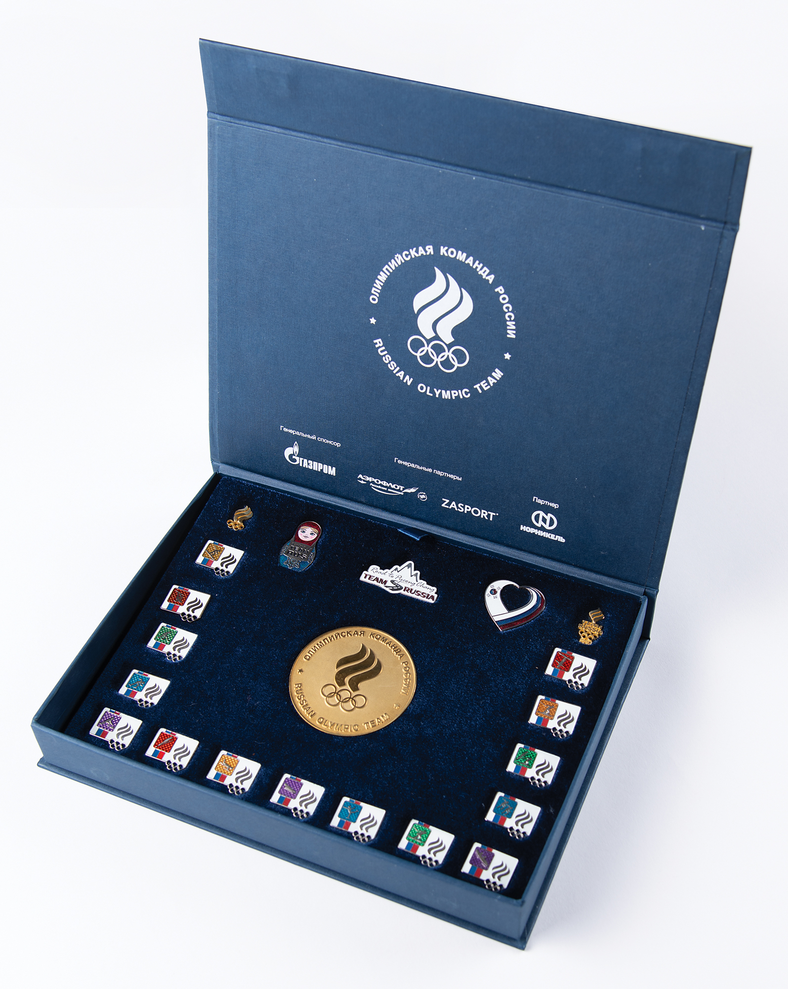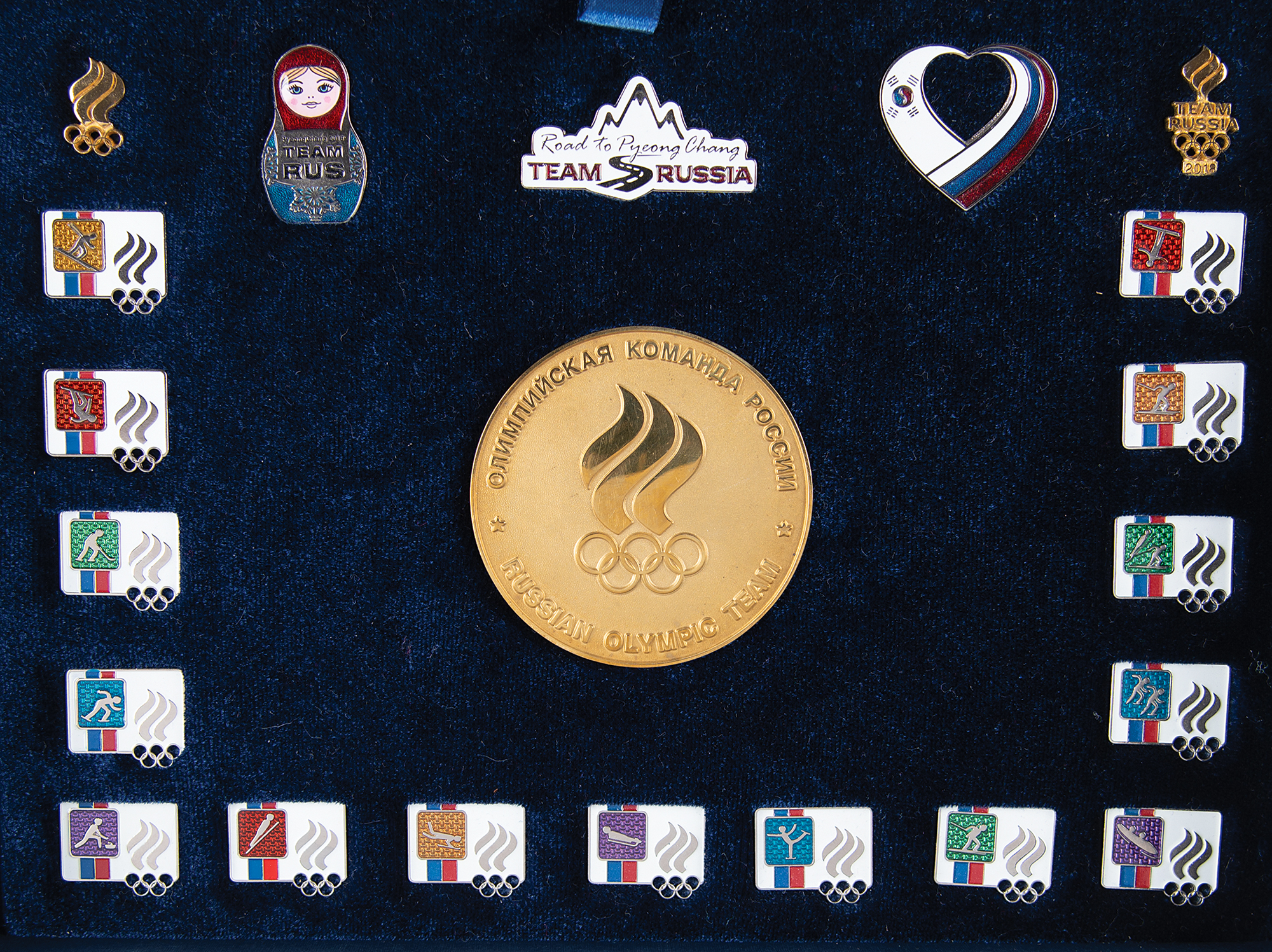 Collection of 20 pins issued by the Russian Olympic Team for the PyeongChang 2018 Winter Olympics. The set includes 15 silver tone pins, each .75″ x .75″, which feature the logo for the Russian Olympic Committee and pictograms of the 15 winter Olympic sports. Also included are five other Team Russia pins related to the PyeongChang Games and a bronze-tone medallion issued by the Russian Olympic Committee, 57 mm, 106 gm, with raised text to either side honoring the Russian Olympic Team and the XXIII Olympic Winter Games. Includes its original blue presentation box. In fine condition, with the back spike to the snow-boarding pin detached but present within its holder.