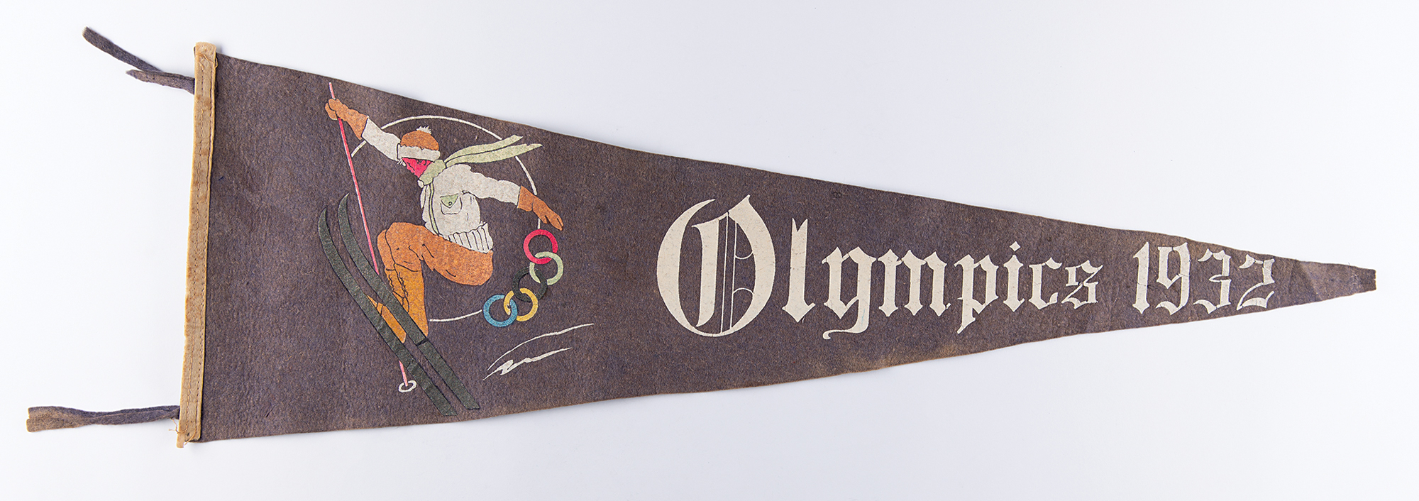 Original navy blue souvenir pennant from the Lake Placid 1932 Winter Olympics, measuring 33″ by 11″, featuring the image of a skier with the Olympic rings, and white text: "Olympics 1932." In very good to fine condition.