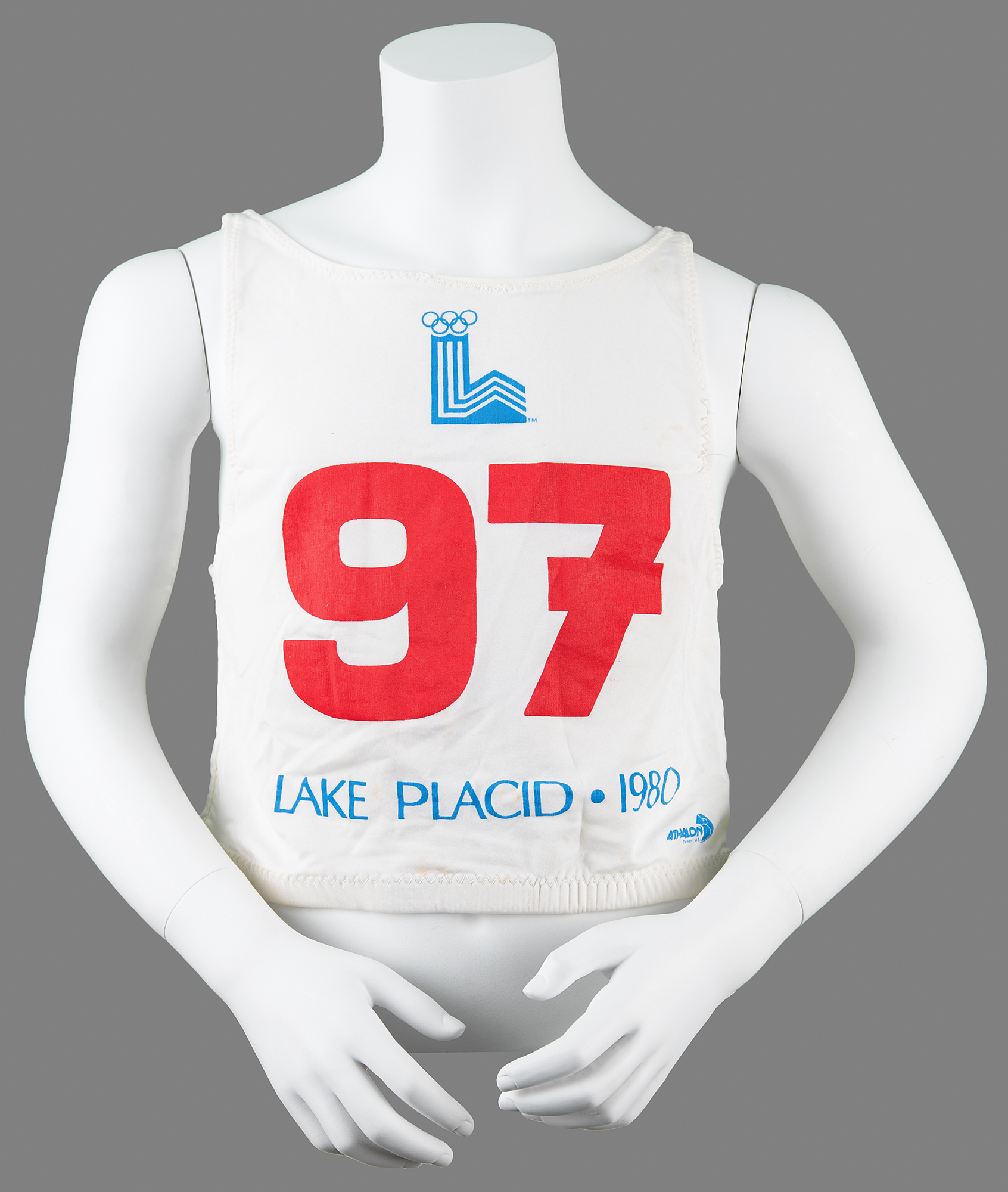 Scarce competitor's bib from the Lake Placid 1980 Winter Olympics made by Athalon, measuring 14″ x 14″, with the number "97" in red on both sides, between Winter Games logo and blue text: "Lake Placid - 1980." The bib features shoulder loops with elastic at the waist. In fine condition.