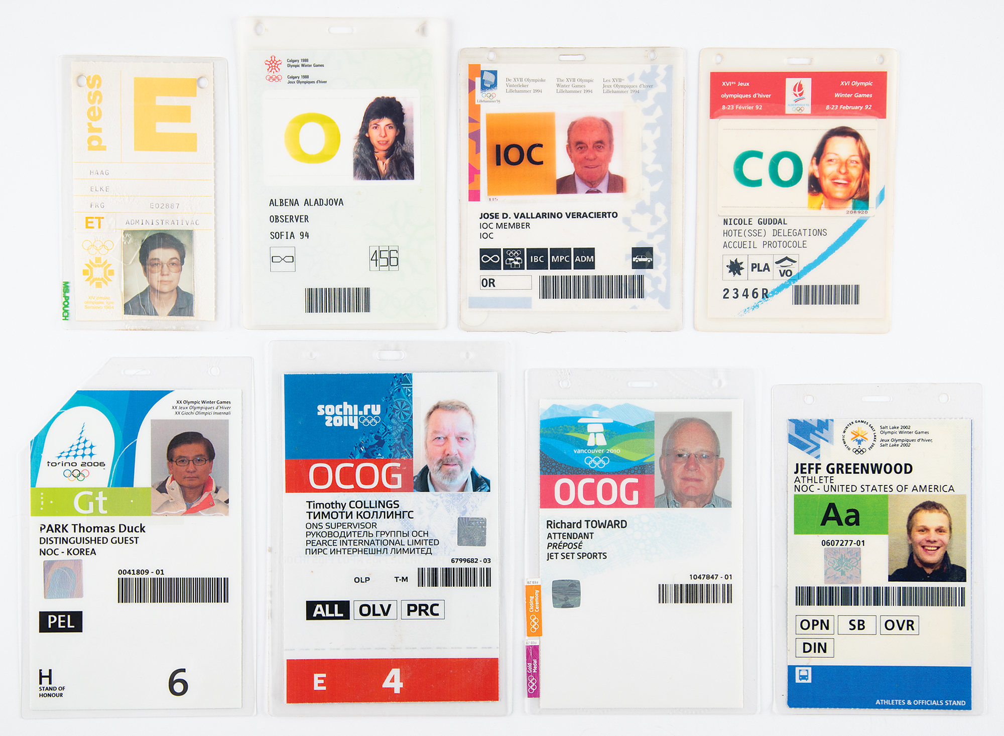 Unique lot of eight official identification badges for various officials, media members, workers, and athletes from Winter Olympics held between 1984 and 2014, including: 1984 Sarajevo (press), 1988 Calgary (observer), 1992 Albertville (hostess delegation), 1994 Lillehammer (IOC member), 2002 Salt Lake City (athlete), 2006 Torino (NOC distinguished guest), 2010 Vancouver (attendant), and 2014 Sochi (media). In overall fine condition.