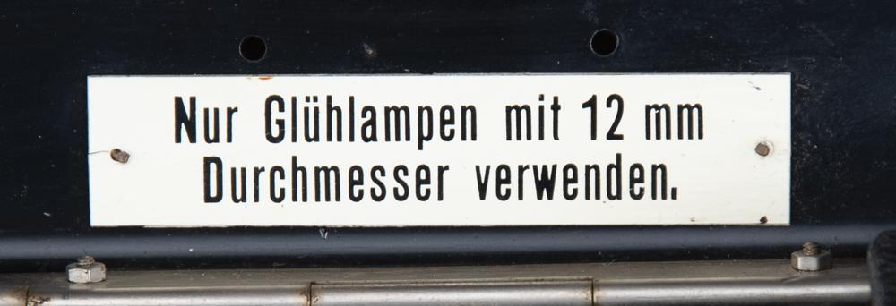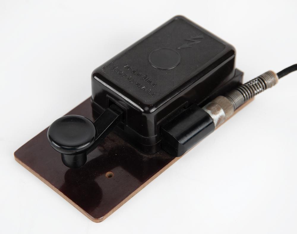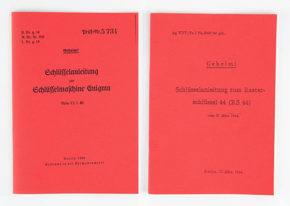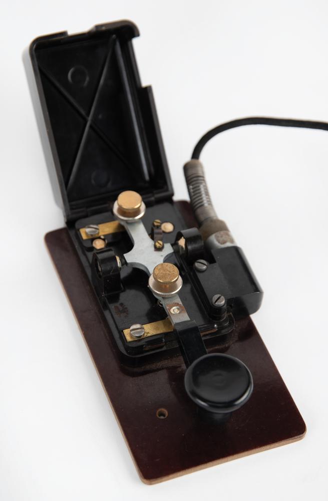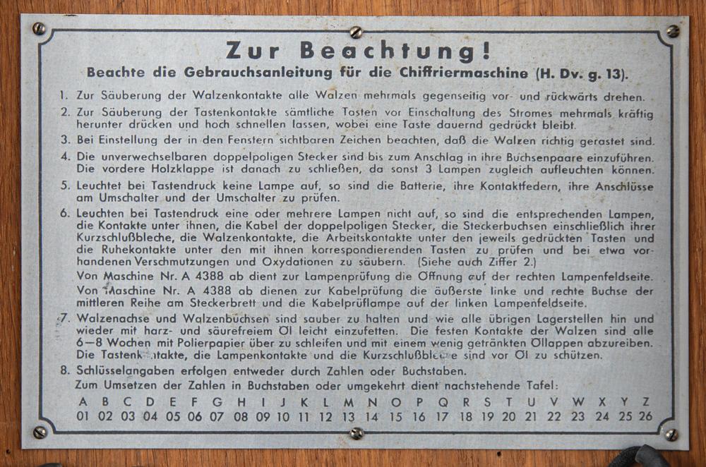 The Enigma machine has a standard German "QWERTZ" keyboard with 26 white-on-black keys, with matching "QWERTZ" lighted display. When a key is pressed, the corresponding encoded letter—as determined by the specific arrangement of the rotor wheels and plugboard—is illuminated. The rightmost rotor steps once each time a key is pressed. At an adjustable point it triggers the middle rotor to step, and so on. Through this mechanism, an easily crackable simple substitution cipher is avoided—letters are not encoded the same way twice. An encoded message would be written down and transmitted, usually via radio telegraph (a standard World War II-era German Wehrmacht Baumuster T1 telegraph key is included with this machine). In order to decode a message, the Enigma machine on the receiving end would have to be set up with the plugboard and rotor wheels in the same pattern as the sending Enigma: when the encoded message was typed in, the decoded letters would light up, revealing the secret message one character at a time. Since no original batteries have survived, this machine has been modified to accept two modern C batteries. Also includes two reprints of Enigma operator manuals.