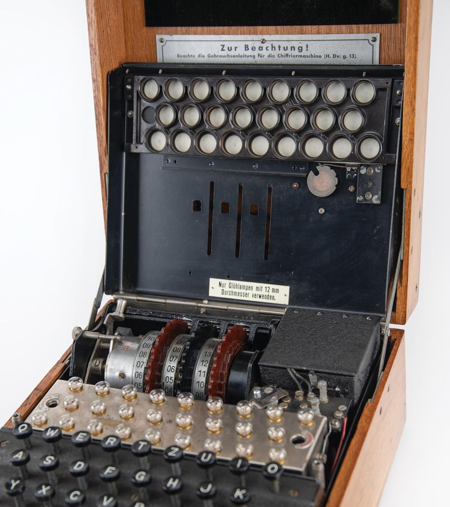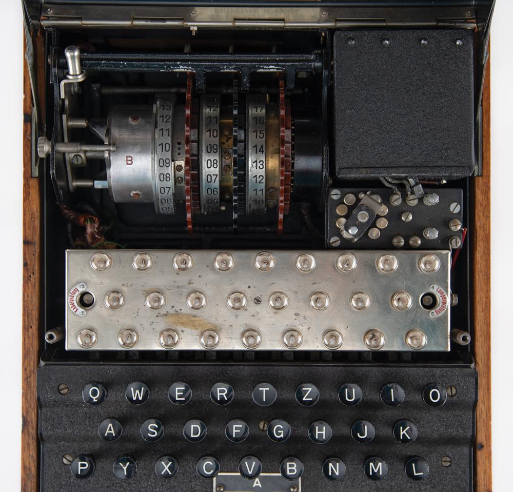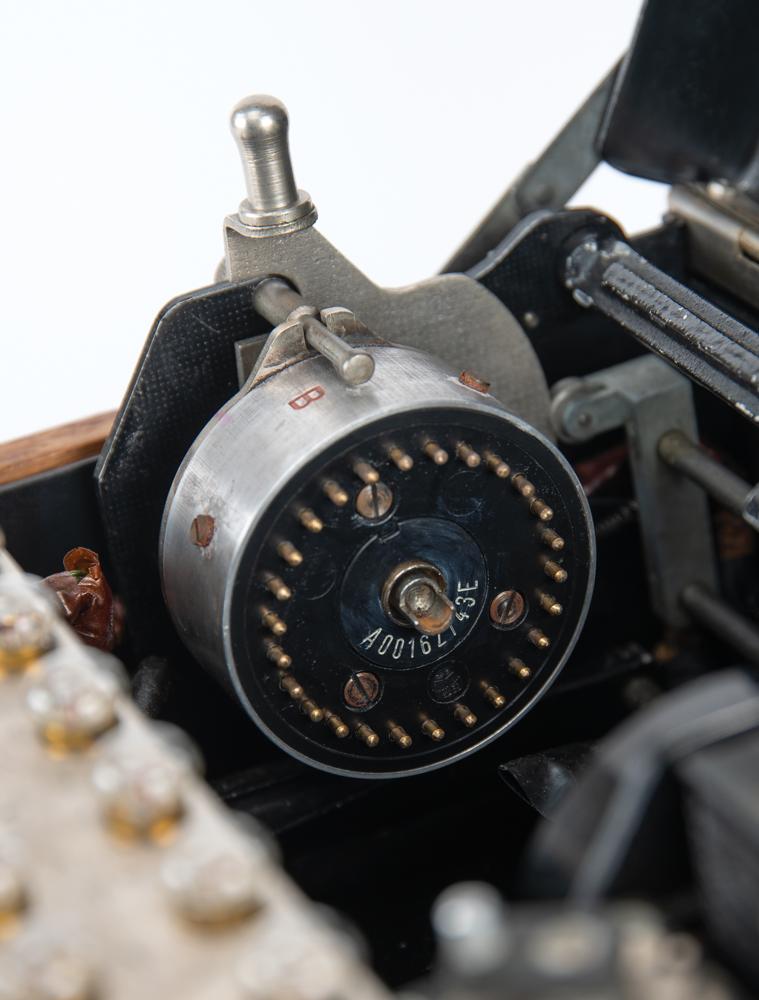 First patented in 1918 by Arthur Scherbius, the Enigma machine was developed for use in the transmission of confidential information: in addition to its obvious military and diplomatic applications, the machine found commercial use for the encryption of sensitive financial data. The German military adopted the Enigma as its primary cipher in 1926, after learning that the British had intercepted and interpreted coded German naval messages during World War I. Amidst the subsequent buildup of German forces, Poland felt particularly vulnerable—having been ceded disputed border territories by the Treaty of Versailles—and sought to crack the Enigma. Genius Polish codebreakers—led by Marian Rejewski, Jerzy Rozycki, and Henryk Zygalski—developed techniques for the decryption of Enigma code, and turned over their research to Allied counterparts after Germany's 1939 invasion of Poland. Alan Turing and the other brilliant code breakers at Bletchley Park continued their important work, speeding up the time it took to decode Enigma messages. The code breaking efforts at Bletchley Park led to the development of the world's first computers as technology was pushed to defeat German cipher machines. Historians agree that these decoded messages shortened World War II by about two years, perhaps denying Nazi Germany the time needed to develop nuclear weapons. As a functional, late-war example of the German military's Enigma machine, this piece is truly a marvel of technological, code-breaking, and WWII history.