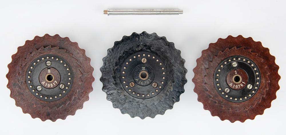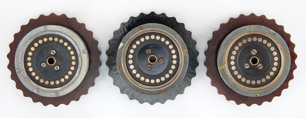 The present rotors demonstrate a progression in design, which evolved as resources became scarce over the course of the war. The earliest rotors featured an all-metal construction, while later examples had Bakelite thumbwheels and ratchet wheels: these three are the late war, Bakelite variants. Each rotor displays one of its 26 numerals through the three windows in the machine's cover. They have spring-loaded brass contacts on the sides corresponding to each of the 26 numbers, and they may be arranged in any order on the internal shaft. The specific settings of the rotors and plugboard were determined on a daily basis via a secret codebook that allowed the German forces to synchronize their Enigma machines.