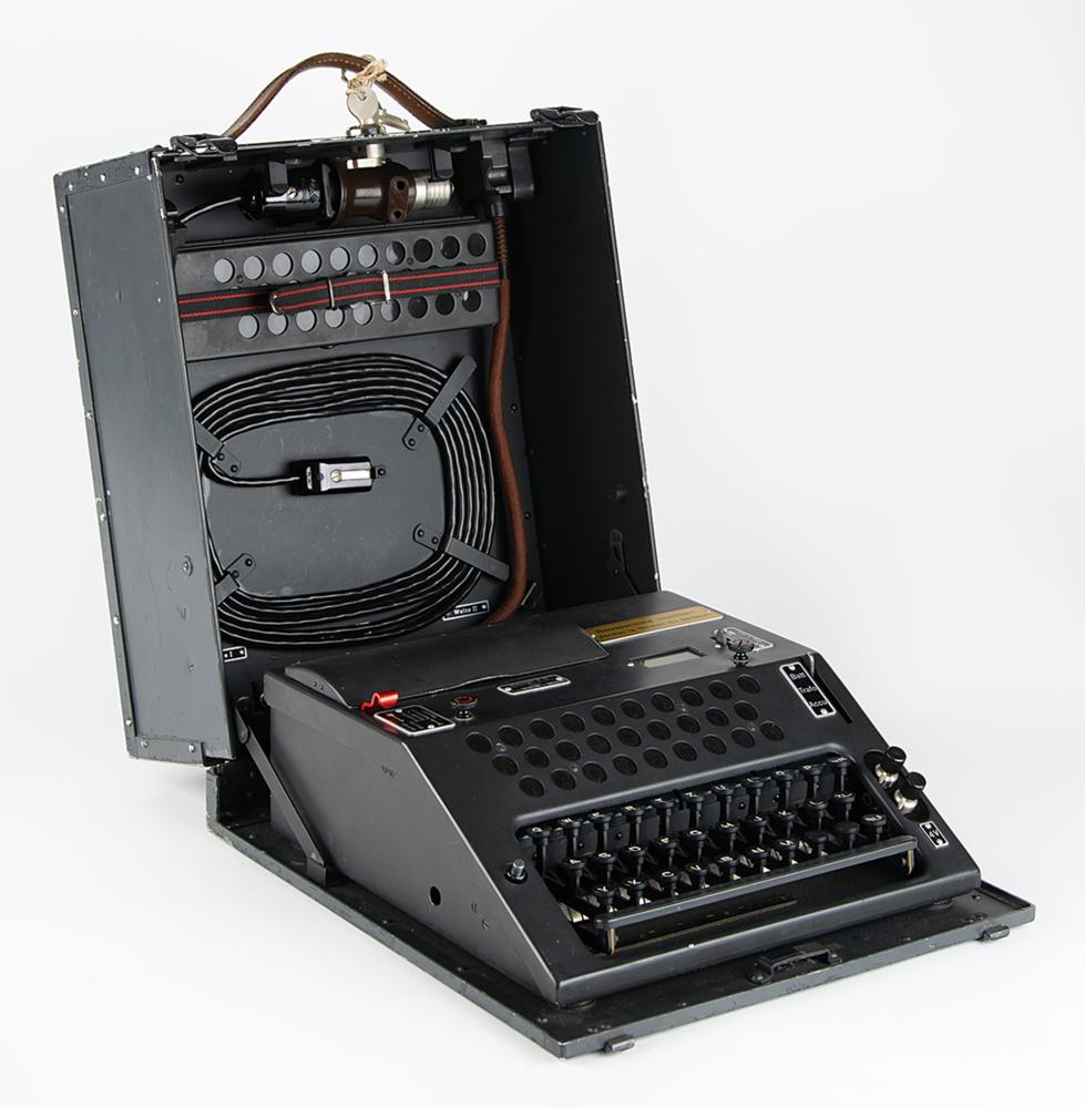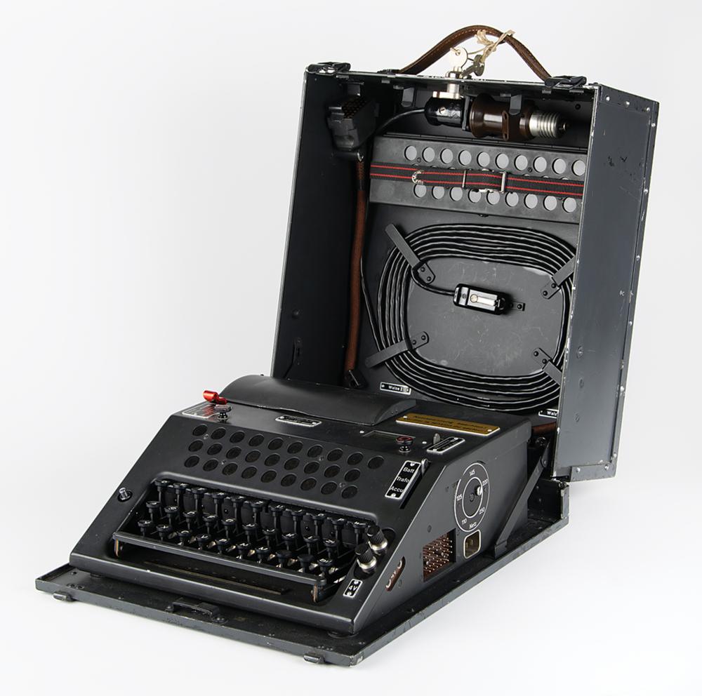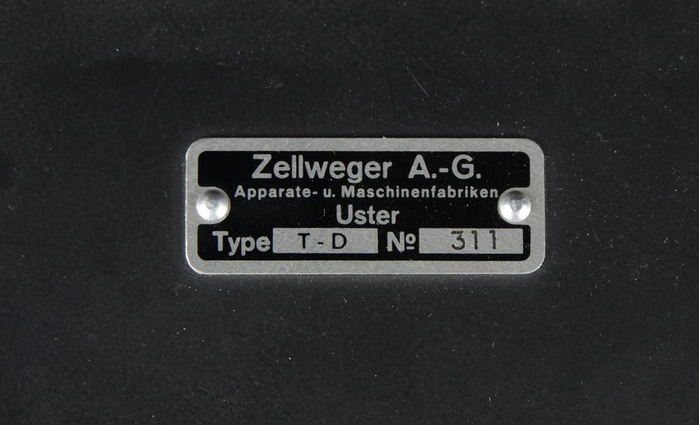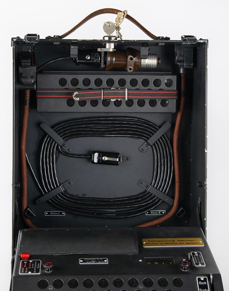 Original Swiss NEMA Model 45 cipher machine, serial no. TD-311, developed by Zellweger AG in Uster, Switzerland, during World War II as a replacement for the German Enigma Model K that was being used by the Swiss Army. The machine is also known as T-D, which stands for Tasten-Drücker Maschine (key-press machine). The machine is housed in its original 13″ x 14.5″ x 5.5″ locking case.