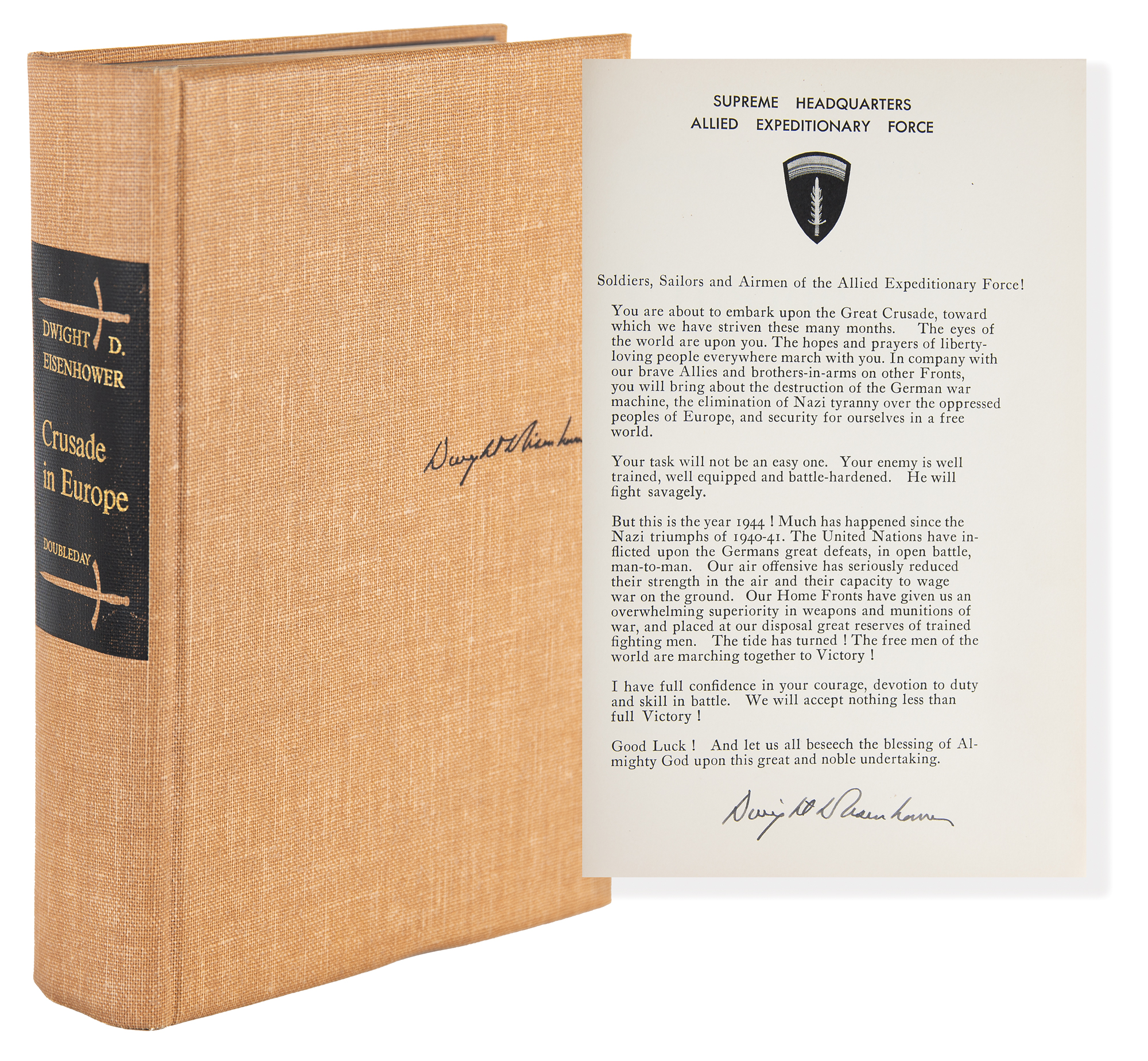 Signed book: Crusade in Europe. First edition, limited issue, numbered 207/1426. NY: Doubleday, 1948. Hardcover with publisher's slipcase, 7 x 10, 559 pages. Signed in fountain pen on a special prefatory page reproducing Eisenhower’s ‘Order of the Day’ on D-Day, “Dwight D. Eisenhower.” Autographic condition: fine. Book condition: VG in a VG- slipcase, with a bookplate affixed to the half-title page, and edgewear, scuffing, and light staining to the slipcase.