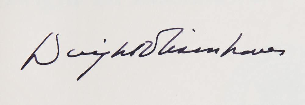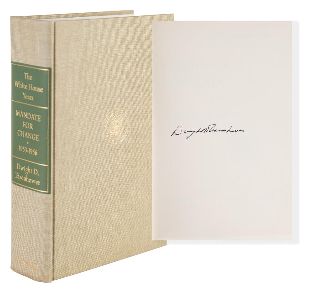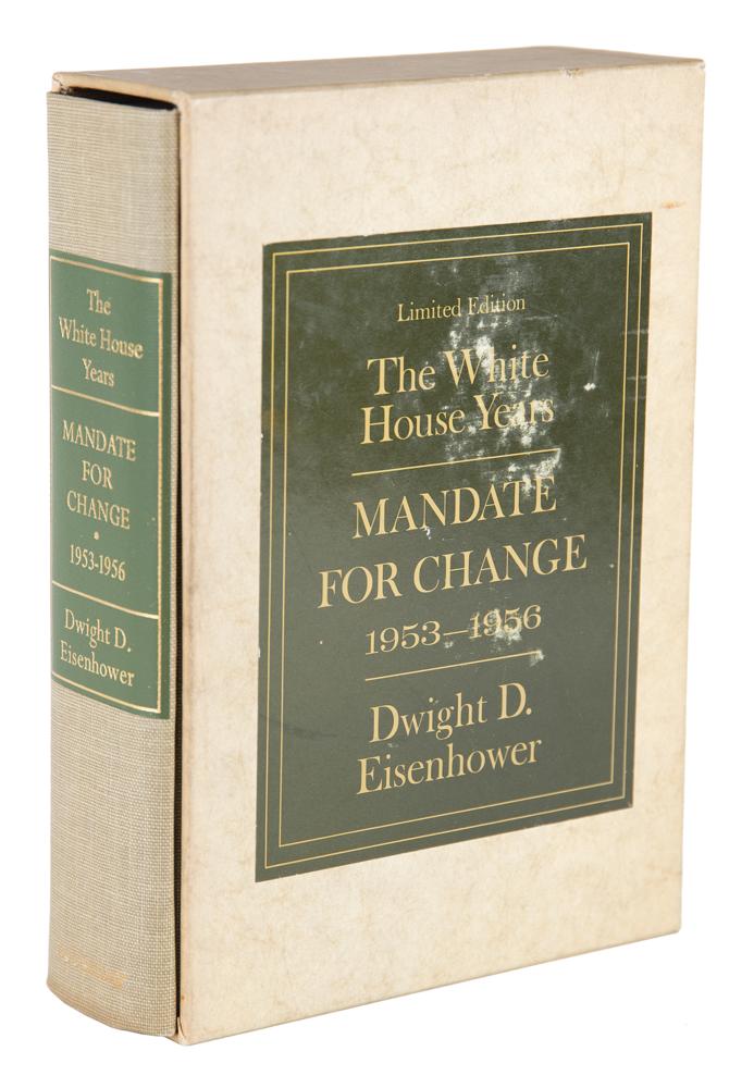 Signed book: The White House Years: Mandate for Change, 1953-1956. First edition, limited issue, numbered 675/1500. Garden City, NY: Doubleday, 1963. Hardcover with mylar jacket and publisher's slipcase, 6.5 x 9.5, 650 pages. Signed opposite the colophon in black felt tip by Dwight D. Eisenhower. Autographic condition: fine. Book condition: VG+ in a VG slipcase, with a bookplate affixed to the front pastedown, and some rubbing to the case.