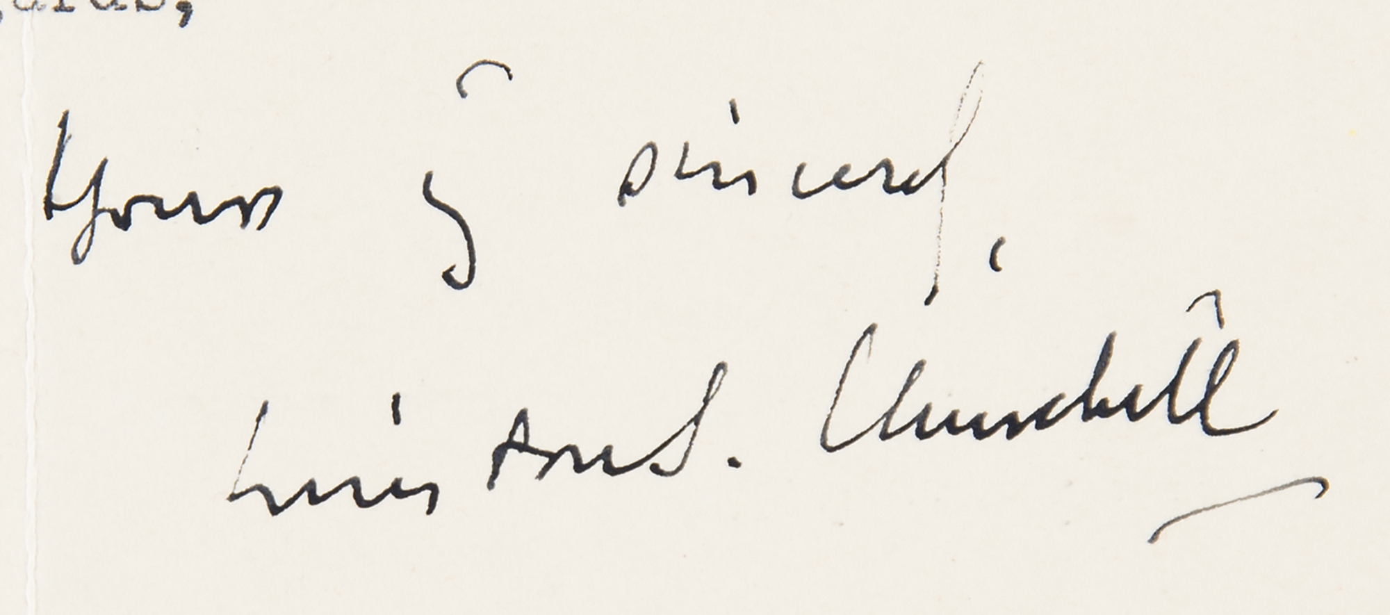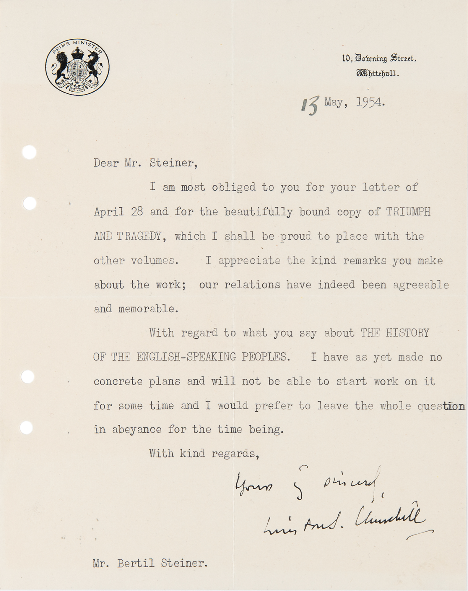 TLS signed “Yours sincerely, Winston S. Churchill,” one page, 7.5 x 9.5, 10 Downing Street letterhead, May 13, 1954. Letter to his Swedish publisher Bertil Steiner, in full: "I am most obliged to you for your letter of April 28 and for the beautifully bound copy of Triumph and Tragedy, which I shall be proud to place with the other volumes. I appreciate the kind remarks you make about the work; our relations have indeed been agreeable and memorable. With regard to what you say about The History of the English-Speaking Peoples. I have as yet made no concrete plans and will not be able to start work on it for some time and I would prefer to leave the whole question in abeyance for the time being." In fine condition, with file holes along the left edge.