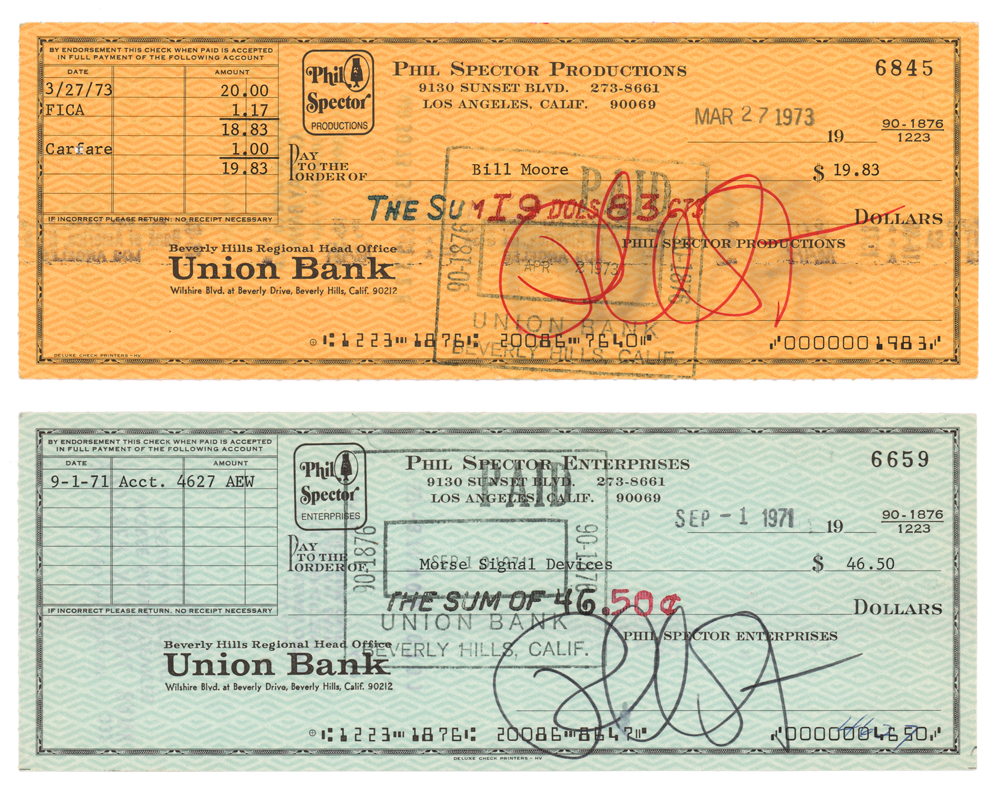 Two Phil Spector Enterprises business checks, 8.25 x 3, both filled out in type and signed prominently in felt tip by Spector, payable to Morse Signal Devices for $46.50 on September 1, 1971, and to Bill Moore for $19.83 on March 27, 1973. In overall fine condition.