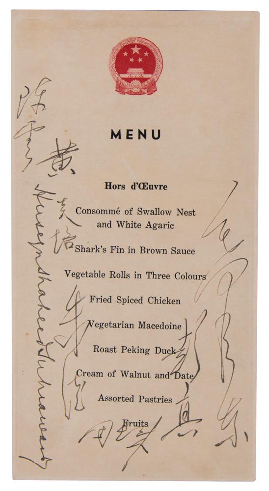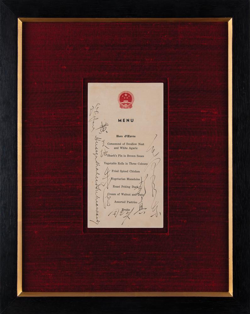 Remarkable and historic official menu from the state banquet honoring the first Pakistani state visit to China, held in Beijing on October 19, 1956, one page, 4.5 x 8.5, signed in fountain pen by six powerful Chinese statesmen—Mao Zedong, Zhou Enlai, Huang Yanpei, Peng Zhen, Chen Yun, and Zhu De—as well as Prime Minister Huseyn Shaheed Suhrawardy of Pakistan. The menu bears a state insignia printed at the head of the sheet, and lists a delectable menu of exotic offerings: "Consommé of Swallow Nest and White Agaric, Shark's Fin in Brown Sauce, Vegetable Rolls in Three Colours, Fried Spiced Chicken, Vegetarian Macedoine, Roast Peking Duck, Cream of Walnut and Date, Assorted Pastries, Fruits." The signed menu is mounted, handsomely matted in red cloth, and framed to an overall size of 15 x 18.5. In fine condition.