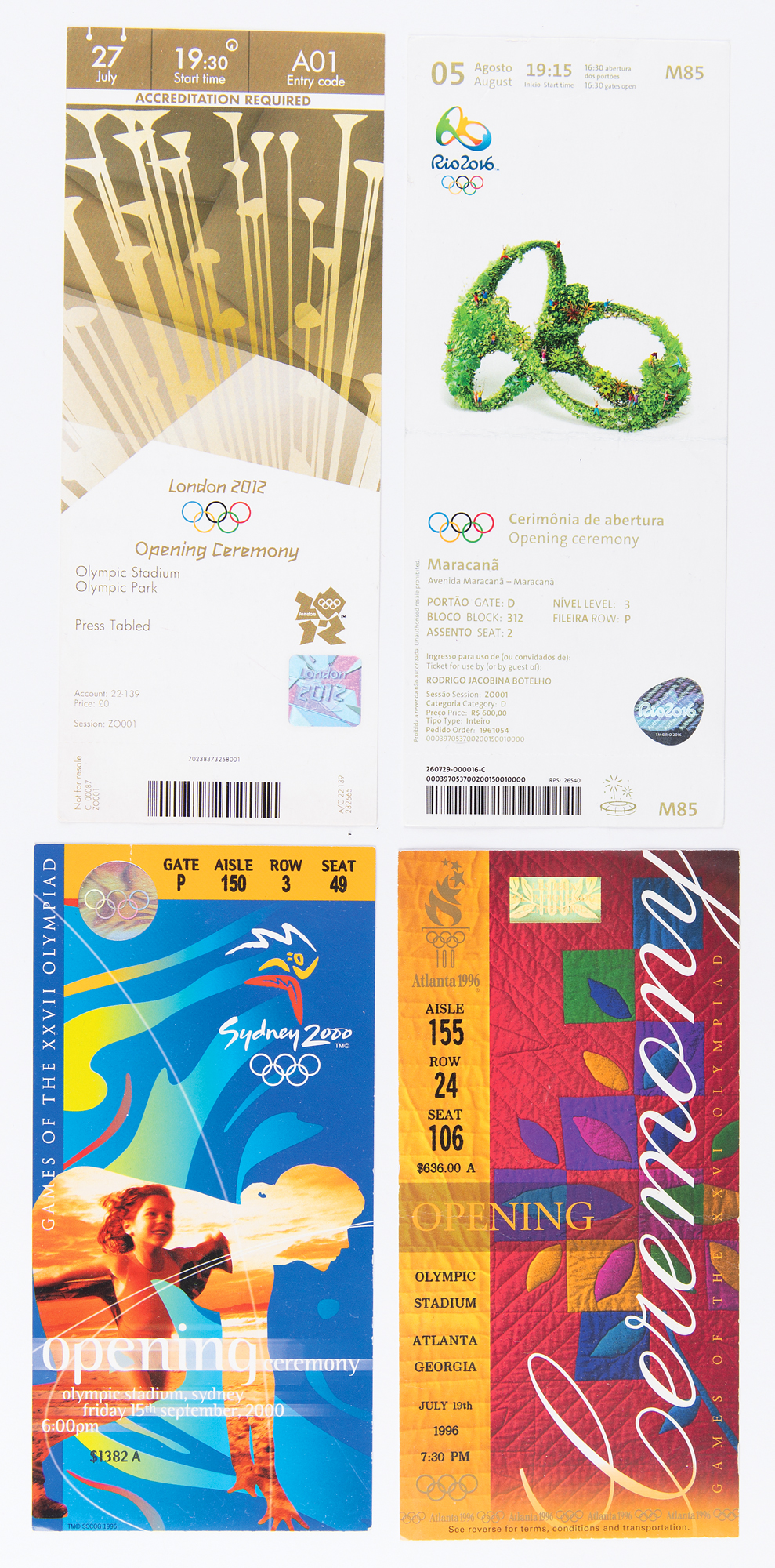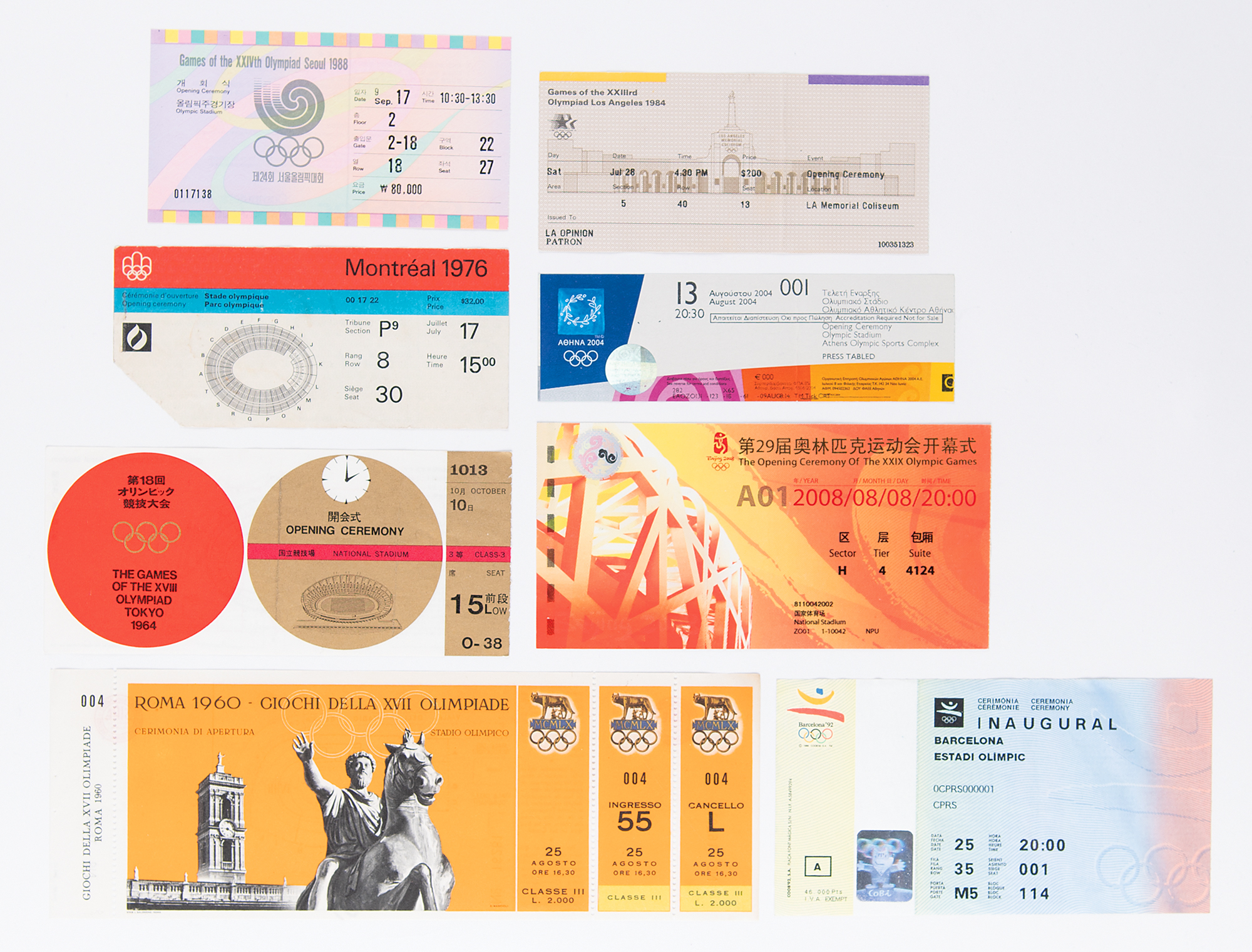 Fantastic lot of Opening Ceremony tickets and ticket stubs for every Summer Olympics held from 1928 to 2016, featuring both spectator tickets and media passes. The comprehensive collection offers one from each of the following Olympic Games: 1928 Amsterdam, 1932 Los Angeles, 1936 Berlin, 1948 London, 1952 Helsinki, 1956 Melbourne, 1960 Rome, 1964 Tokyo, 1968 Mexico City, 1972 Munich, 1976 Montreal, 1980 Moscow, 1984 Los Angeles, 1988 Seoul, 1992 Barcelona, 1996 Atlanta, 2000 Sydney, 2004 Athens, 2008 Beijing, 2012 London, and 2016 Rio de Janeiro. In overall very fine condition with some near mint.