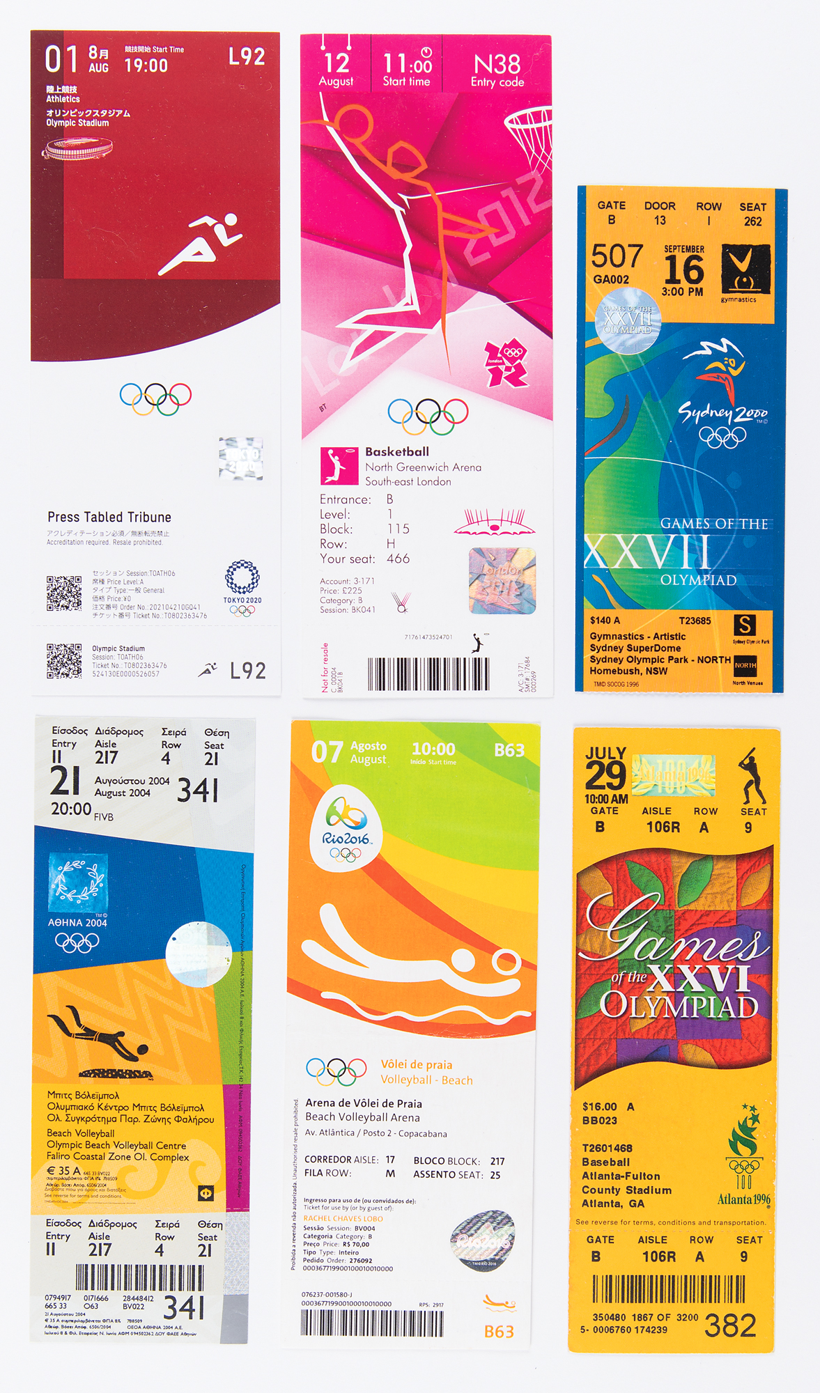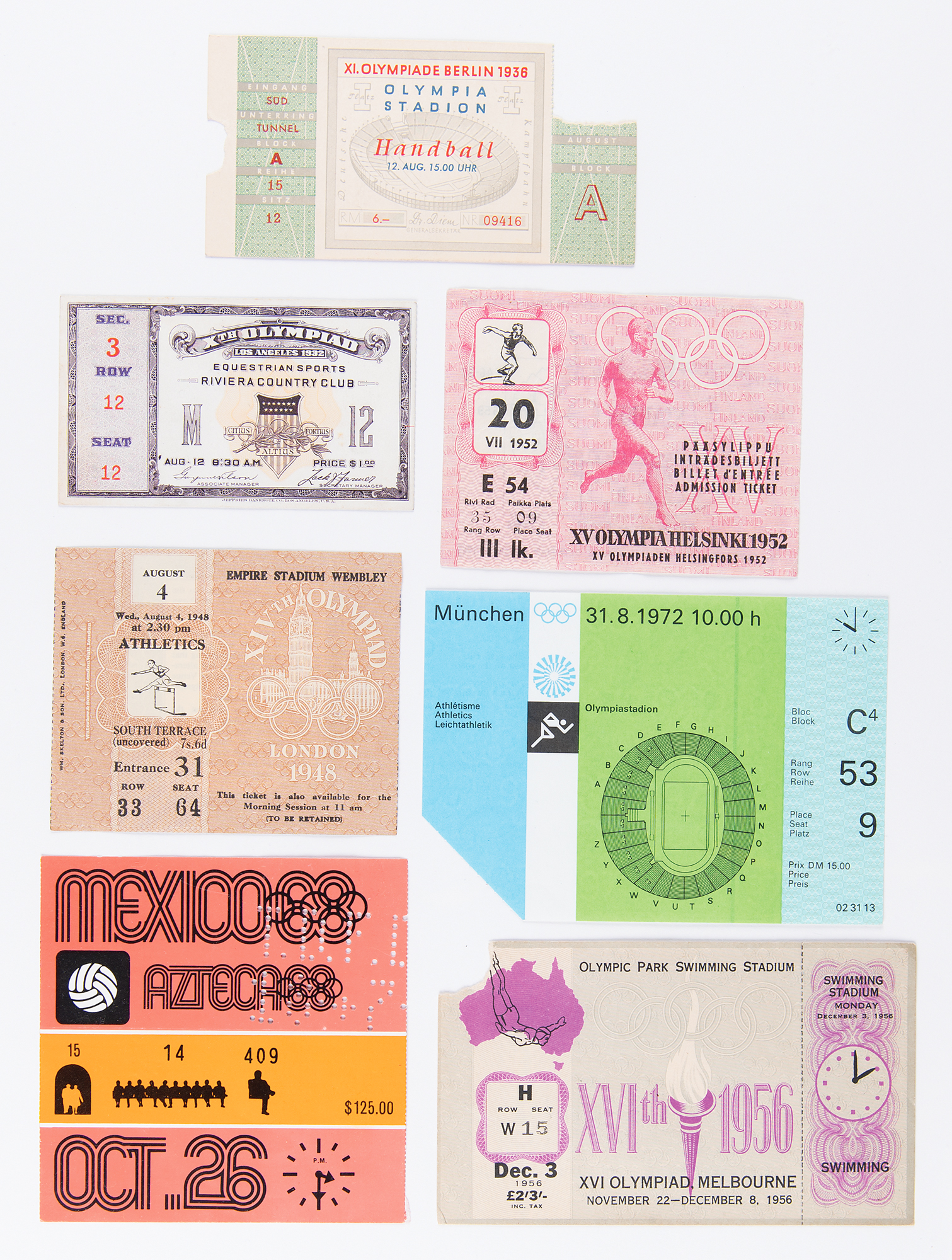 Comprehensive lot of event tickets and ticket stubs for every Summer Olympics held from 1932 to 2020, featuring both spectator tickets and media passes. The large collection offers one from each of the following Olympic Games: 1932 Los Angeles (equestrian), 1936 Berlin (handball), 1948 London (athletics), 1952 Helsinki (athletics), 1956 Melbourne (swimming), 1960 Rome (equestrian), 1964 Tokyo (athletics), 1968 Mexico City (soccer), 1972 Munich (athletics), 1976 Montreal (swimming), 1980 Moscow (soccer), 1984 Los Angeles (wrestling), 1988 Seoul (diving), 1992 Barcelona (handball), 1996 Atlanta (baseball), 2000 Sydney (gymnastics), 2004 Athens (beach volleyball), 2008 Beijing (gymnastics), 2012 London (basketball), 2016 Rio de Janeiro (beach volleyball), and 2020 Tokyo (athletics—a rare media ticket, as no spectators were allowed due to the pandemic). In overall very fine condition with some near mint.