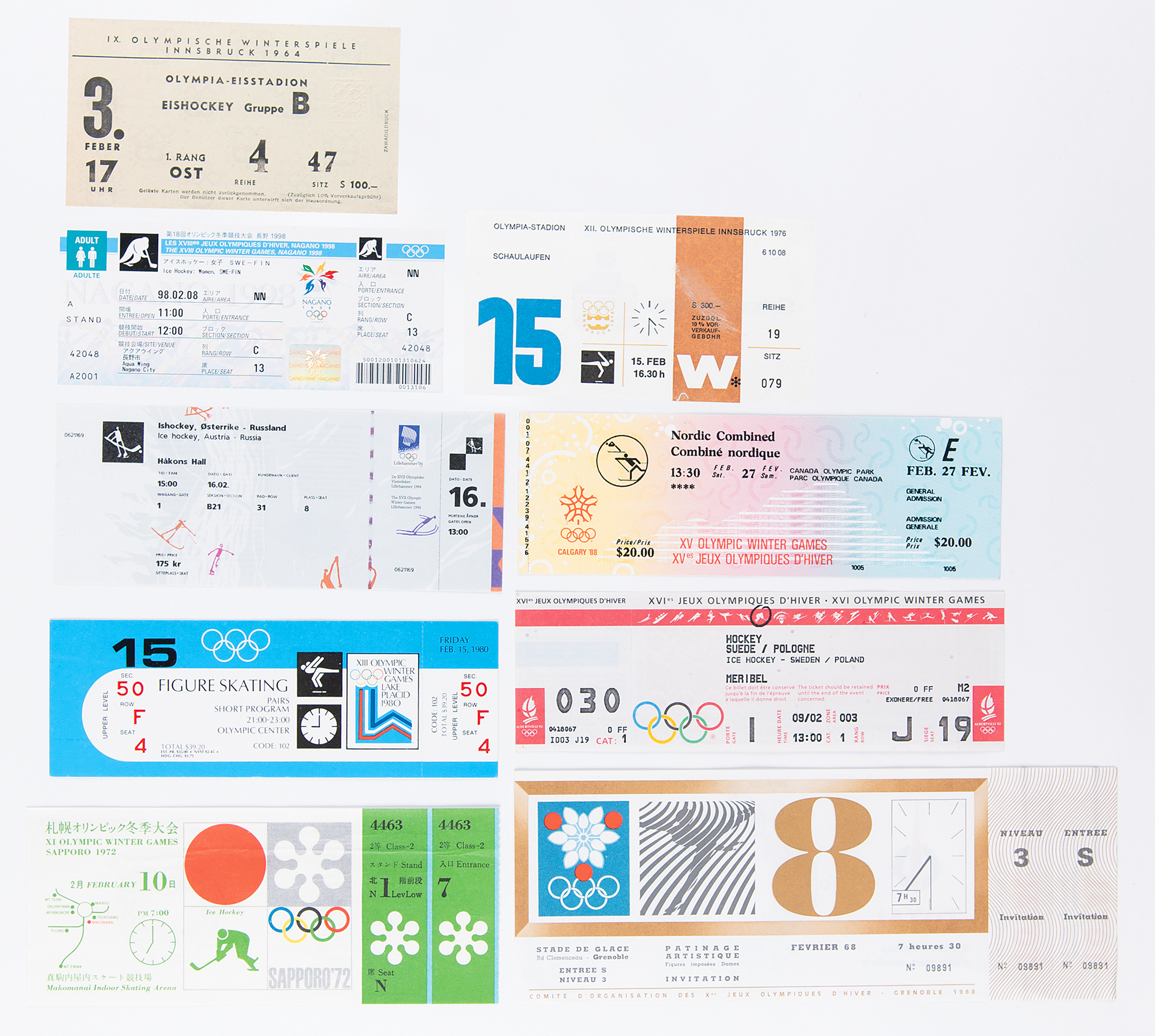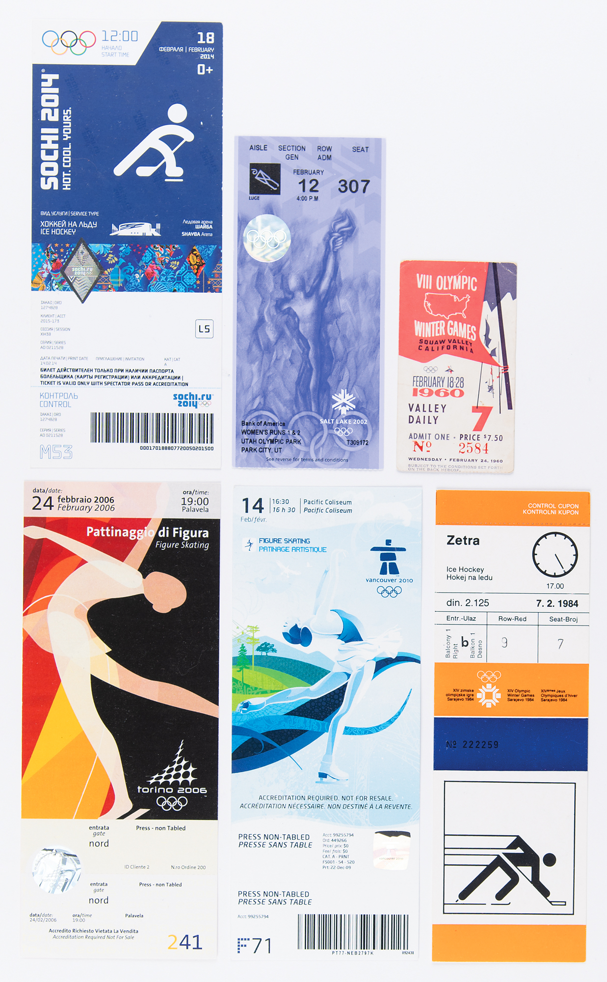 Great lot of event tickets and ticket stubs for every Winter Olympics held from 1960 to 2014, featuring both spectator tickets and media passes. The comprehensive collection offers one from each of the following Olympic Games: 1960 Squaw Valley (daily valley), 1964 Innsbruck (ice hockey), 1968 Grenoble (figure skating), 1972 Sapporo (ice hockey), 1976 Innsbruck (figure skating), 1980 Lake Placid (figure skating), 1984 Sarajevo (ice hockey), 1988 Calgary (Nordic combined), 1992 Albertville (ice hockey), 1994 Lillehammer (ice hockey), 1998 Nagano (ice hockey), 2002 Salt Lake City (luge), 2006 Torino (figure skating), 2010 Vancouver (figure skating), and 2014 Sochi (ice hockey). In overall very fine condition with some near mint.