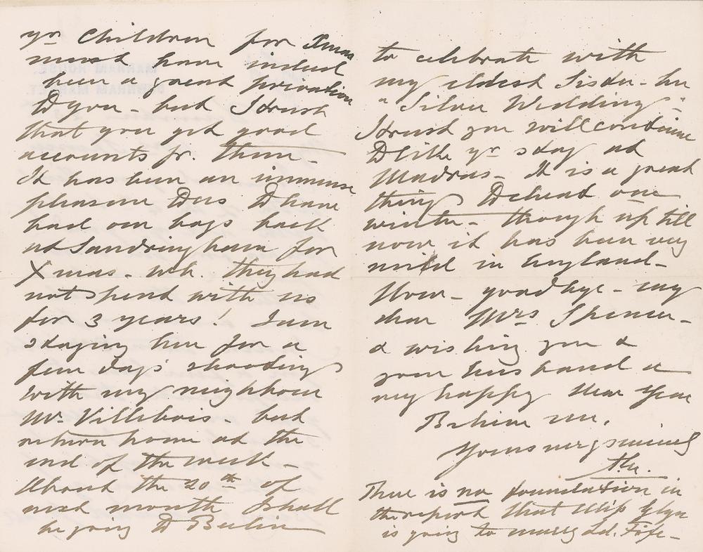 ALS signed “A. E.,” three pages on two adjoining sheets, 4.5 x 7, Marham House, Downham Market letterhead, December 28, [1883]. Handwritten letter containing excellent content that mentions his sister Princess Victoria and his daughter Princess Louise. In part: "I received your kind letter of the 4th today, with all yr good wishes for the New Year—& cannot do better—as the Mail leaves tomorrow for India—then scribble you a few lines to reciprocate those good wishes. Most sincerely do I wish you all happiness in the ensuing year...I shall be going to Berlin to celebrate with my eldest sister—her 'Silver Wedding.'" In fine condition. Edward's eldest sister, Victoria, Princess Royal, celebrated the 25th anniversary of her wedding to Frederick III, German Emperor, in 1883.