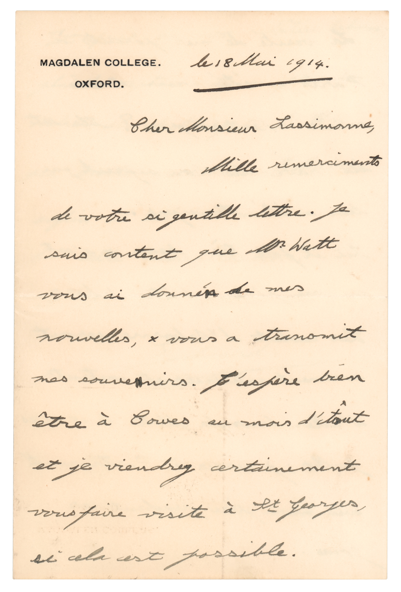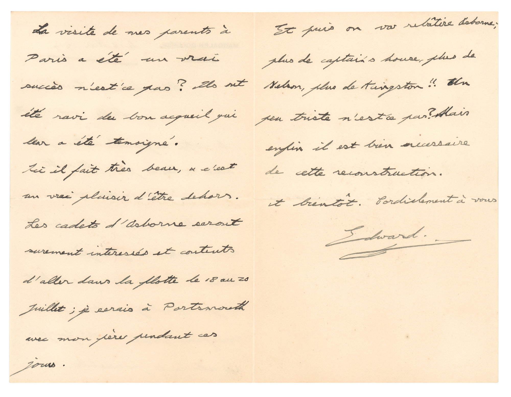 Early ALS in French, signed “Edward,” three pages on two adjoining sheets, 4 x 6, Magdalen College letterhead, May 18, 1914. Handwritten letter to his former tutor Lucien Lassimonne, in full (translated): "Many thanks for your kind letter. I am pleased that Mr. Watt has given you my news and remembered me to you. I am hoping to be at Cowes in August and I will certainly come and visit you at St. Georges if that is possible. My parents' visit to Paris was a great success, wasn’t it? They were delighted with the warm welcome which was shown them. Here the weather is fine and it is a real pleasure to be outside. The Osborne cadets will I am sure be interested and happy taking part in the Naval Review from 18th to 20th July. I will be in Portsmouth with my Father at that time, and then Osborne is going to be rebuilt. No more Captain’s House, no more Nelson, no more Kingston. It is a little sad, isn’t it?, but the reconstruction is necessary." In fine condition. Accompanied by the original mailing envelope, hand addressed by the Prince of Wales, who signs his initial "E" to the lower left corner; reverse bears an embossed black wax seal. Lucien Lassimonne was the French tutor to the Prince of Wales during his time at the Royal Naval College in Osborne.