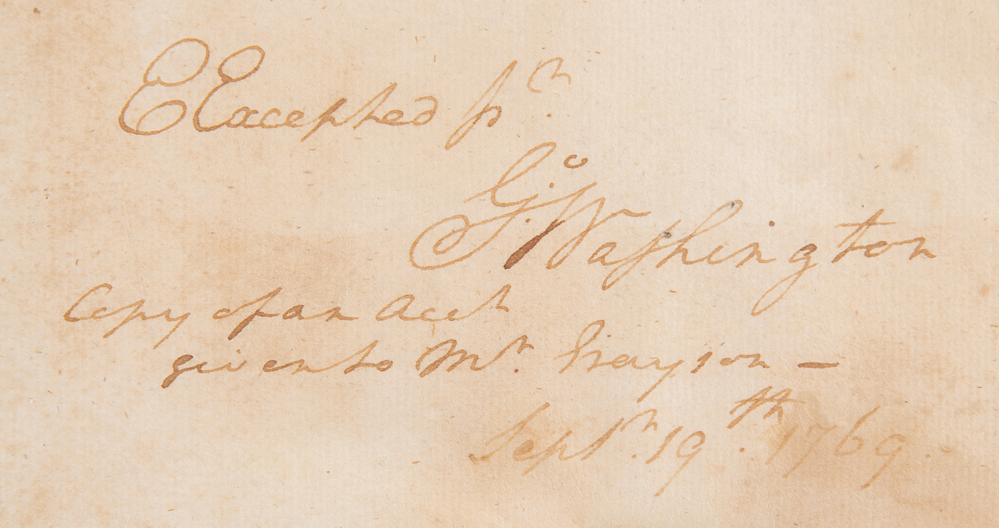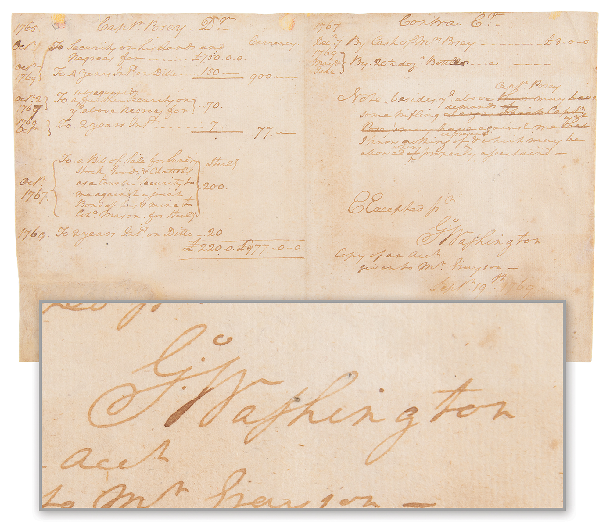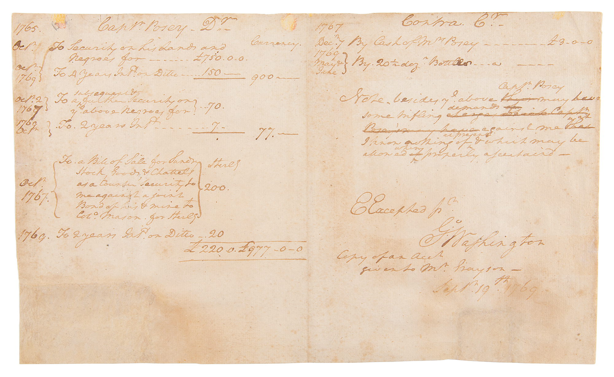 ADS, signed “Go: Washington,” two pages on two adjoining sheets, 6 x 7.5, September 19, 1769. A handwritten financial ledger document headed "Capt'n Posey," transactions made between 1765 and 1769, including "Security on his Lands and Negroes for £750," "A subsequent & further security on ye above Negroes for £70," and "a Bill of Sale for Sundry stock, goods & chattels as a…security to me against a joint bond of his & mine to Colo. Mason for £200." On the right side, a £3 cash payment is recorded, below which Washington writes: "Note, besides ye above Capt'n Posey may have some trifling demands against me that I know nothing of at present & which may be showed when properly ascertained." Washington signs at the conclusion with errors excepted, "E. Excepted pr Go: Washington, Copy of an Acc't given to Mr. Grayson, Sept'r 19th 1769." Professionally restored to near fine condition, with toning, light foxing and staining, and professional repairs to two areas of paper loss (which affect none of the handwriting).