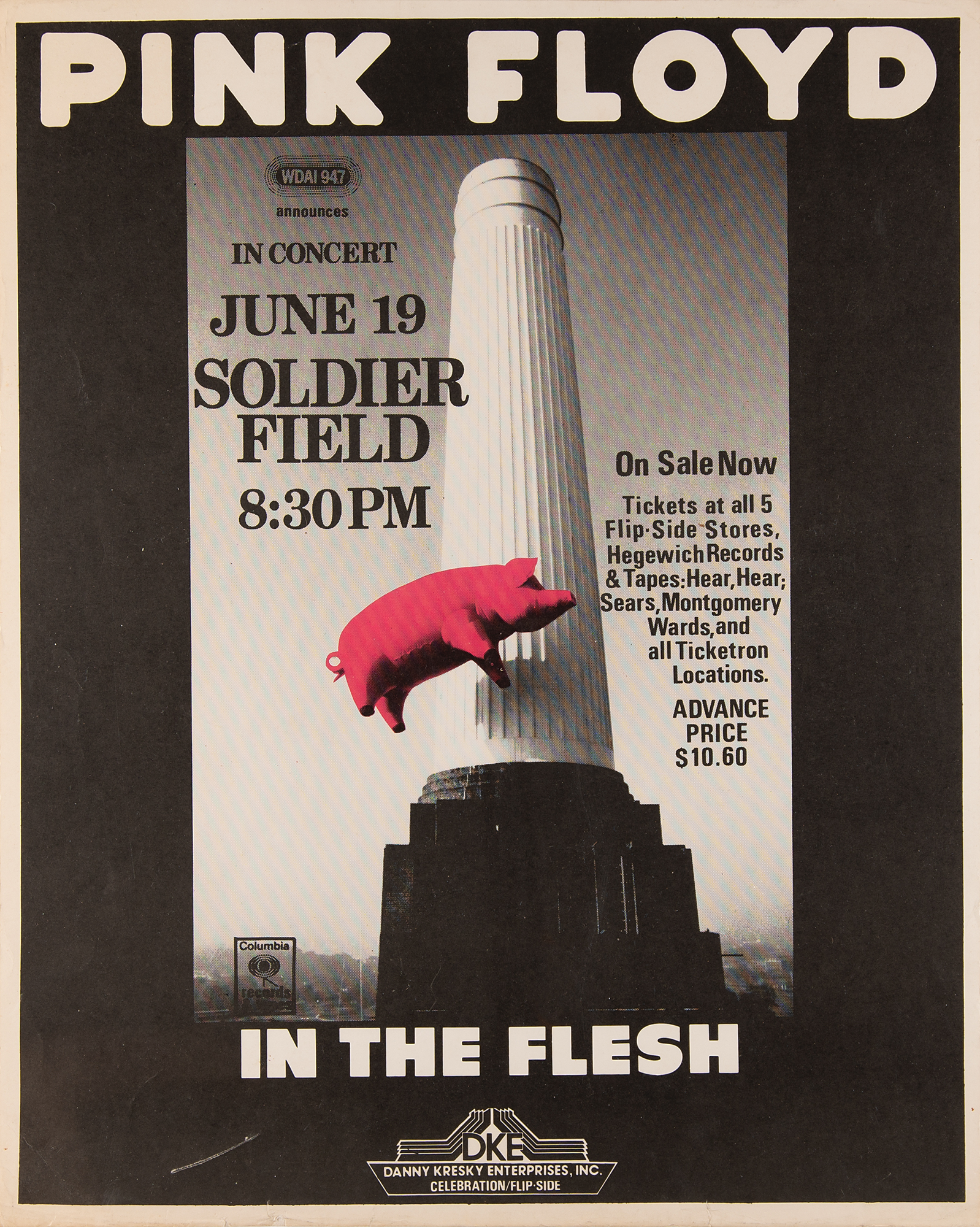 Original first printing color 17.25 x 21.75 concert poster for Pink Floyd at Soldier Field in Chicago, Illinois, on June 19, 1977, during their 'In the Flesh' [Animals] tour. In fine condition, with a small surface abrasion to the lower left, and some small tears and creasing along the bottom edge. The tour featured large inflatable puppets, as well as a pyrotechnic 'waterfall,' and one of the biggest and most elaborate stages to date—the iconic 'flying pig' would become a staple prop of Pink Floyd's live shows.