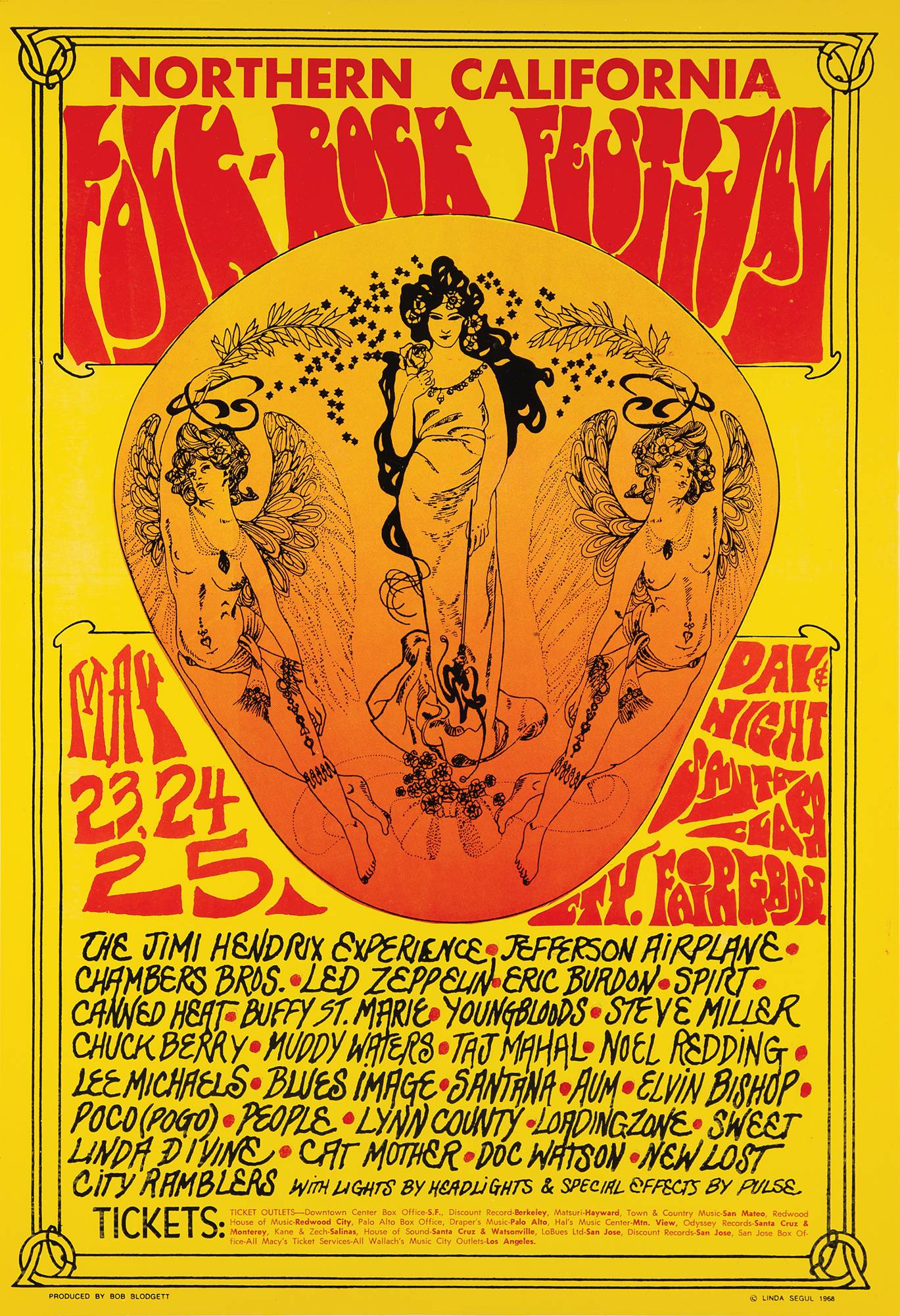 Original first printing color 14 x 20.5 poster designed by Linda Segul for the 2nd Annual Northern California Folk-Rock Festival held at the Santa Clara County Fairgrounds in San Jose, California, on May 23-25, 1969, which featured performances by the Jimi Hendrix Experience, Led Zeppelin, Jefferson Airplane, The Chambers Brothers, Eric Burdon, Spirit, Canned Heat, Buffy Sainte-Marie, The Youngbloods, Steve Miller, Chuck Berry, Muddy Waters, and more. In fine condition.