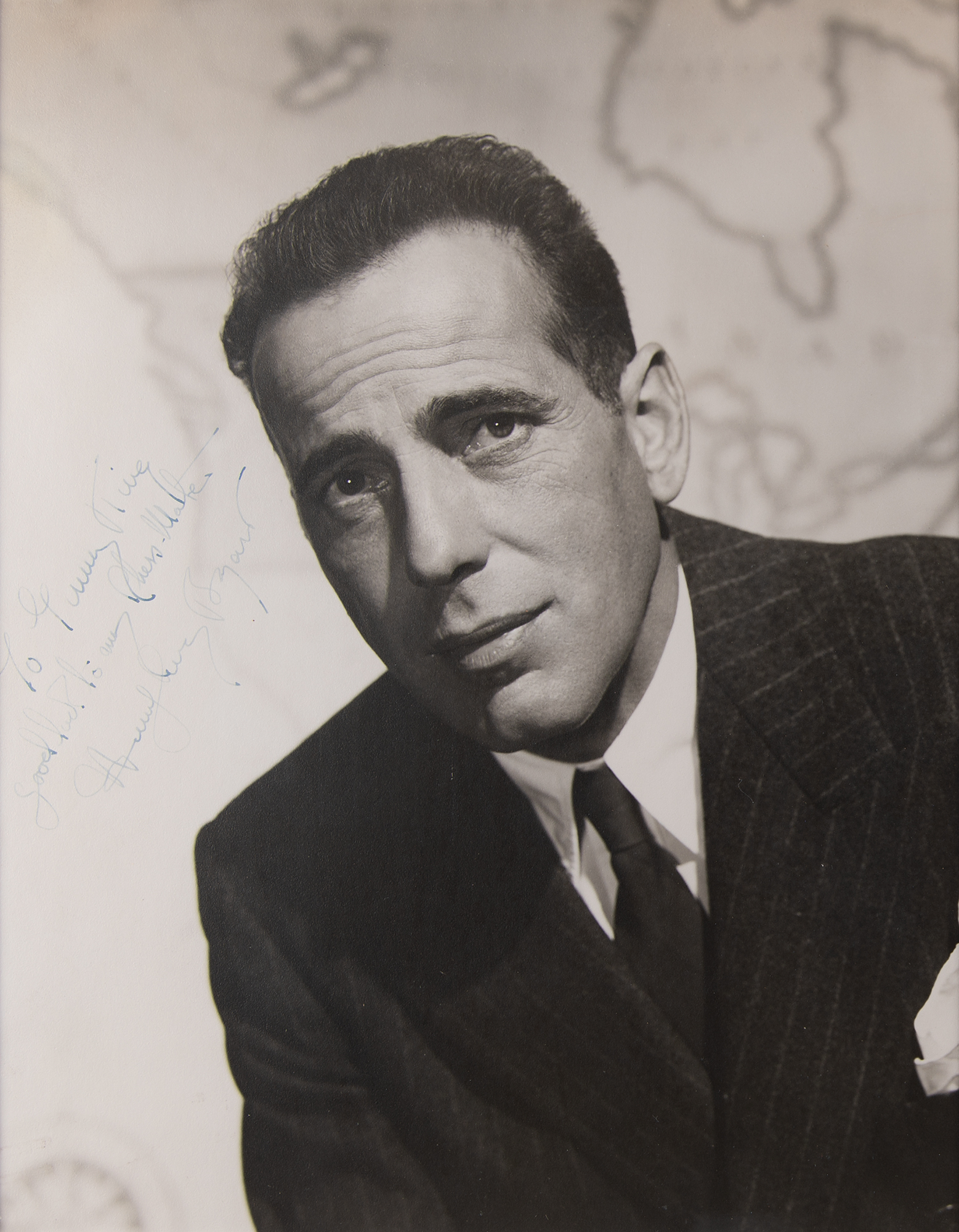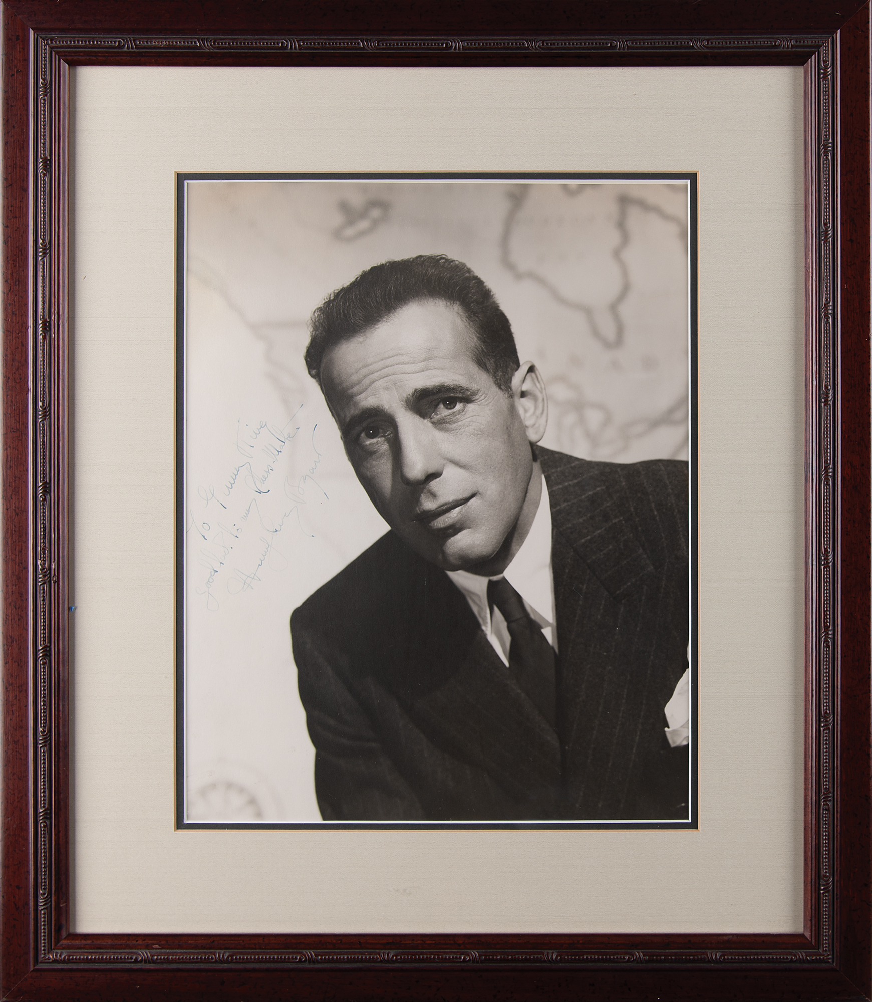 Superb vintage matte-finish 10.25 x 13.25 photo of Bogart in a handsome bust-length pose wearing a pinstripe suit against a large map background, signed and inscribed in fountain pen, "To Ginny King, good luck to my Chess Mate, Humphrey Bogart.” Double-matted and framed to an overall size of 18 x 21. In fine condition, with slight fading to the handwriting. Bogart is quite scarce and very desirable in signed photos of this size.
