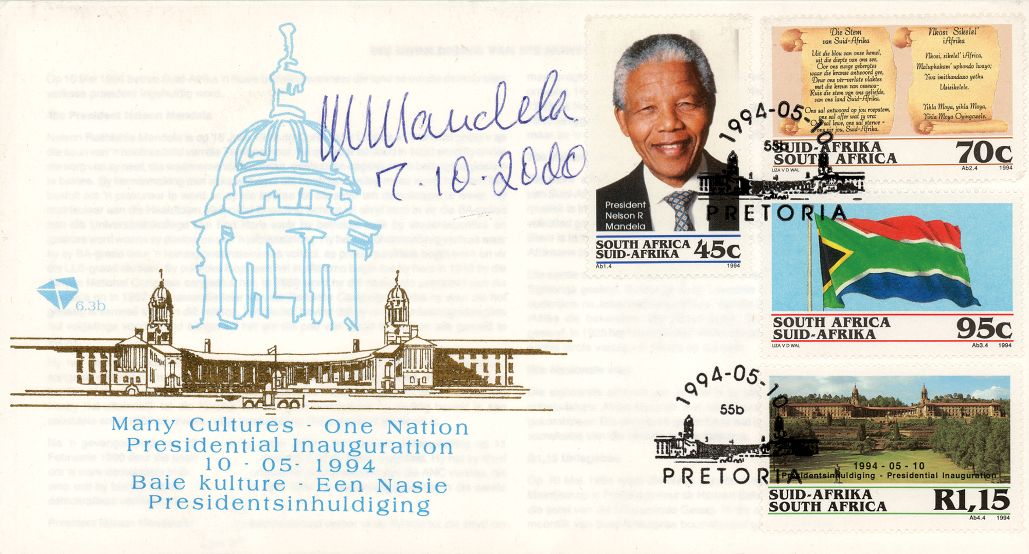 Commemorative cover with a cachet honoring the inauguration of Nelson Mandela on May 10, 1994, signed in blue ballpoint, "N. Mandela, 7-10-2000." In very fine condition.