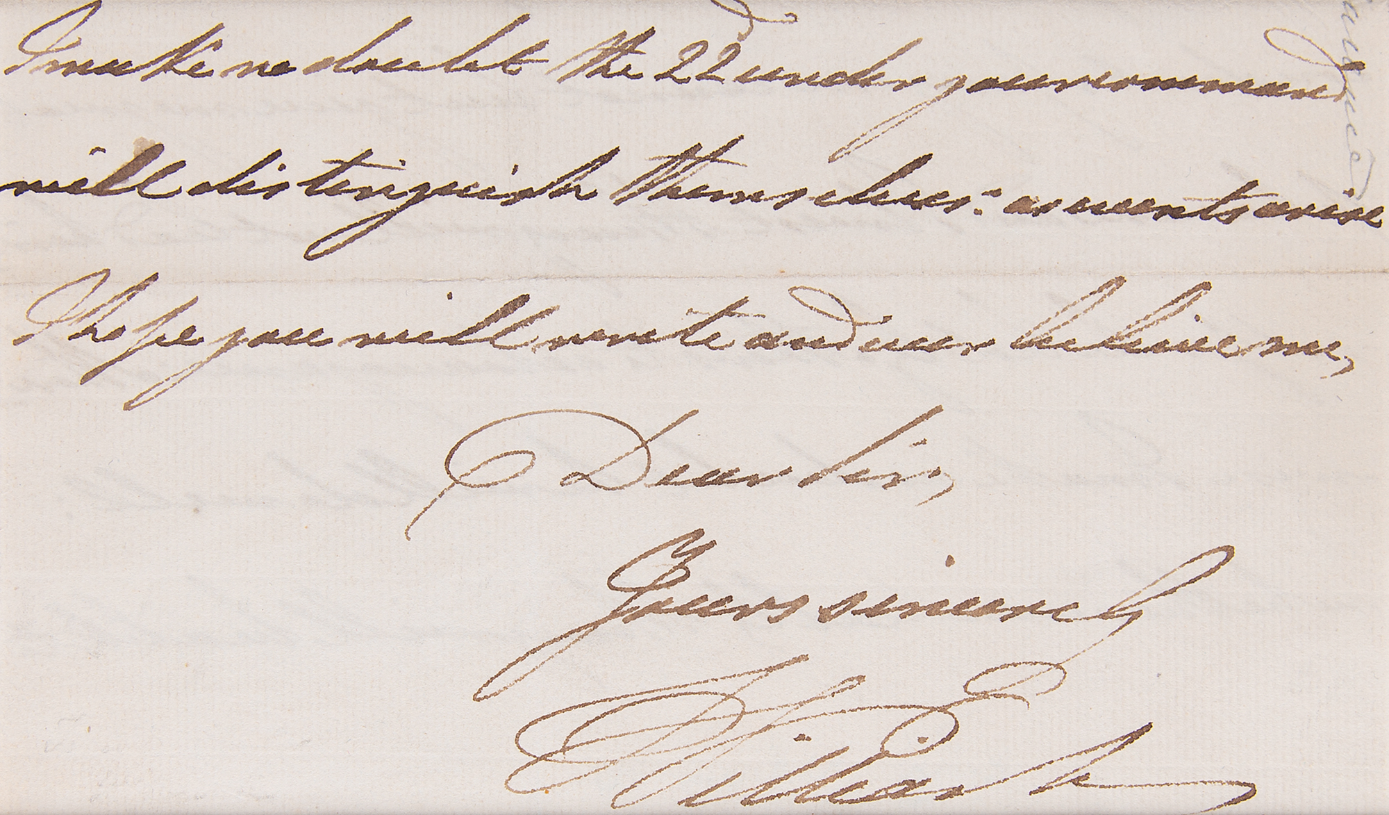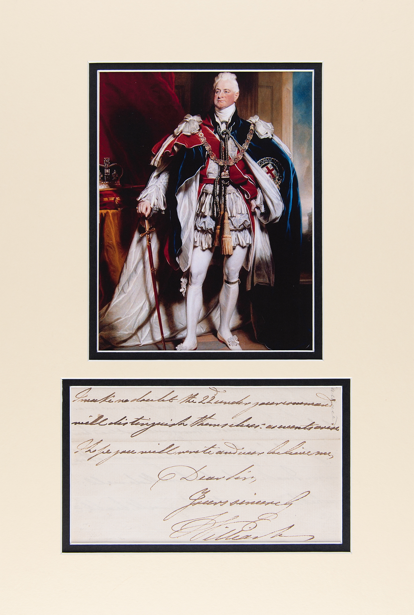 King of Great Britain and Ireland (1765-1837) from 1830 to 1837, he earned the sobriquet 'Sailor King' for his youthful service in the Royal Navy. Partial ALS signed “Dear Sir, Yours sincerely, William R,” one page, 7.25 x 4.25, no date. Three closing lines of a handwritten letter by King William IV, handsomely double-matted to an overall size of 11.25 x 17. In fine condition.