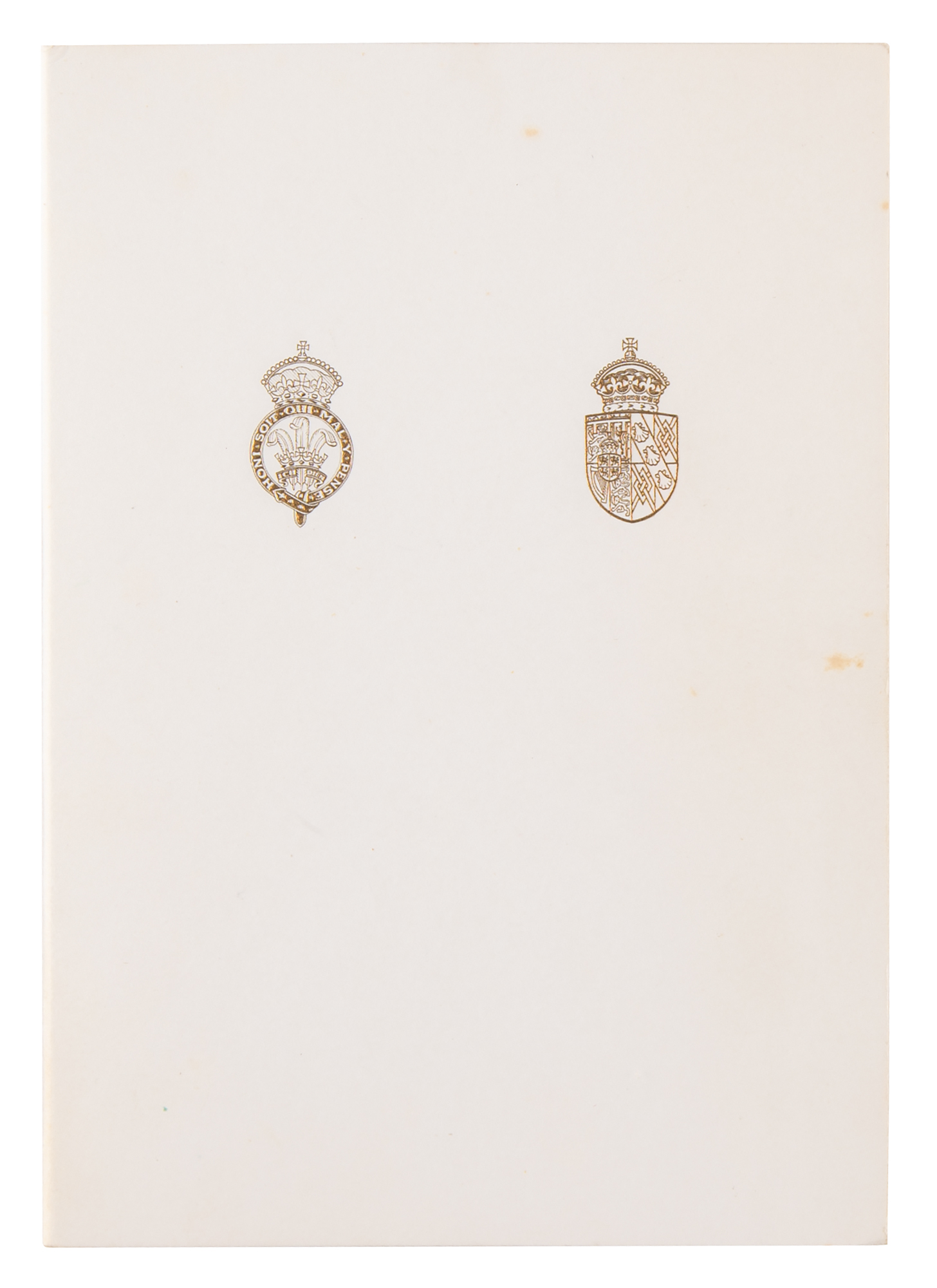 Appealing Christmas card from 1985, embossed on the front with the Prince of Wales’s feathers and Order of the Garter motto and the Spencer family arms, measuring 10.25 x 7.25 open, featuring an affixed color portrait of the royal family with Prince Harry and Prince William riding a pony, signed and inscribed inside in fountain pen, "Mrs. Daniels—from Charles and" and "Diana." In fine condition, with a few small, trivial stains.