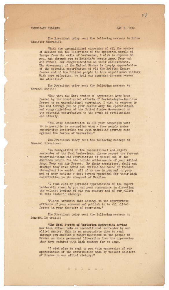 Original mimeographed White House press release, one page, 8 x 14, documenting the messages sent by President Harry S. Truman to Allied leaders on V-E Day, May 8, 1945. The document provides the text of messages sent by Truman to Winston S. Churchill. Joseph Stalin, Dwight D. Eisenhower, and Charles de Gaulle. In part: "The President today sent the following message to Prime Minister Churchill: 'With the unconditional surrender of all the armies of Nazidom and the liberation of the oppressed people of Europe from the evils of barbarism, I wish to express to you, and through you to Britain's heroic Army, Navy and Air Forces, our congratulations on their achievements...To Marshal Stalin: 'Now that the Nazi armies of aggression have been forced by the coordinated efforts of Soviet-Anglo-American forces to an unconditional surrender, I wish to express to you and through you to your heroic Army the appreciation and congratulations of the United States Government on its splendid contribution to the cause of civilization and liberty...To General Eisenhower: 'In recognition of the unconditional and abject surrender of the Nazi barbarians, please accept the fervent congratulations and appreciation of myself and of the American people for the heroic achievements of your Allied Army, Navy and Air Forces. By their sacrifices, skill and courage they have saved and exalted the cause of freedom throughout the world...To General De Gaulle: 'The Nazi forces of barbarian aggression having now been driven into an unconditional surrender by our allied armies, this is an appropriate time to send through you America's congratulations to the people of France on their permanent liberation from the oppression they have endured with high courage for so long." In fine condition, with toning to the top, and a slightly rough left edge.