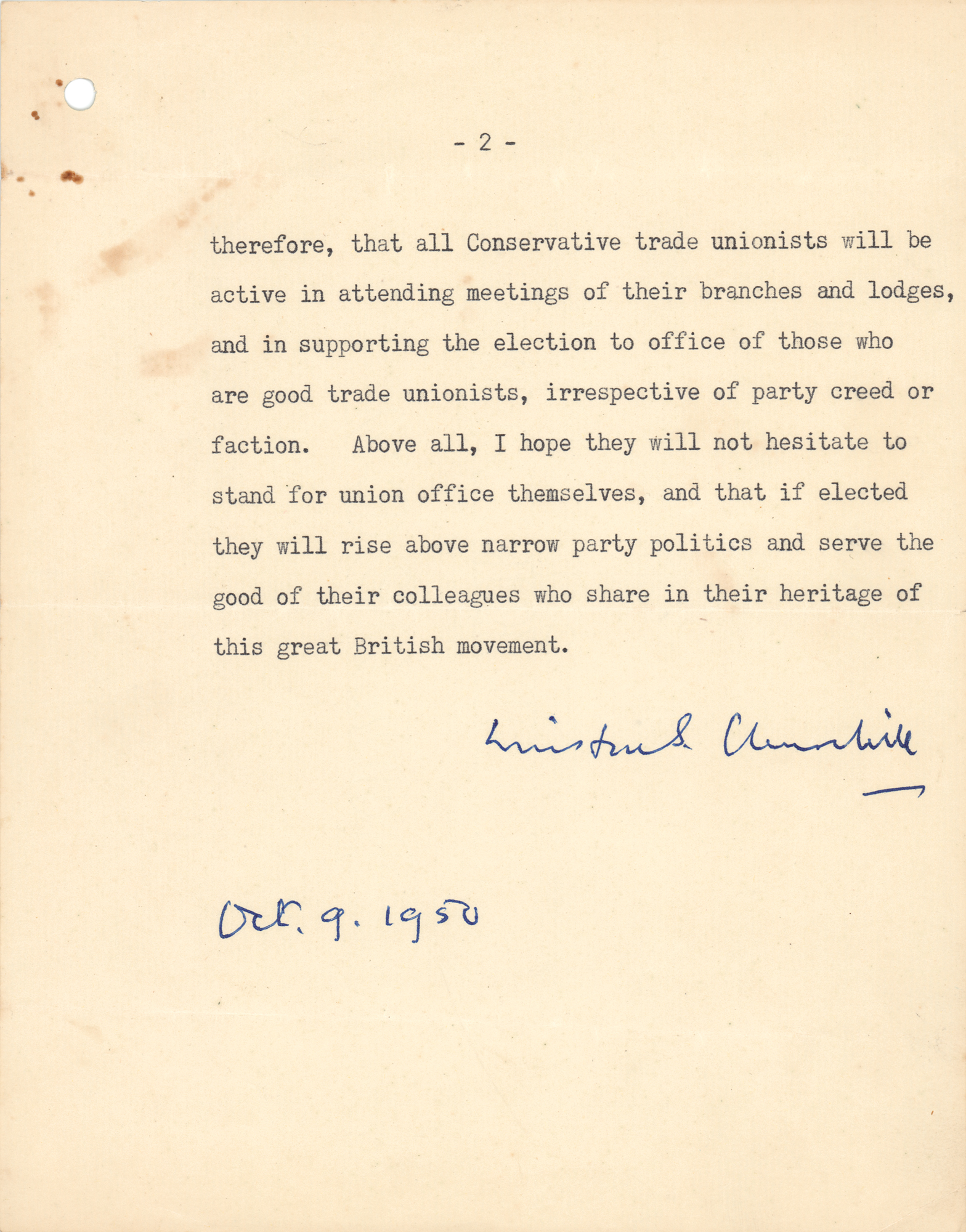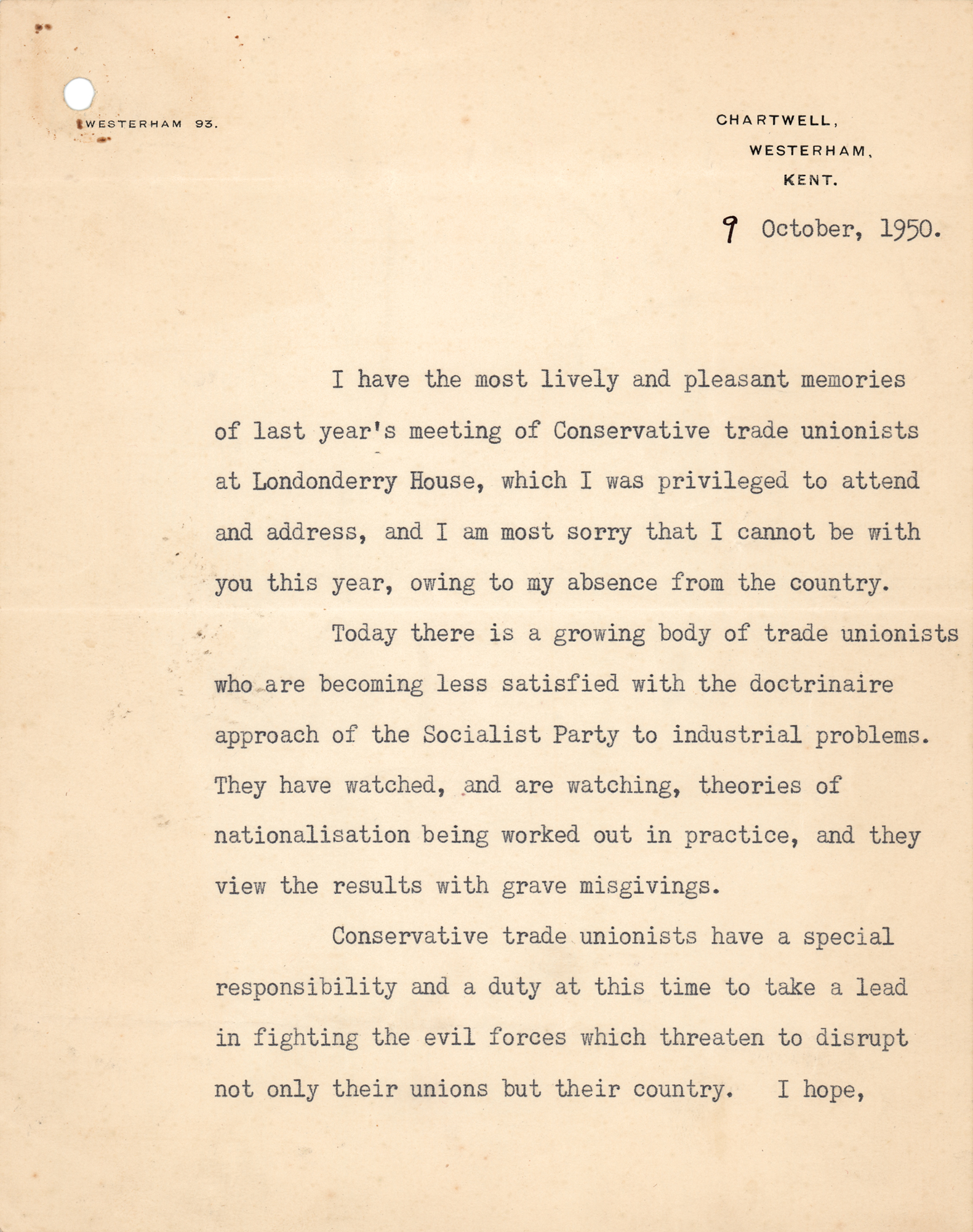 TLS signed “Winston S. Churchill,” two pages, 7.5 x 9.5, Chartwell letterhead, October 9, 1950. Letter concerning trade unions, in full: "I have the most lively and pleasant memories of last year's meeting of Conservative trade unionists at Londonderry House, which I was privileged to attend and address, and I am most sorry that I cannot be with you this year, owing to my absence from the country.