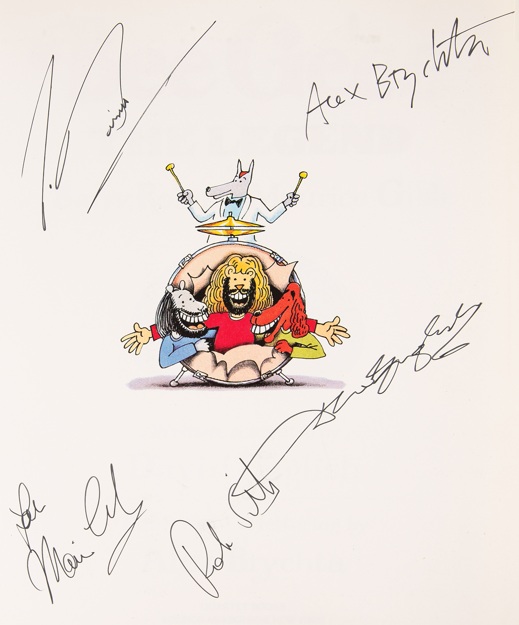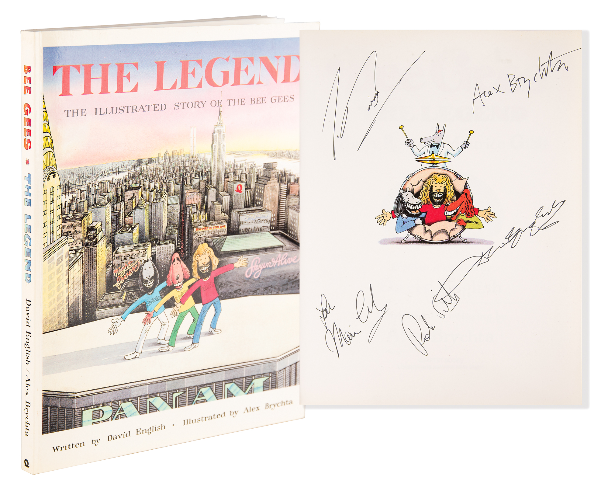 Signed book: The Legend: The Illustrated Story of the Bee Gees. First edition. London: Quartet Books, 1983. Softcover, 8.5 x 11, 160 pages. Signed on the opening page in black ink by Barry, Robin, and Maurice Gibb, and by the book's writer and illustrator, David English and Alex Brychta. In very fine condition.