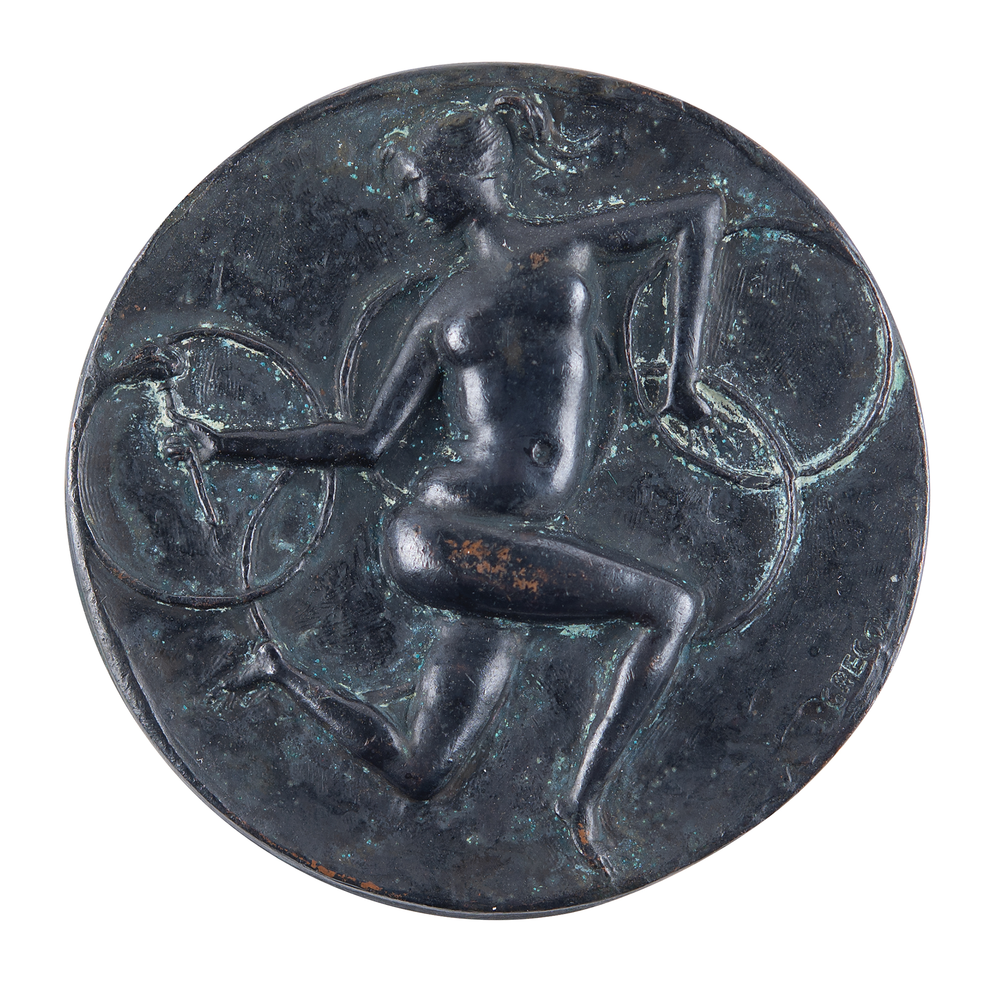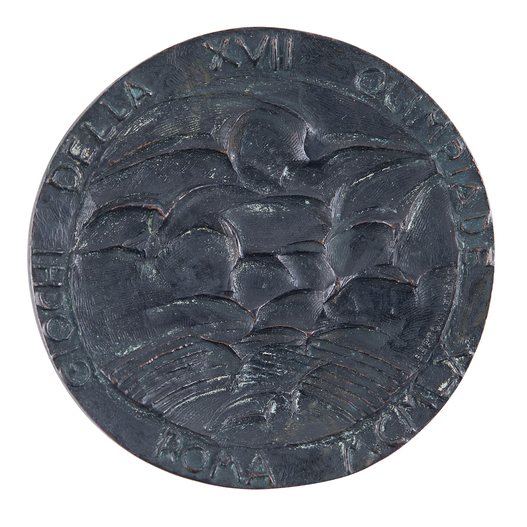 Participation medal issued for the Rome 1960 Summer Olympics. Bronze, 55 mm, 79 gm, by Emilio Greco. The front features a nude female torchbearer superimposed over Olympic rings; the reverse bears a convocation of eagles soaring high above the Olympic stadium, with raised Italian text encircling the edge. Some sections bear slight hints of verdigris patina, a common condition for these medals.