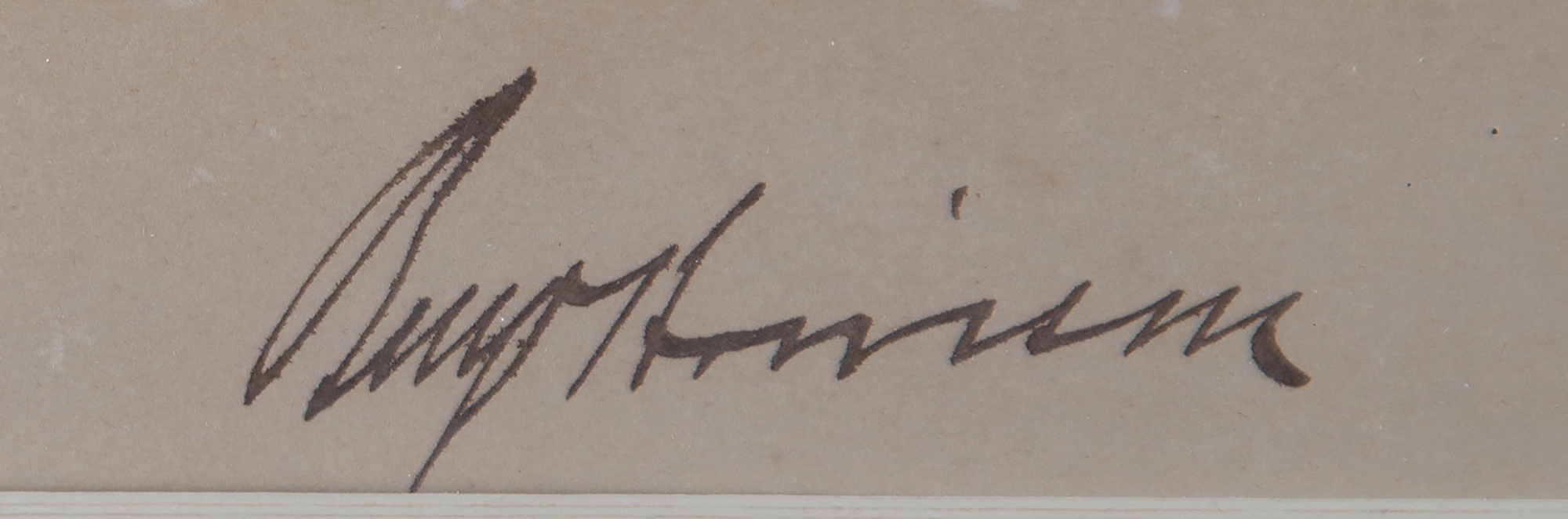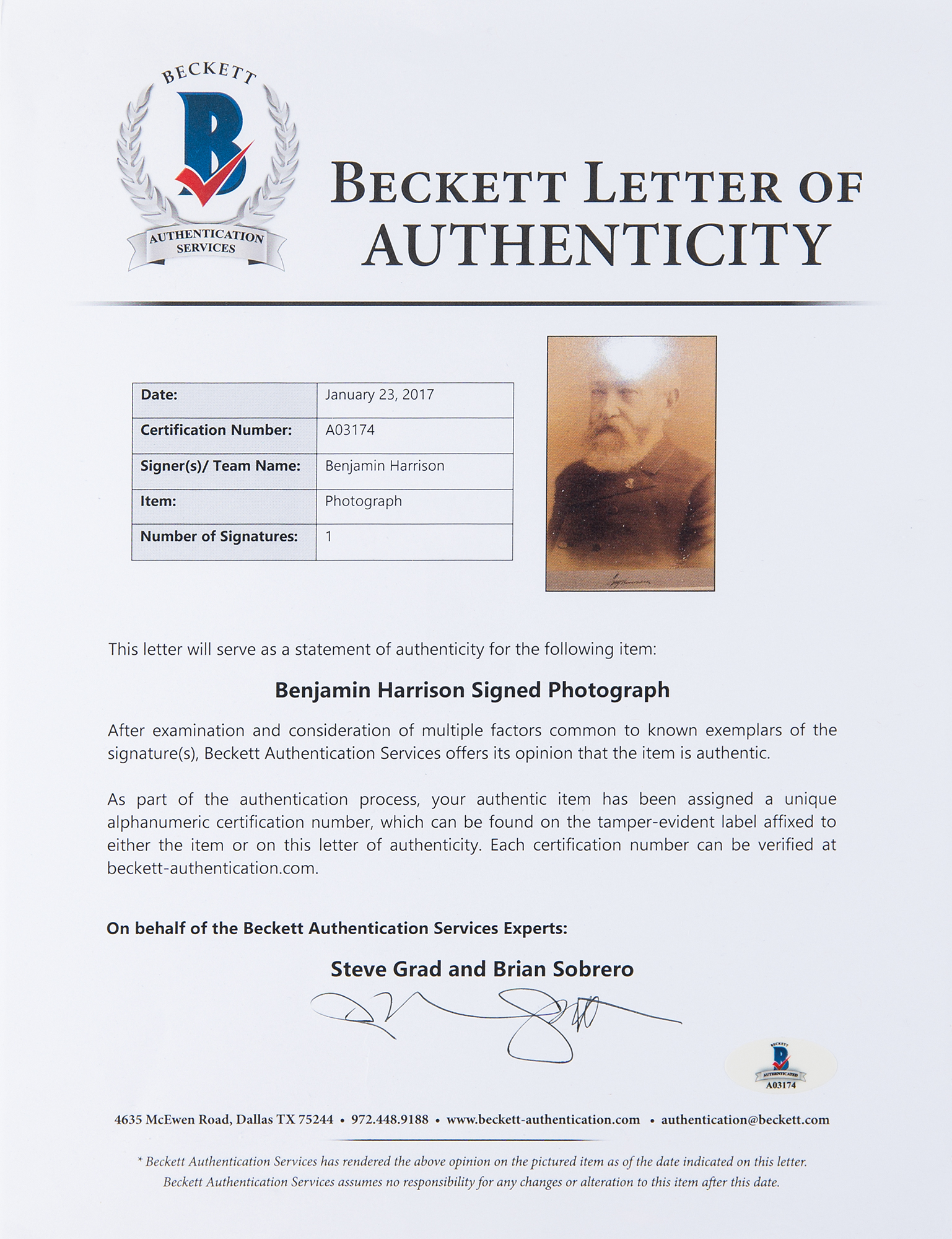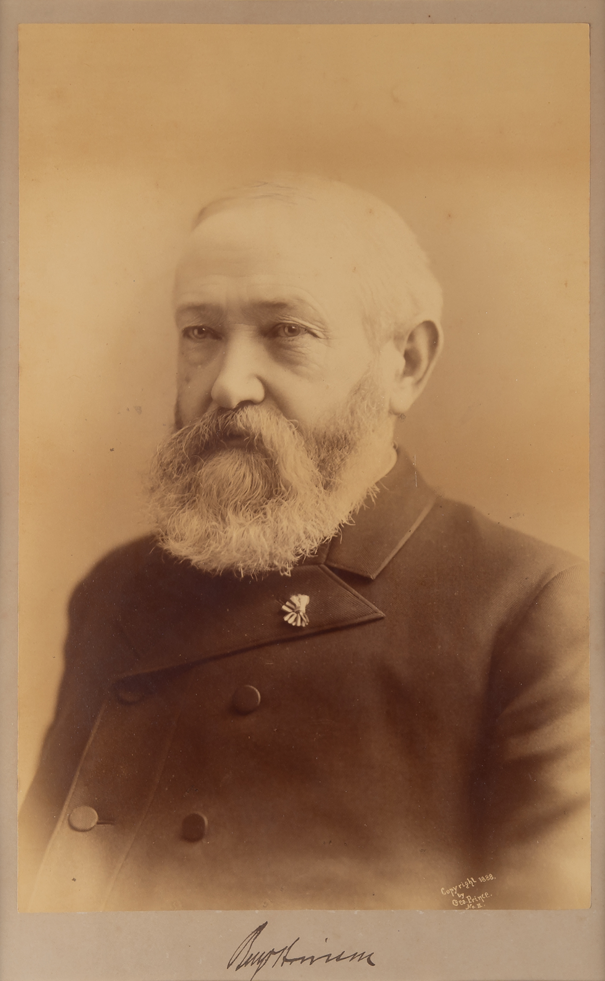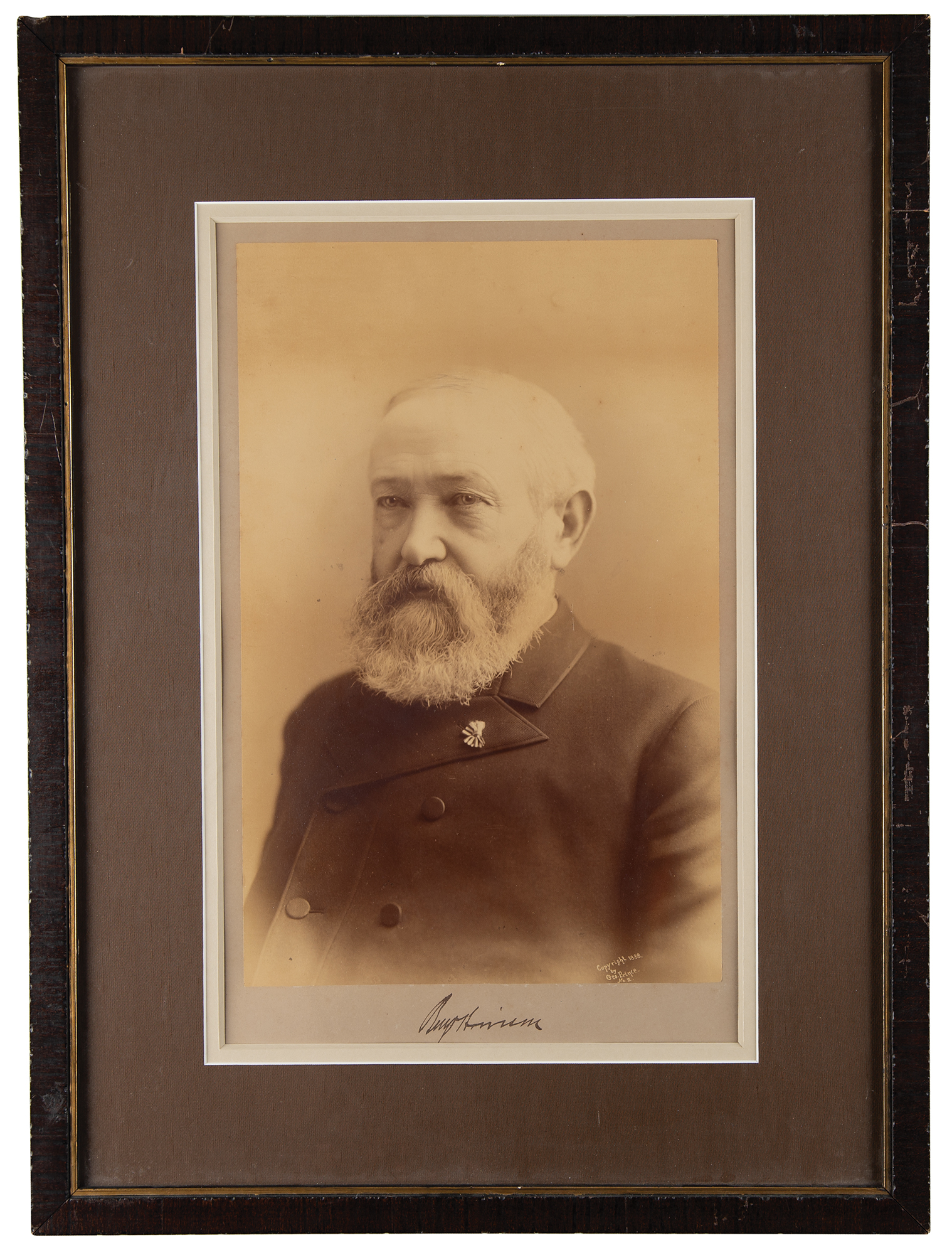 Huge sepia-tone 10 x 15.5 portrait of Harrison taken in 1888 by George Prince, affixed to its original 11 x 17.25 mount, signed on the mount in black ink as president-elect, "Benj. Harrison." Archivally double-cloth-matted and framed. In fine condition. Accompanied by a full letter of authenticity from Beckett Authentication Services. Three weeks after Harrison was elected president in November 1888, the Washington Post reported that local photographer George Prince, whose studio was on the corner of Pennsylvania Avenue and 11th Street, had gone to Indianapolis and 'made a large photograph of General Harrison.' A highly presentable presidential showpiece that is assuredly one of the largest signed portraits of Harrison extant.