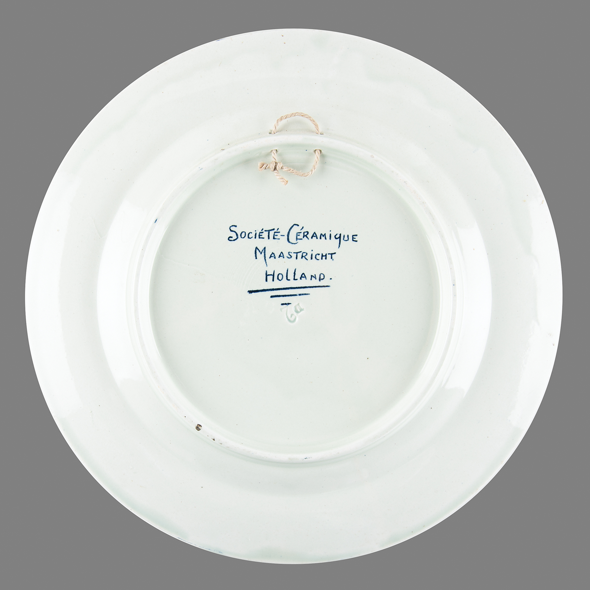 Porcelain plate by the Societe Ceramique of Maastricht, Holland, 10″ in diameter, with the bottom featuring the coat of arms of Amsterdam with laurel wreath and text, “IXe Olympiade, Amsterdam 1928,” and the border containing artistic images of six Olympic events: soccer, rowing, running, swimming, cycling, and tennis.