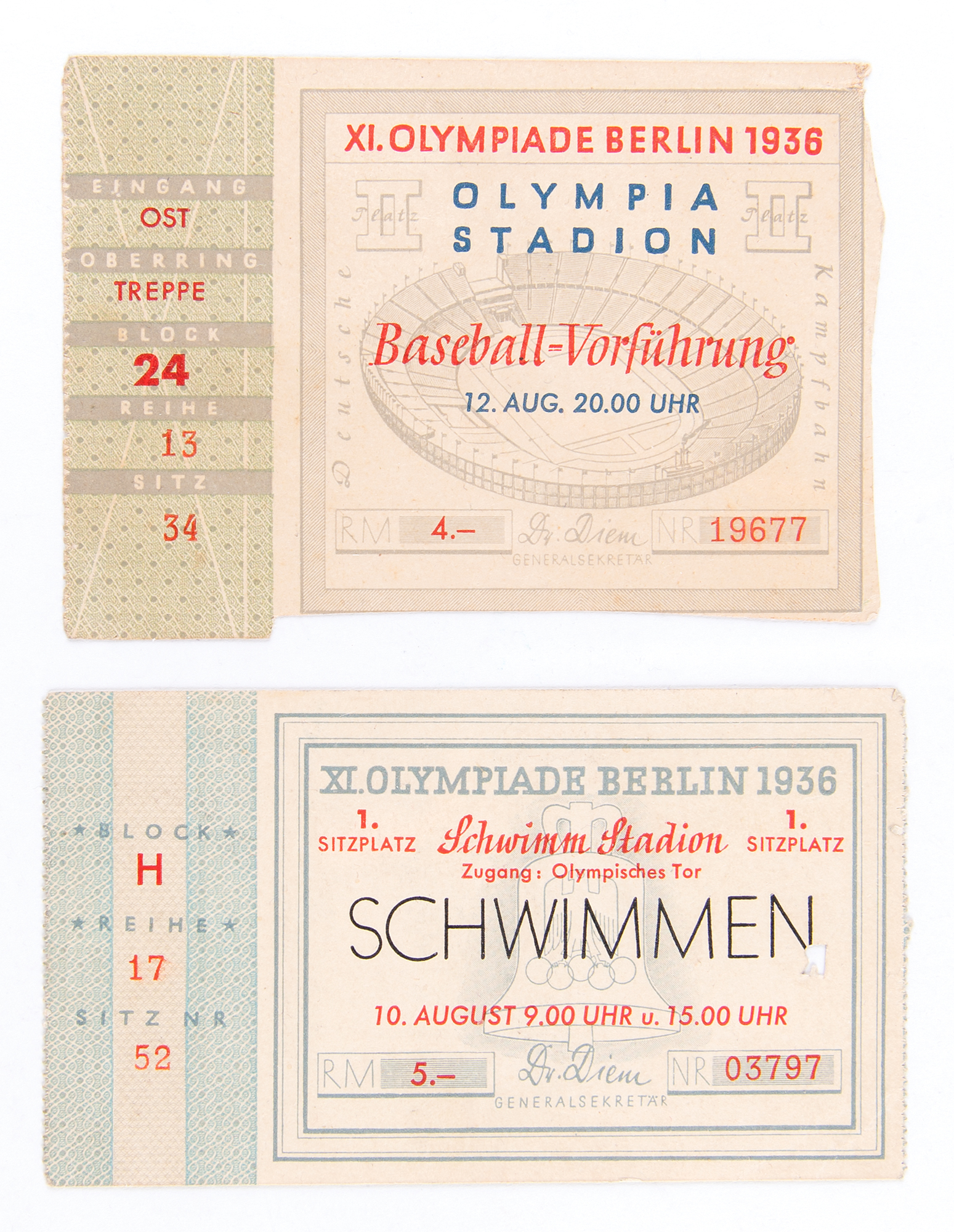 Two ticket stubs from the historic Berlin 1936 Summer Games, 4 x 2.75 x 4.5 x 2.25, issued for a ‘Schwimmen [Swimming]” event on August 10th at the Schwimm Stadium, and a “Baseball-Vorführung [Baseball Demonstration]” on August 12th at the Olympic Stadium. In overall fine condition.