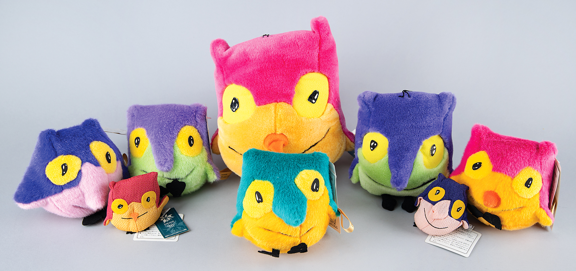Adorable small collection of eight ‘stuffed animal’ souvenirs from the Nagano 1998 Winter Olympics, featuring the snowy owls Sukki, Nokki, Lekki, and Tsukki, also known as the Snowlets, which represent respectively fire (Sukki), air (Nokki), earth (Lekki) and water (Tsukki), and together they represent the four major islands of Japan. The collection contains two small ‘bean bag-style’ versions (3″ x 3.5″ x 2″) of Sukki and Tsukki, four medium-sized plush versions of each snowlet (5″ x 5″ x 4″), a large-sized plush version of Lekki (6″ x 6″ x 5″), and an extra-large plush version of Tsukki (7.5″ x 8.5″ x 7″). Each item retains its original Nagano Olympics mascot tag. In overall fine condition.