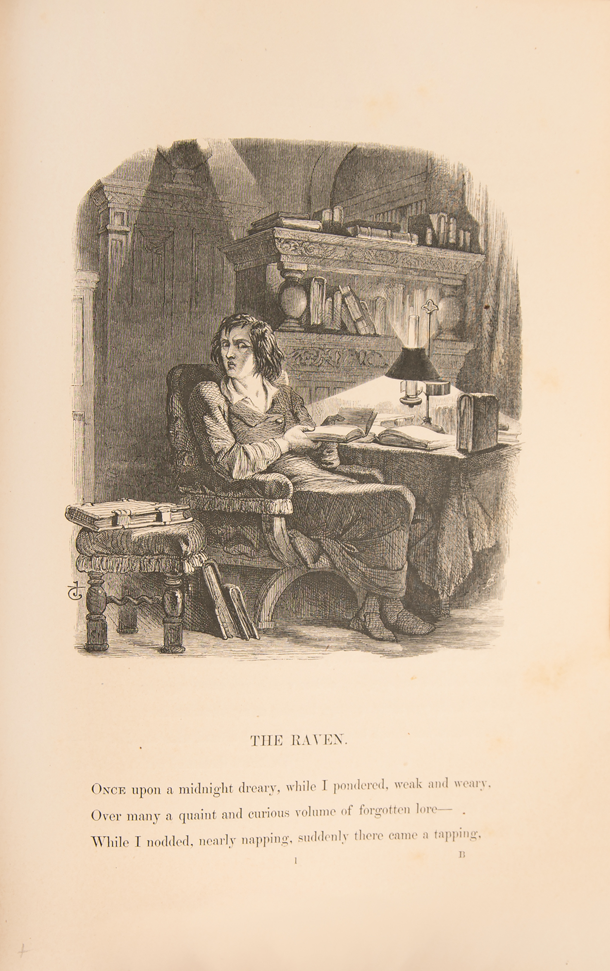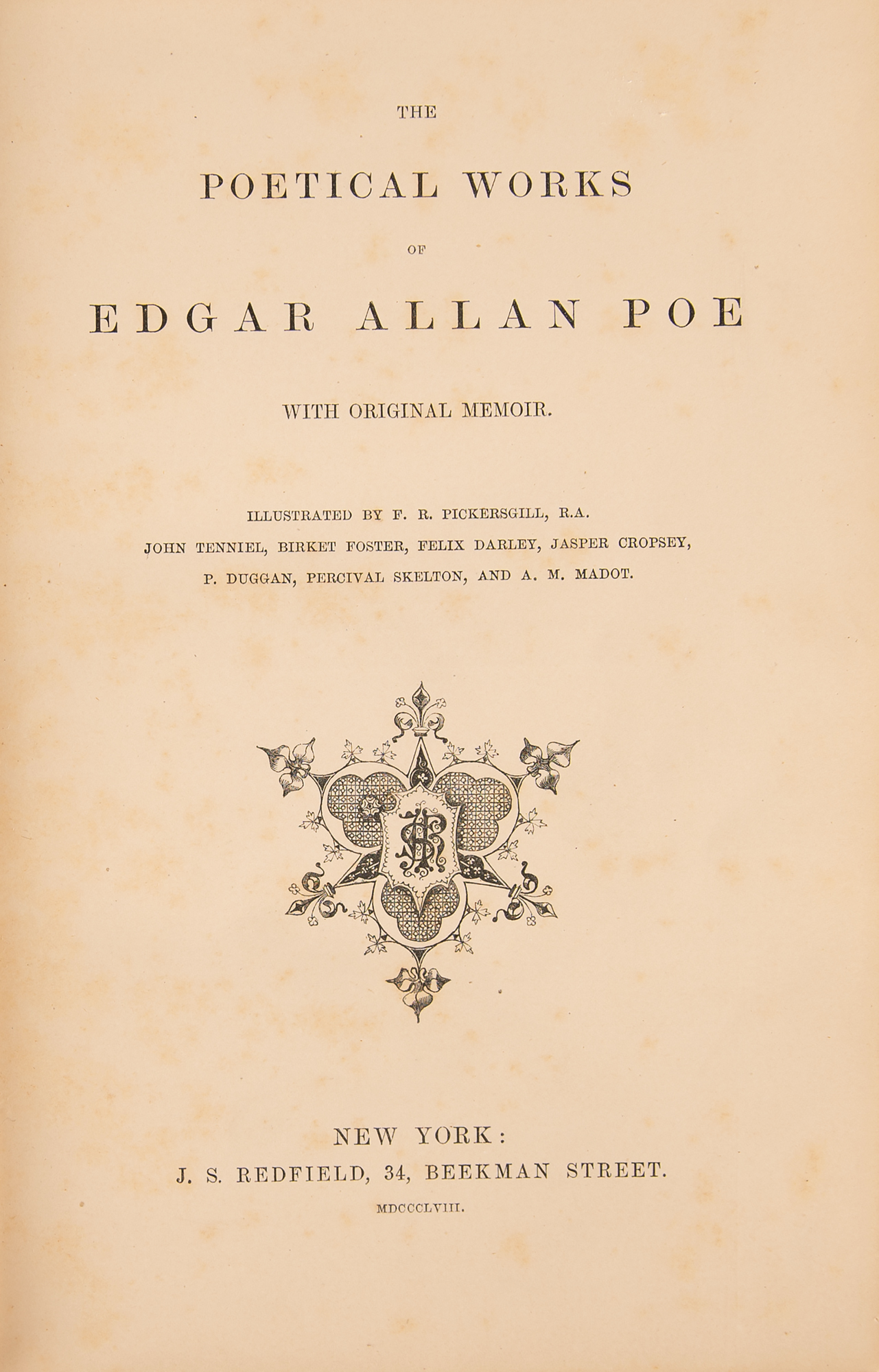 Handsome posthumous edition of Poe's selected poems: The Poetical Works of Edgar Allan Poe, with Original Memoir, illustrated by F.R. Pickersgill, John Tenniel, Birket Foster, et al. NY: J. S. Redfield, 1858. Hardcover bound in full green morocco, all edge gilt, with spine in six compartments, 6.5 x 8.75, 247 pages. Book condition: VG-/None, with moderate edgewear (heaviest to spine and corners), bookplate affixed to front pastedown, and light foxing to textblock.