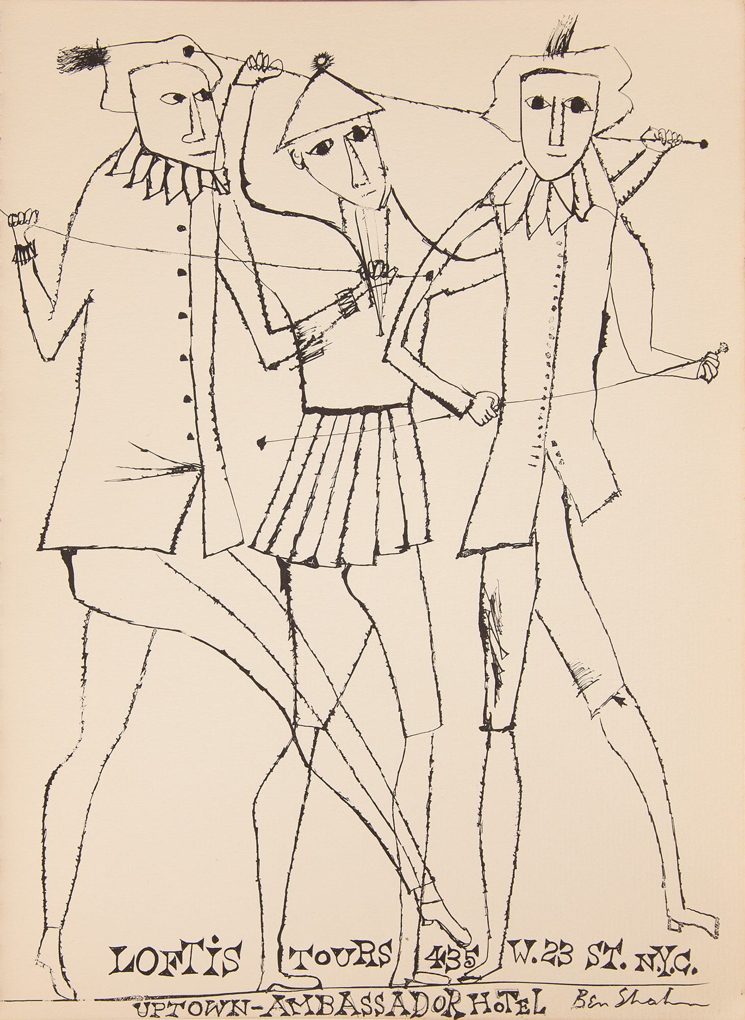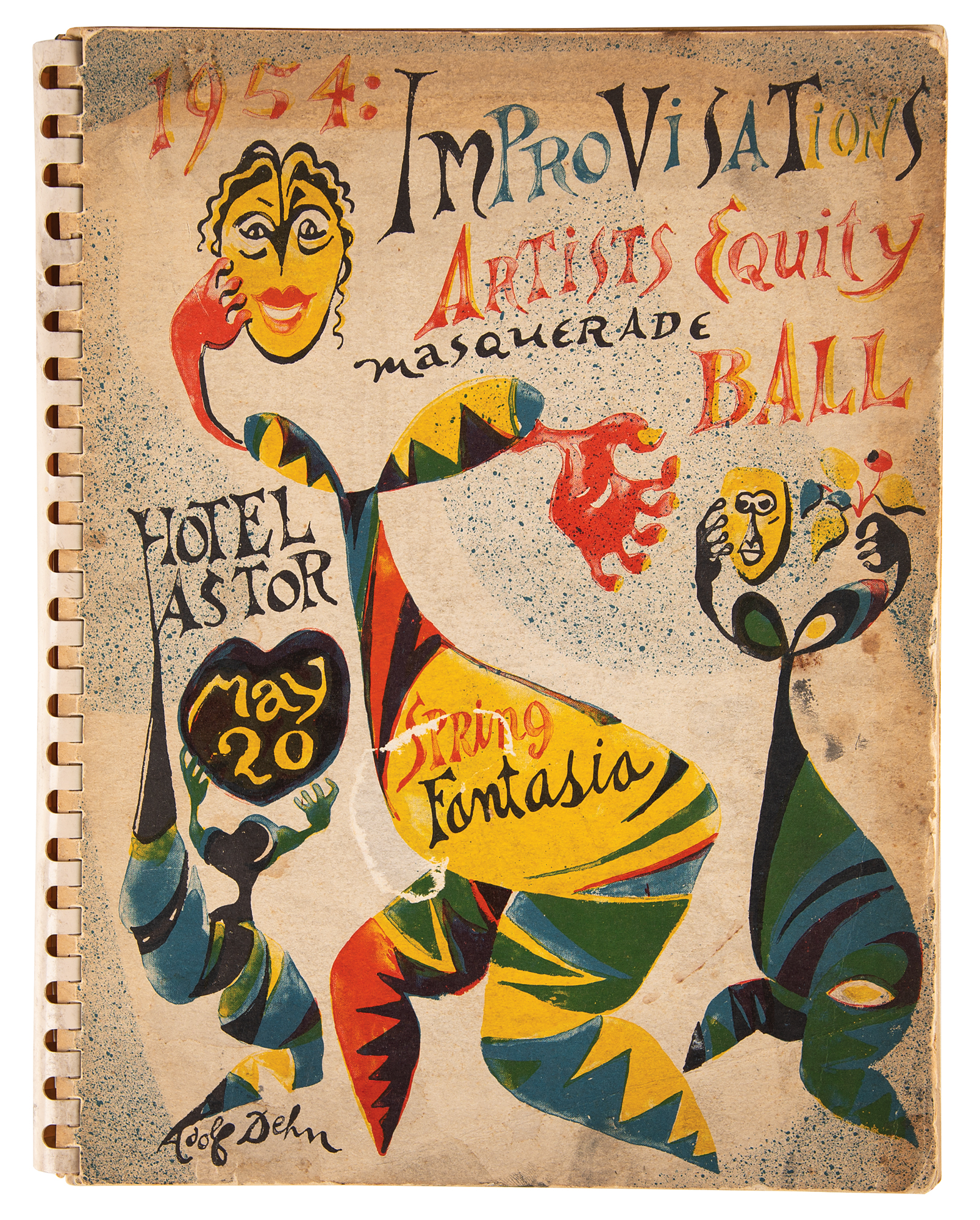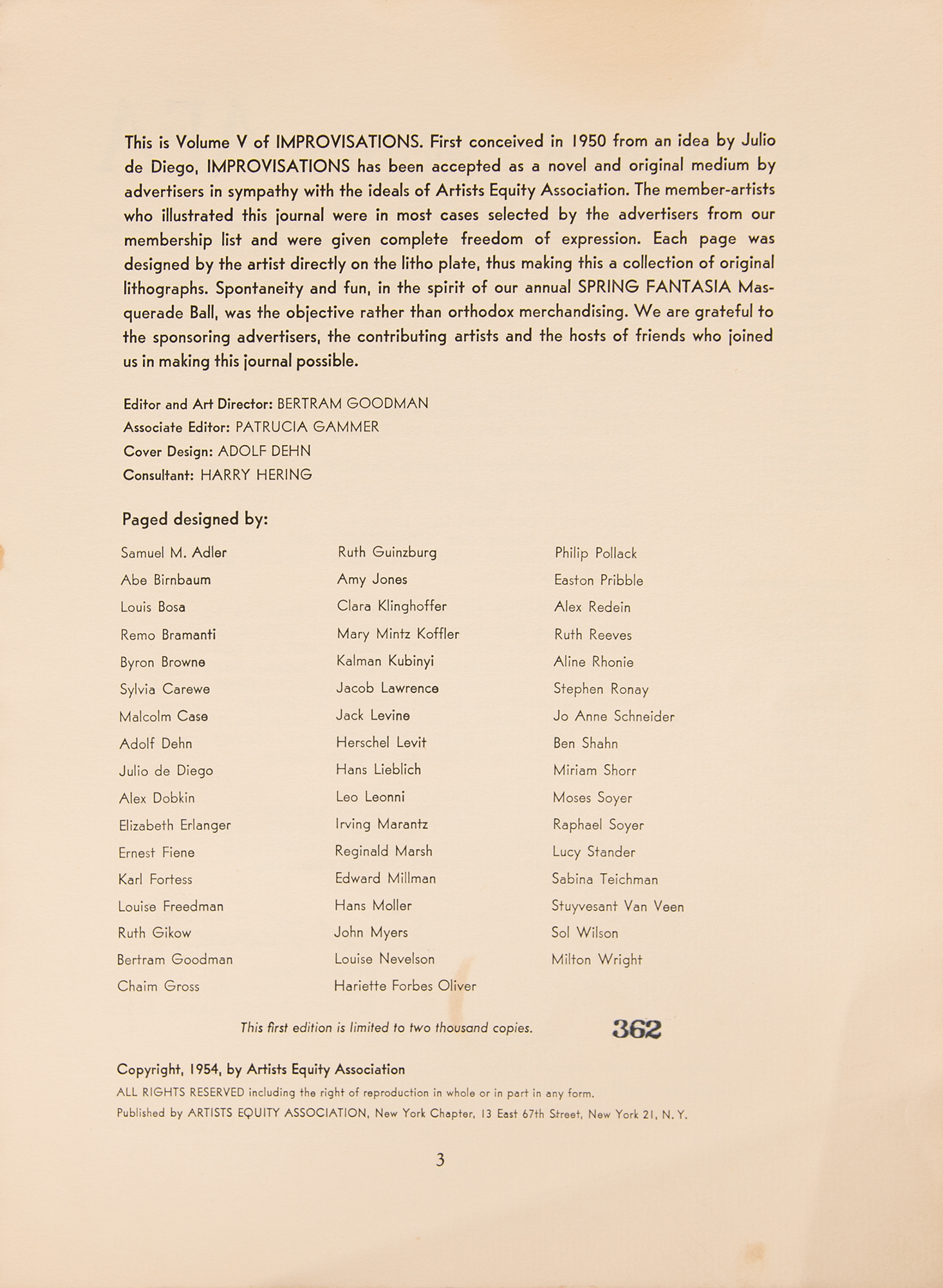 Spiral-bound limited edition program for the annual Artists Equity Masquerade Ball, entitled "1954: Improvisations," numbered 362/2000, 9.75 x 12, containing works by 49 artists including Julio de Diego, Chaim Gross, Bertram Goodman, Jacob Lawrence, Jack Levine, Ben Shahn, Louise Nevelson, and Raphael Soyer. From the preface: "This is Volume 5 of Improvisations. First conceived in 1950 from an idea by Julio de Diego, Improvisations has been accepted as a novel and original medium by advertisers in sympathy with the ideals of Artists Equity Association. The member-artists who illustrated the journal were selected by the advertisers and were given complete freedom of expression. Each page was designed by the artist directly on the litho plate, thus making this a collection of original lithographs. Spontaneity and fun, in the spirit of our annual Spring Fantasia Masquerade Ball, was the objective rather than orthodox merchandising." In very good condition, with moderate wear to the covers (including some scuffing and staining), and ink smudges to a few of the introductory pages.