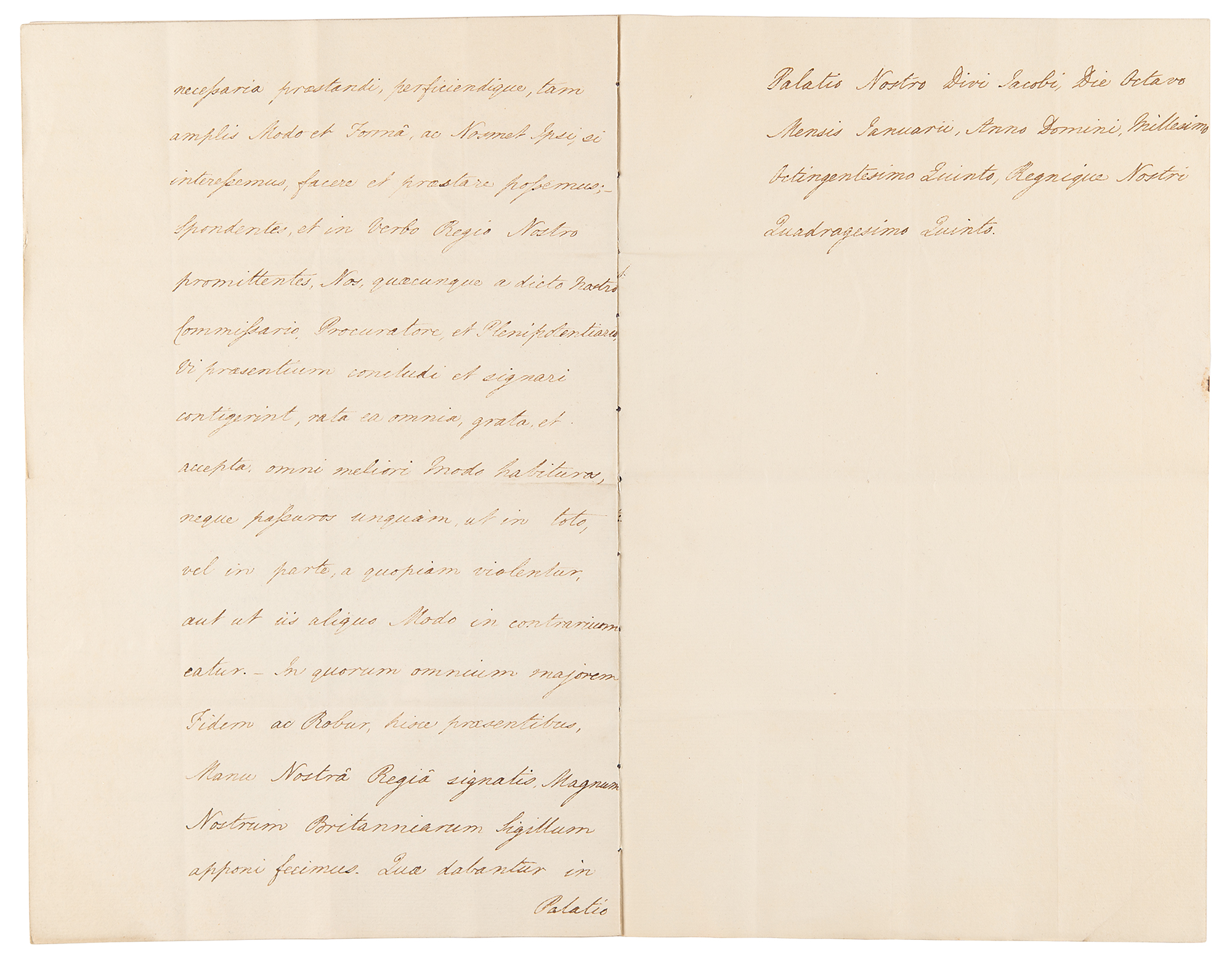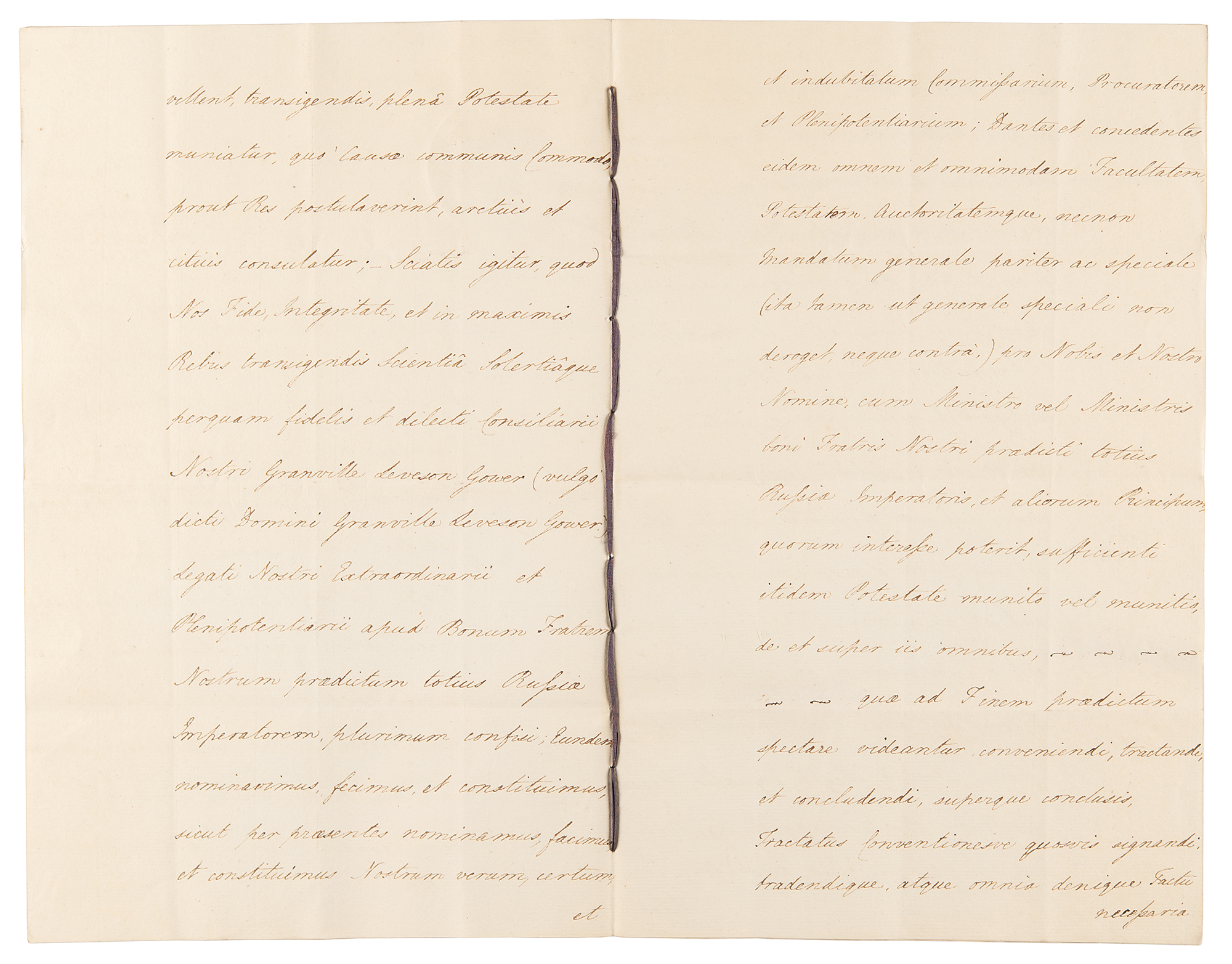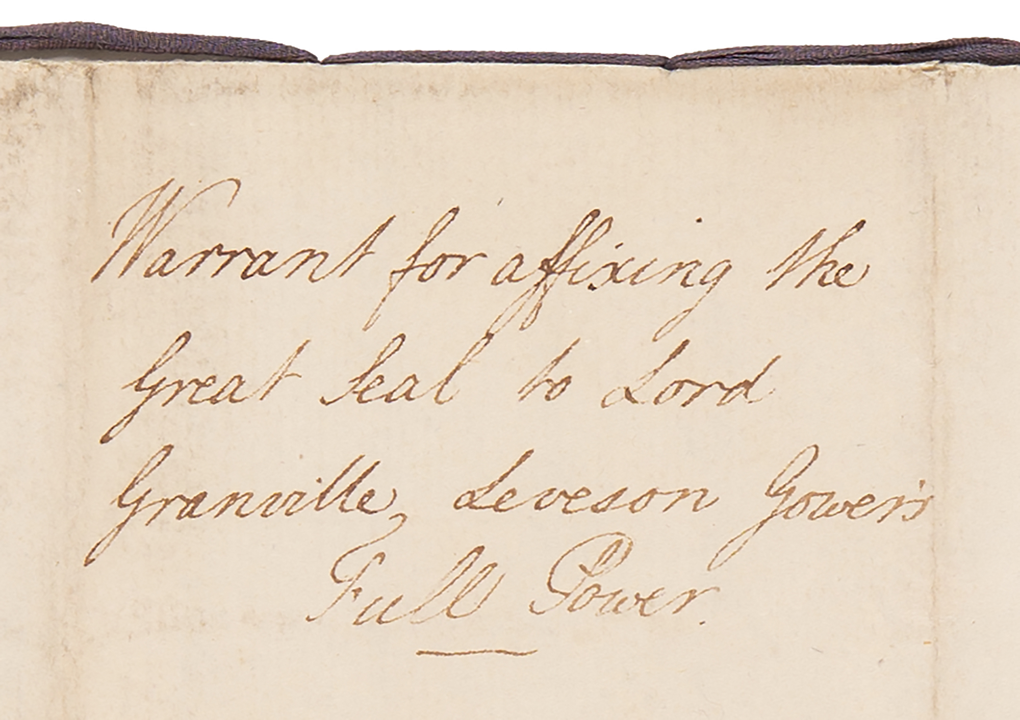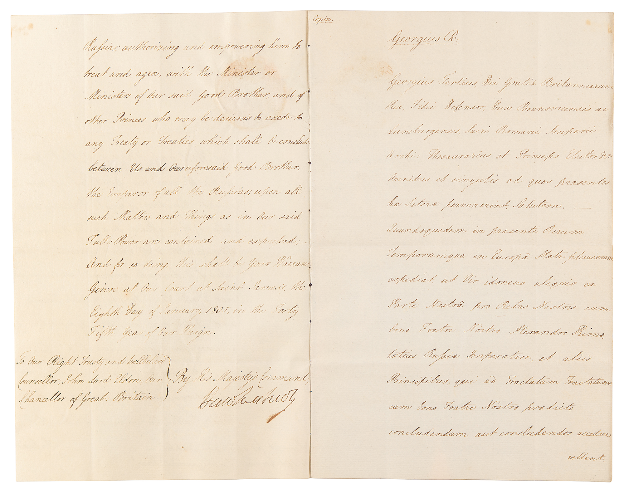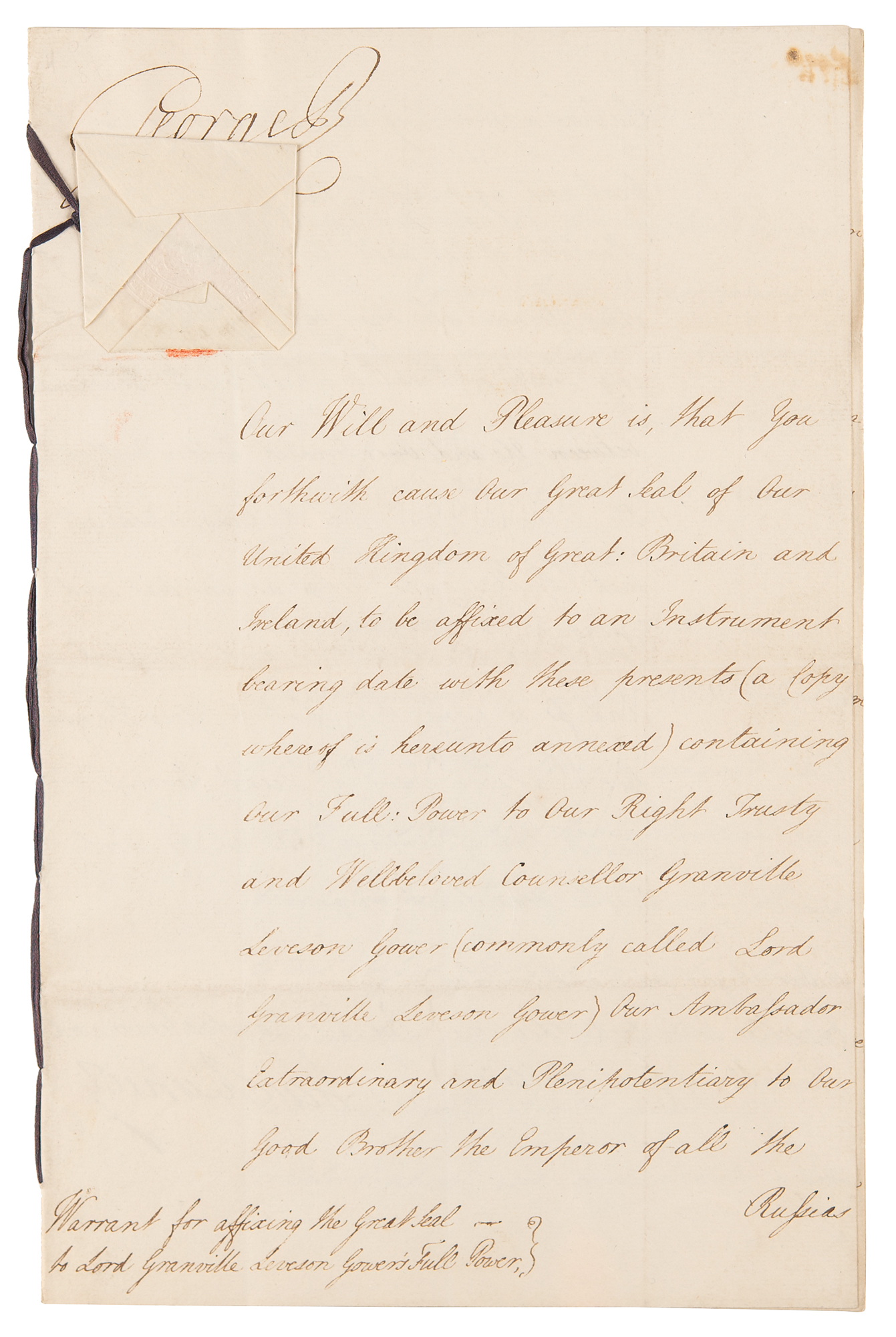 Manuscript DS, signed “George R,” one page both sides, 7.75 x 12, January 8, 1805. Document addressed John Lord Eldon, Lord High Chancellor of Great Britain, directing him to affix the Great Seal to an instrument "containing our Full Power to Our Right Trusty and Wellbeloved Counsellor Granville Leveson Gower...Our Ambassador Extraordinary and Plenipotentiary to Our Good Brother the Emperor of all the Russias; authorizing and empowering him to treat and agree, with the Minister or Ministers of our said good Brother, and of other Princes who may be desirous to accede to any Treaty or Treaties which shall be concluded between Us and Our aforesaid Good Brother, the Emperor of all the Russias." Signed at the head by King George III, and countersigned at the conclusion by Home Secretary Robert Jenkinson, Lord Hawkesbury. A five-page true copy of the instrument, penned in Latin, is annexed to the document, bound together with a purple silk ribbon. The white paper seal, affixed over part of King George III's signature, remains intact. In fine condition. A handsome and charming diplomat, Granville Leveson-Gower concluded a short-lived treaty with Russia against Napoleon, the first of many diplomatic successes.