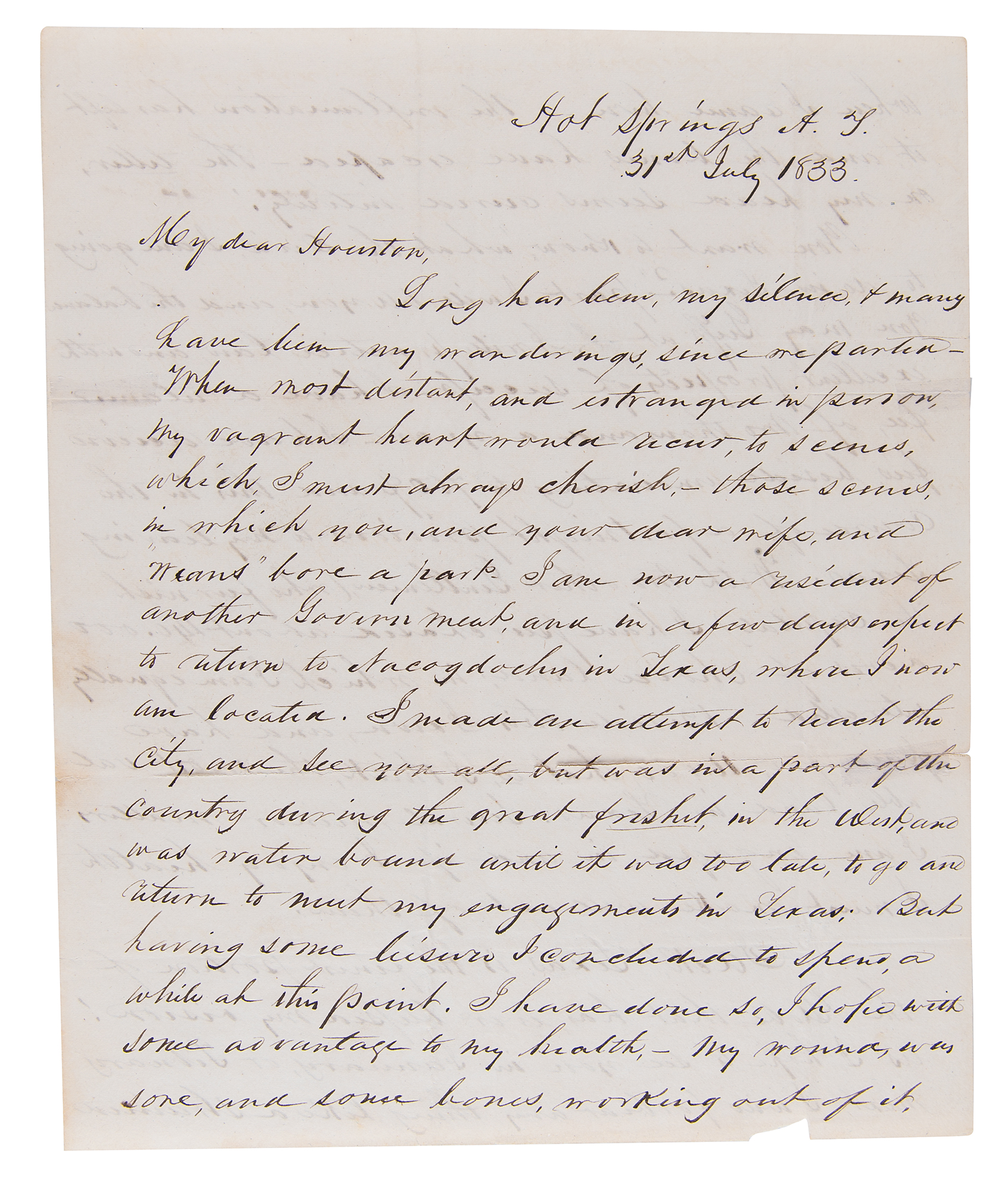 ALS signed “Sam Houston,” three pages on two adjoining sheets (split at the hinge), 8 x 9.75, July 3, 1833. Handwritten letter to "My dear Houston," his brother John, in part: "Long has been, my silence, & many have been my wanderings, since we parted—When most distant, and estranged in person, my vagrant heart would recur, to scenes which I must always cherish,—those scenes, in which you, and your dear wife, and 'Weans' bore a part. I am now a resident of another Government, and in a few days expect to return to Nacogdoches in Texas, where I now am located...