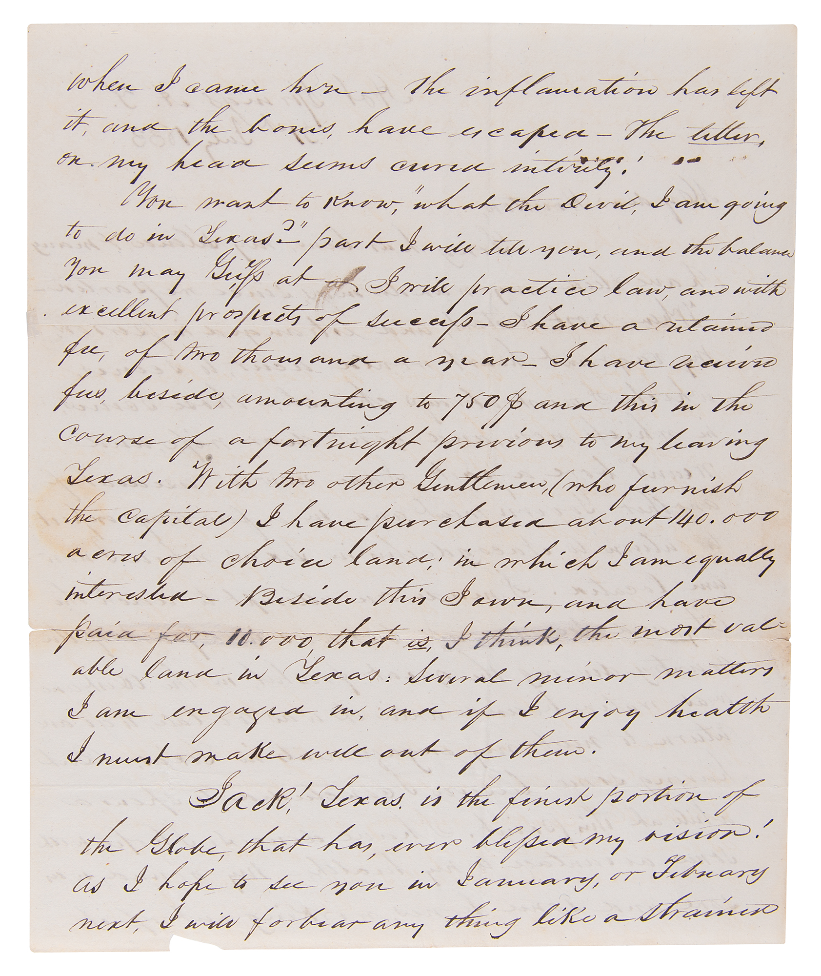 You want to know, 'what the Devil, I am going to do in Texas?'—part I will tell you, and the balance you may guess at. I will practice law, and with excellent prospects of success. I have a retained fee, of two thousand a year—I have received fees, besides, amounting to 750$ and this in the course of a fortnight previous to my leaving Texas. With two other Gentlemen, (who furnish the capital), I have purchased about 140,000 acres of choice land, in which I am equally interested. Beside this I own, and have paid for, 10,000, that is, I think, the most valuable land in Texas: Several minor matters I am engaged in, and if I enjoy health I must make well out of them.