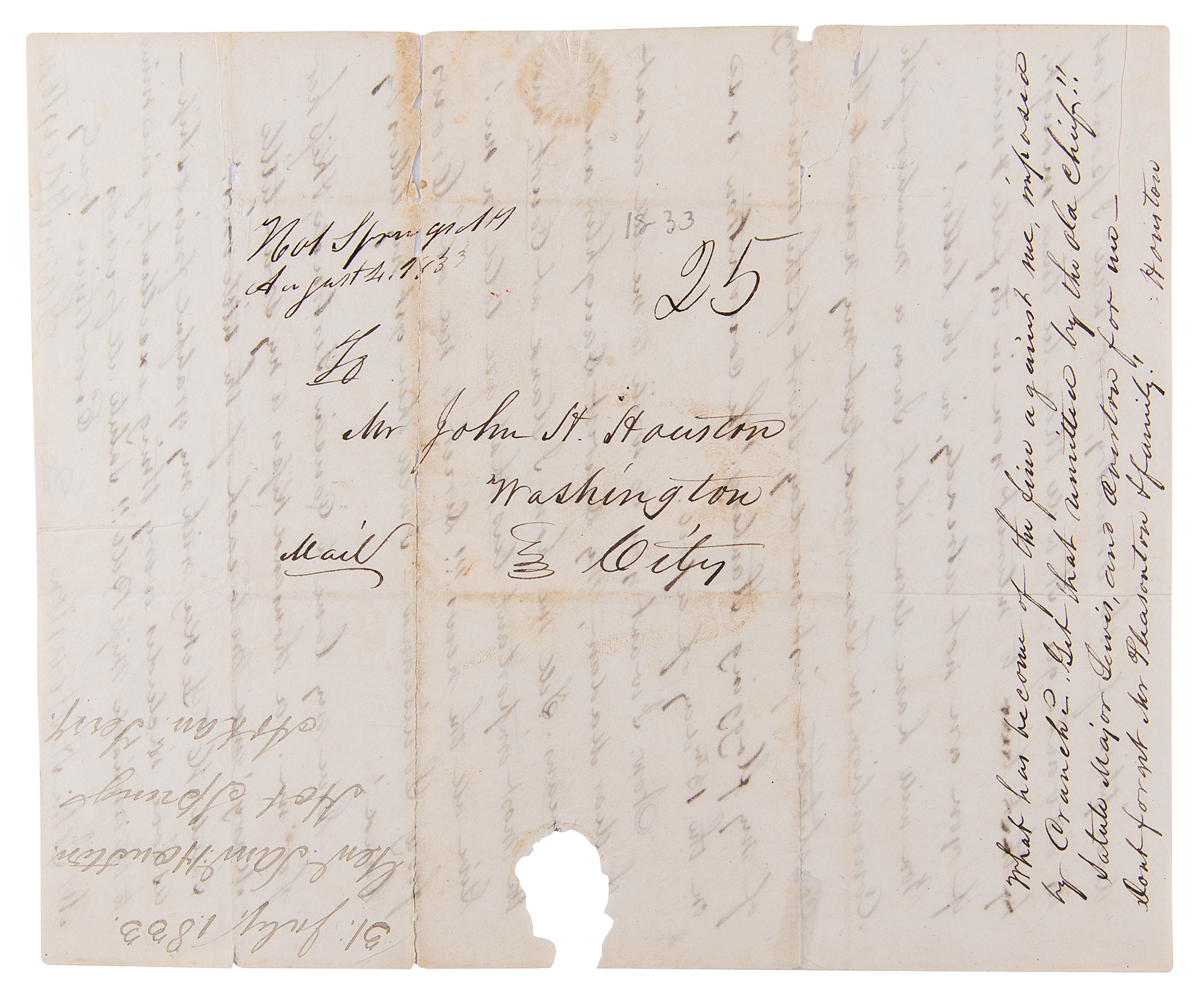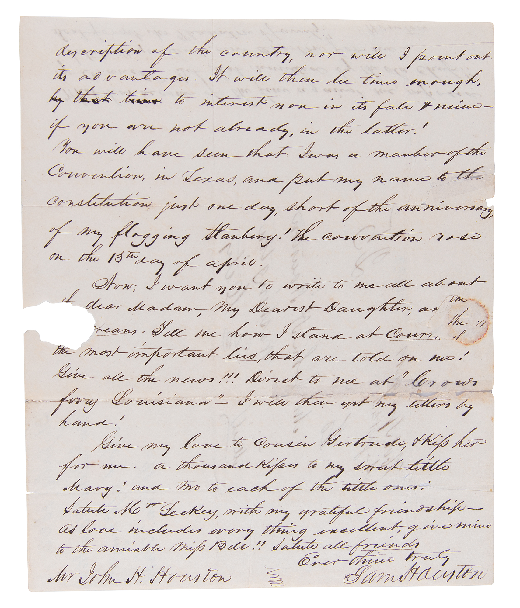 Jack! Texas is the finest portion of the Globe, that has, ever blessed my vision. As I hope to see you in January, or February next, I will forbear any thing like a strained description of the country, nor will I point out its advantages. It will then be time enough, to interest you in its fate & mine—if you are not already, in the latter! You will have seen that I was a member of the Convention, in Texas, and put my name to the constitution, just one day, short of the anniversary, of my flogging Stanberry! The convention rose on the 13th day of April." In a postscript on the address leaf, signed "Houston," he inquires: "What has become of the fine against me, imposed by Cranche. Get that remitted by the old chief! Salute Major Lewis, and Overton, for me." In very good to fine condition, with splitting to one of the folds, and some minor paper loss affecting a few words of text.