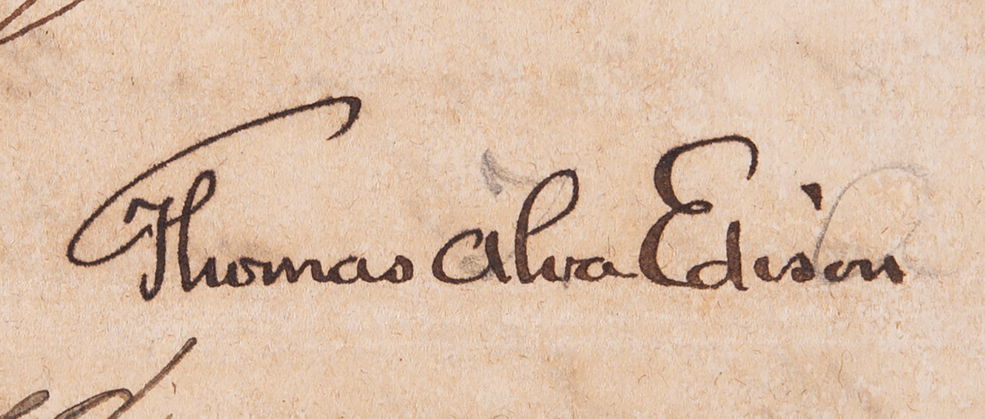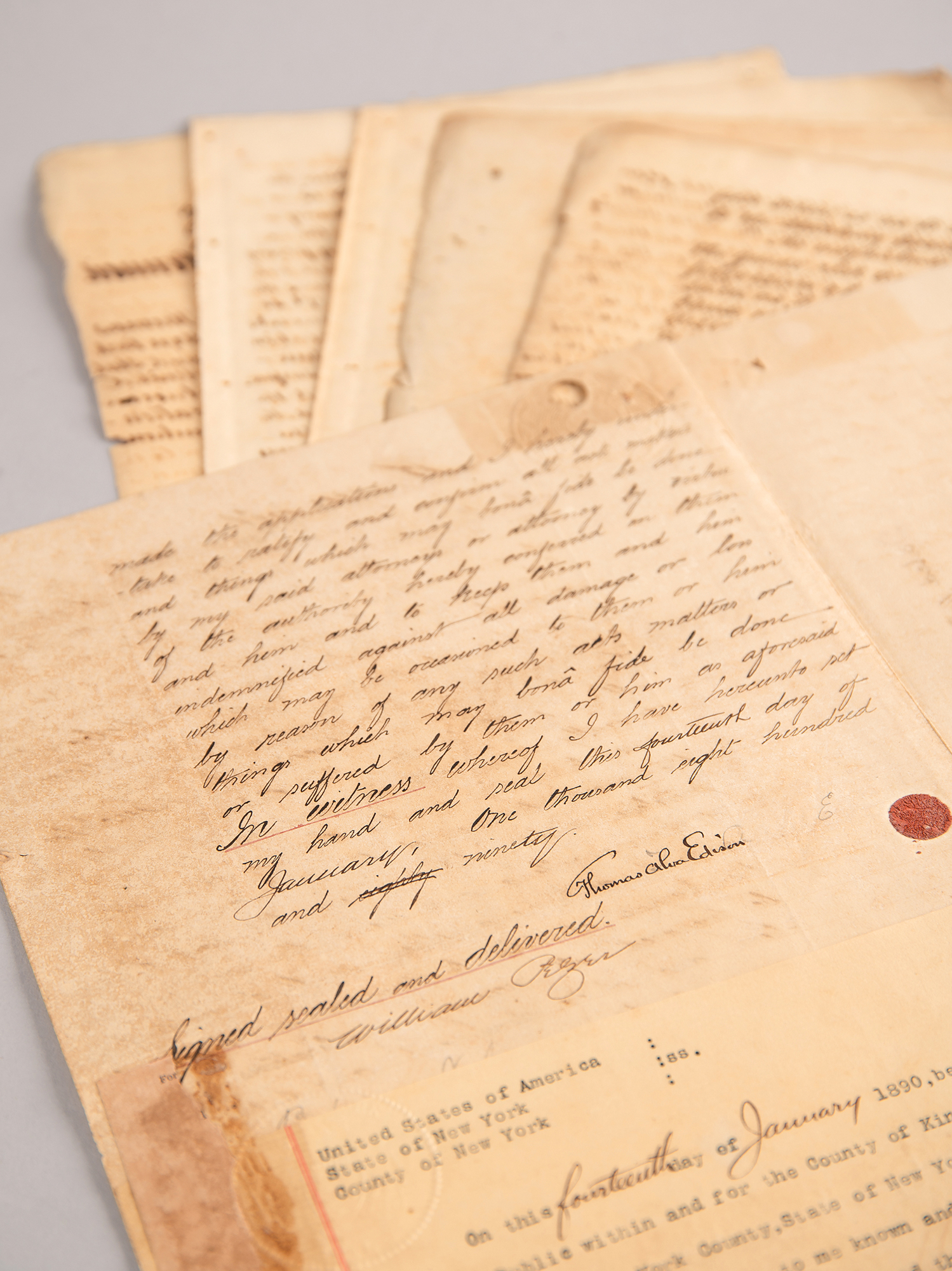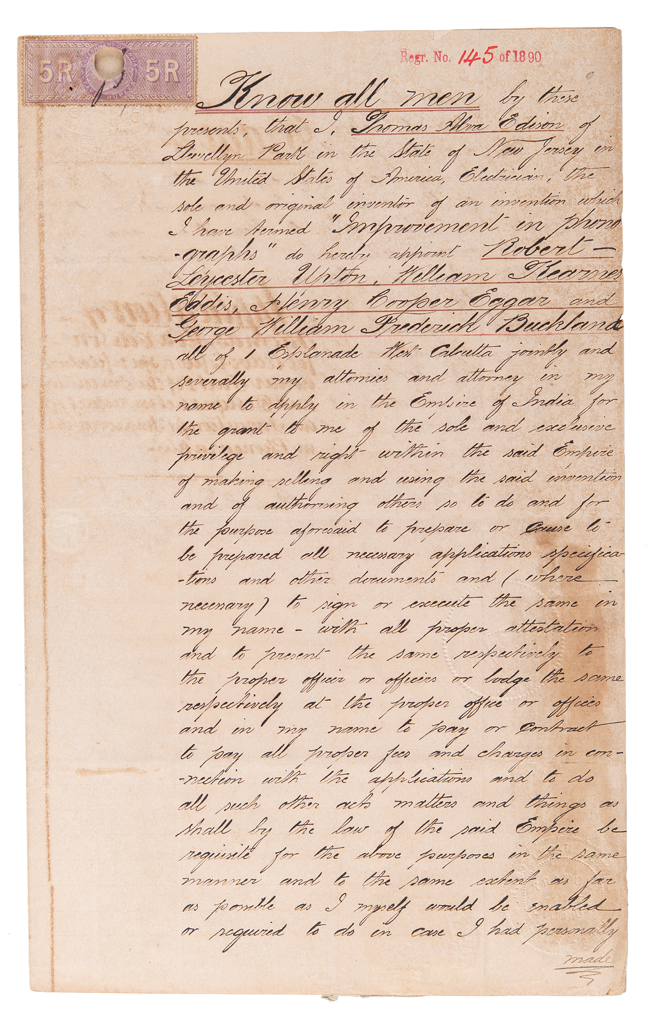 Historic manuscript DS, signed ?Thomas Alva Edison,? one page both sides, 8 x 13, January 14, 1890. In part: "I, Thomas Alva Edison, of Llewellyn Park in the State of New Jersey in the United States of America, Electrician, the sole and original inventor of an invention which I have termed 'Improvement in Phonographs' do hereby appoint Robert Leycester Upton, William Kearnes Eddis, Henry Cooper Eggar and George William Frederick Buckland?jointly and severally my attornies and attorney in my name to apply in the Empire of India for the grant to me of the sole and exclusive privilege and right within the said Empire of making selling and using the said invention and of authorising others so to do." Affixed below Edison's signature are a notarized document certifying Edison as the signer, and a certification of the notary's credentials.