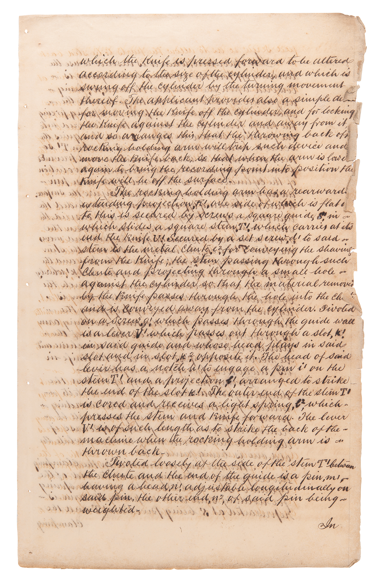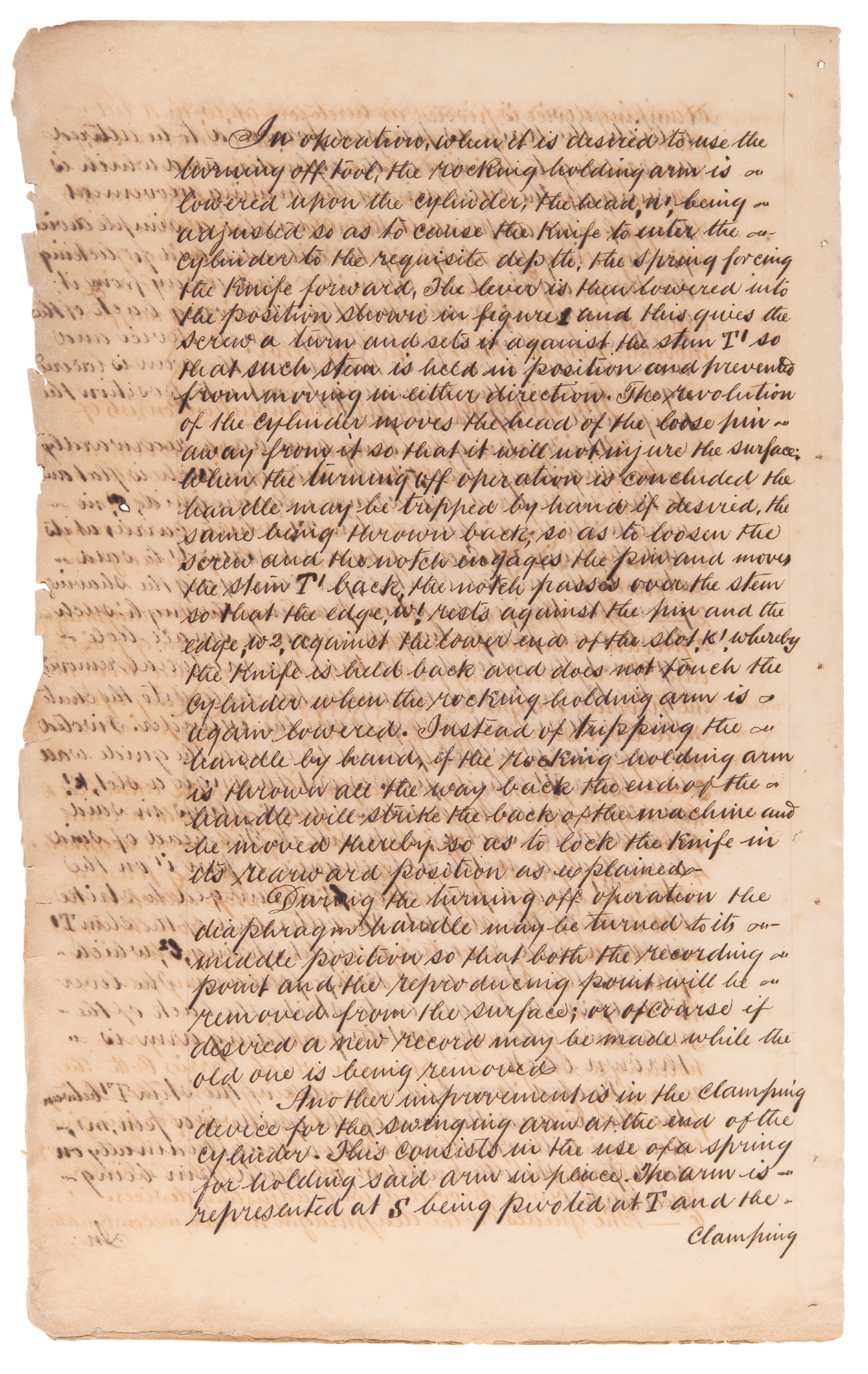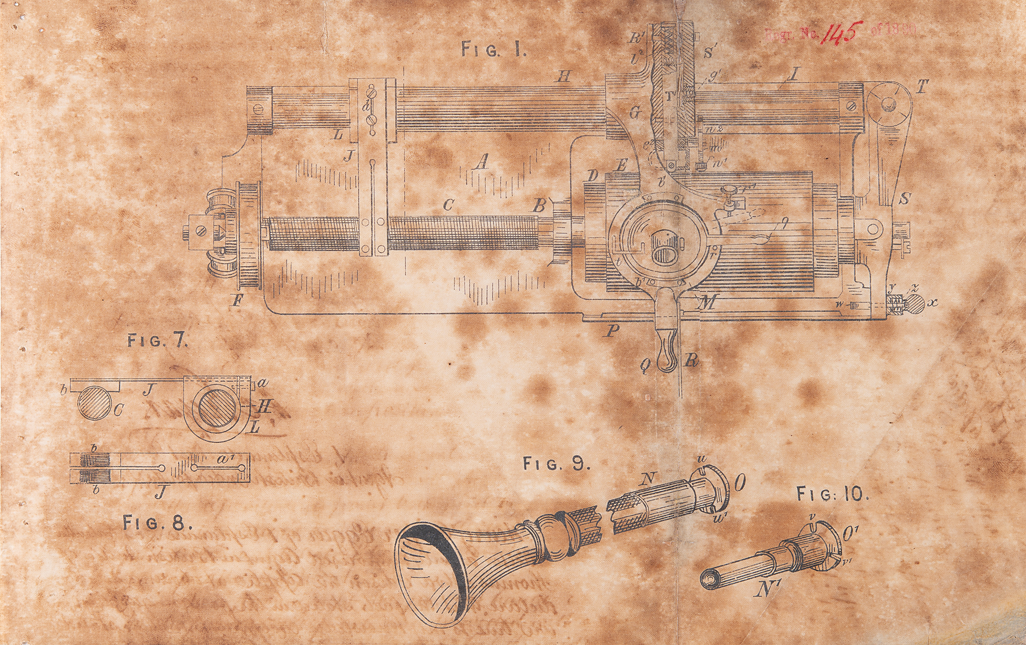 Includes a manuscript "application of Thomas Alva Edison for leave to file a specification under Part I of the Invention and Designs Act in respect of an Invention for Improvements in Phonographs," totaling eleven pages on six sheets, stamped at the head: "Received in the Office of the Secretary of the Government of India?on the 3 July 1890." The manuscript describes Edison's invention, designed to "increase the simplicity in construction and operation of the phonograph, by decreasing the number of parts of which the machine is composed, by lessening or avoiding the necessity for adjustment of the various parts in practice and by increasing the convenience of manipulation of the machine." The application is signed twice by Henry Cooper Eggar, "H. C. Eggar," to whom Edison had granted power of attorney for this purpose. Includes two further pages of printed schematic diagrams for parts corresponding to those described in the application. In overall very good condition, with scattered soiling and staining (very heavy to the two printed diagrams), tears and creases to one of the notary certificates, and chipping to edges of the manuscript application.