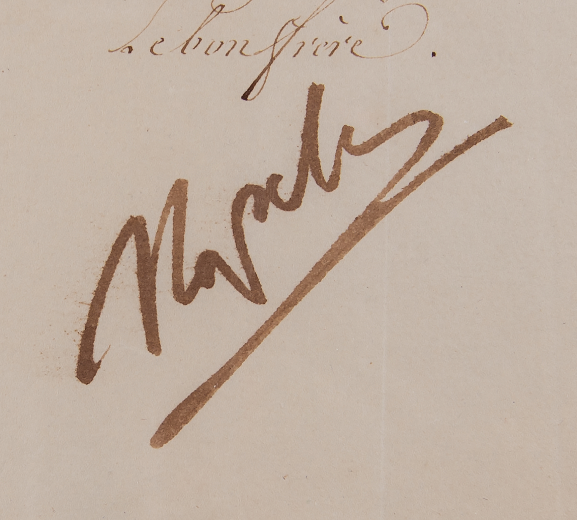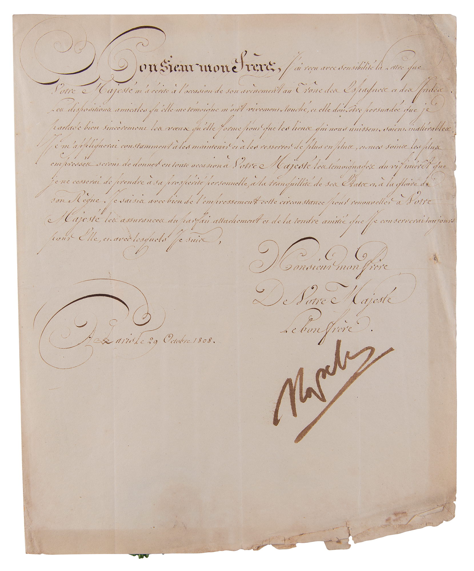 Historic LS in French, signed “Napole,” one page, 8 x 9.75, October 29, 1808. Letter addressed to "Monsieur mon Frere le Roi des Espagnes et des Indes," his brother Joseph, expressing congratulations "on the occasion of his accession to the throne of Spain and the Indies." Addressed on the integral leaf in another hand, and retains its original red wax seal with green silk ribbon. In very good to fine condition, with light creasing to the right side, and a somewhat rough bottom edge; large and bold, Napoleon's signature is an ideal example.