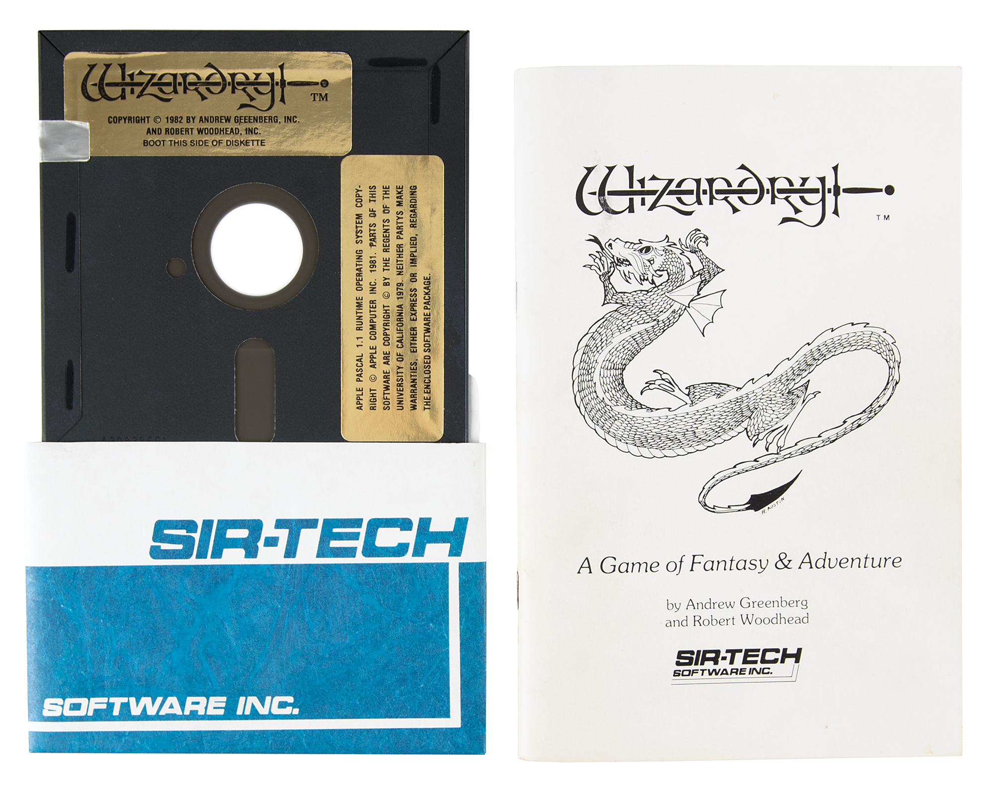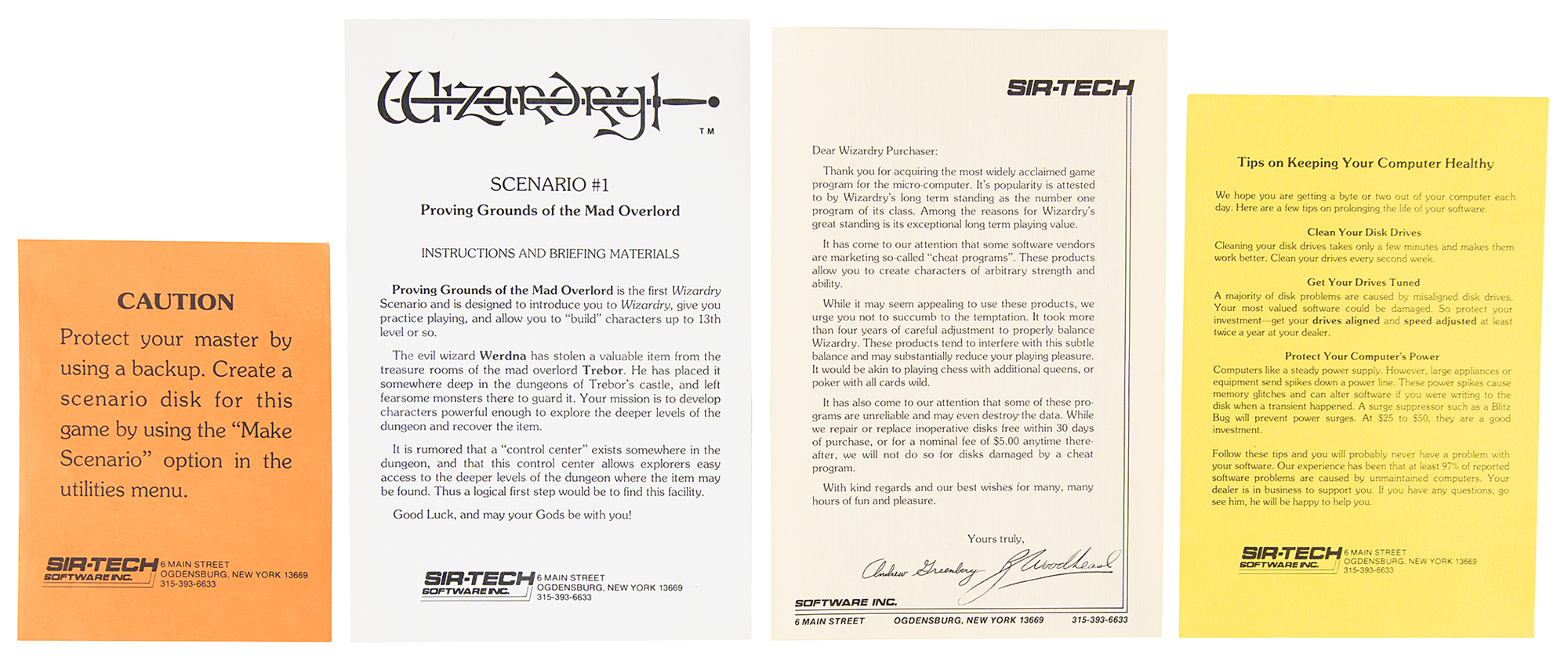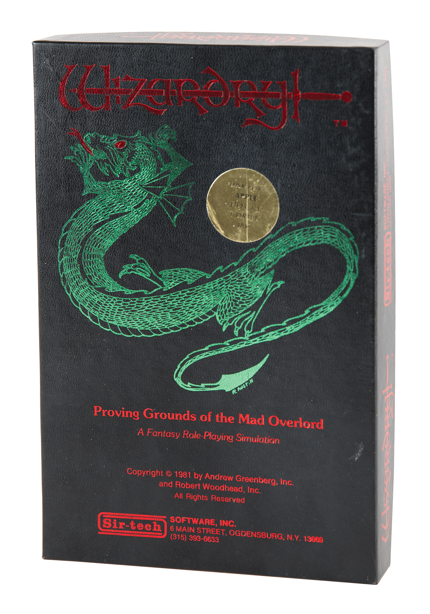 Wizardry: Proving Grounds of the Mad Overlord role-playing video game released by Sir-Tech Software, Inc., for the Apple II personal computer. Includes the original classic box, 6″ x 9″ x 1″, with blood-red text and a stylized green dragon, with the front featuring a golden sticker that reads: “Disk for Apple, DOS 3.3, 1 Drive, 48K.” Box contents include the game’s floppy disk, the 48-page game booklet, a “Scenario #1” sheet offering “Instructions and Briefing Materials,” a template letter from Sir-Tech thanking the “Wizardry Purchaser” for “acquiring the most widely acclaimed game program for the micro-computer,” a computer health tip sheet, and a “Caution” sheet advising players to create a backup disk. In fine condition, with trivial wear.