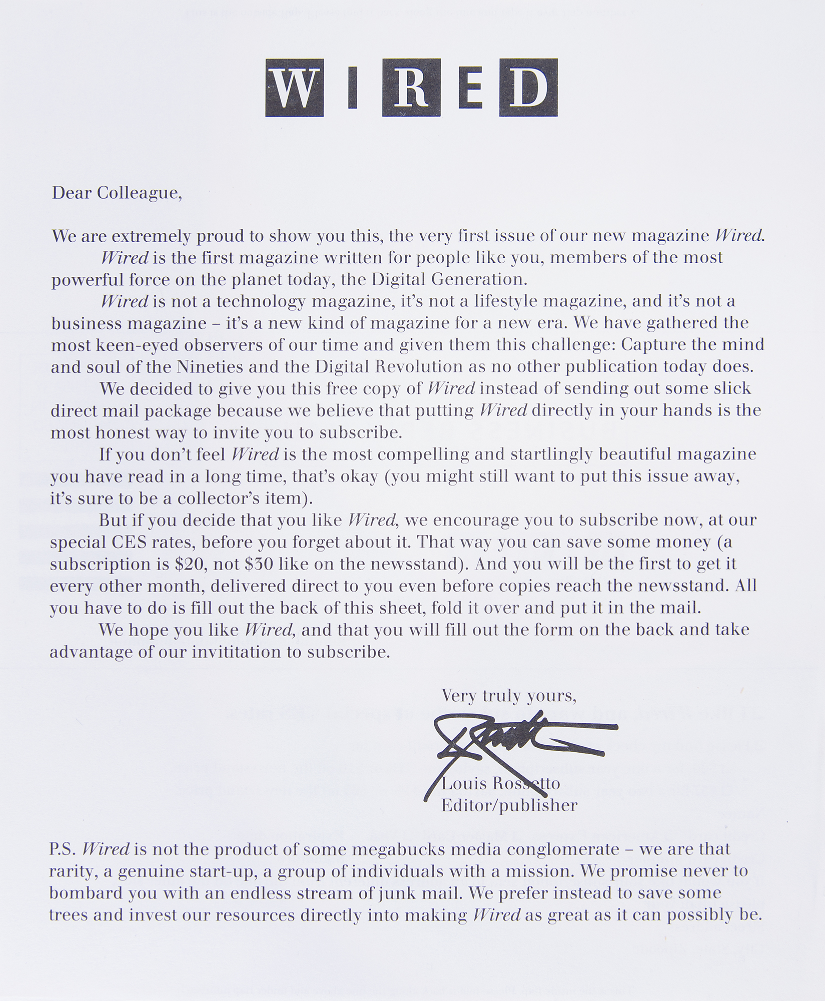 Premiere issue of Wired magazine from March/April 1993, 112 pages, 9 x 10.75, featuring science fiction author Bruce Sterling on the front cover, with lead article line: “Bruce Sterling Has Seen the Future of War.” Includes its subscription letter from editor/publisher Louis Rossetto, which begins: “We are extremely proud to show you this, the very first issue of our new magazine Wired. Wired is the first magazine written for people like you, members of the most powerful force on the planet today, the Digital Generation.” In fine condition, with light rubbing to edges and spine, and a small tear to the bottom of the back cover.