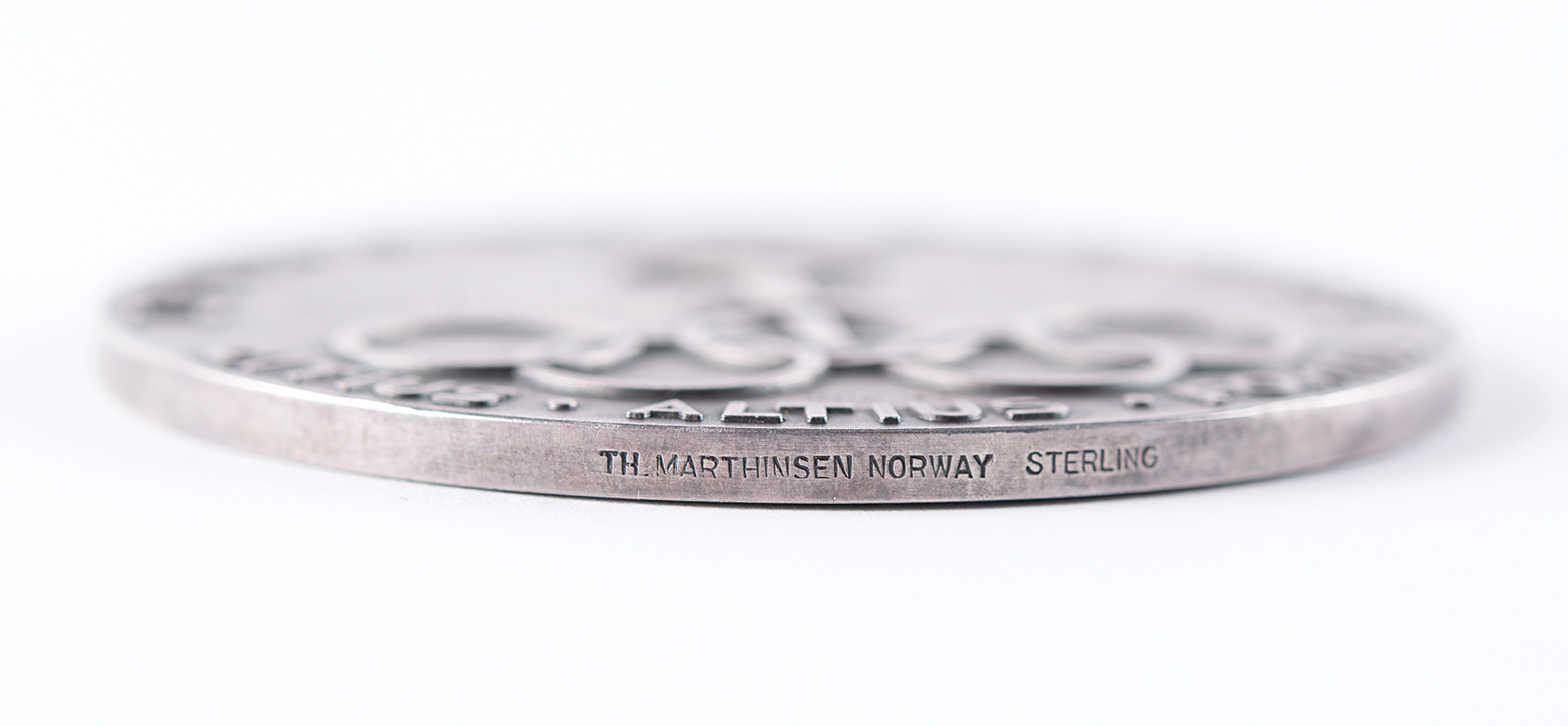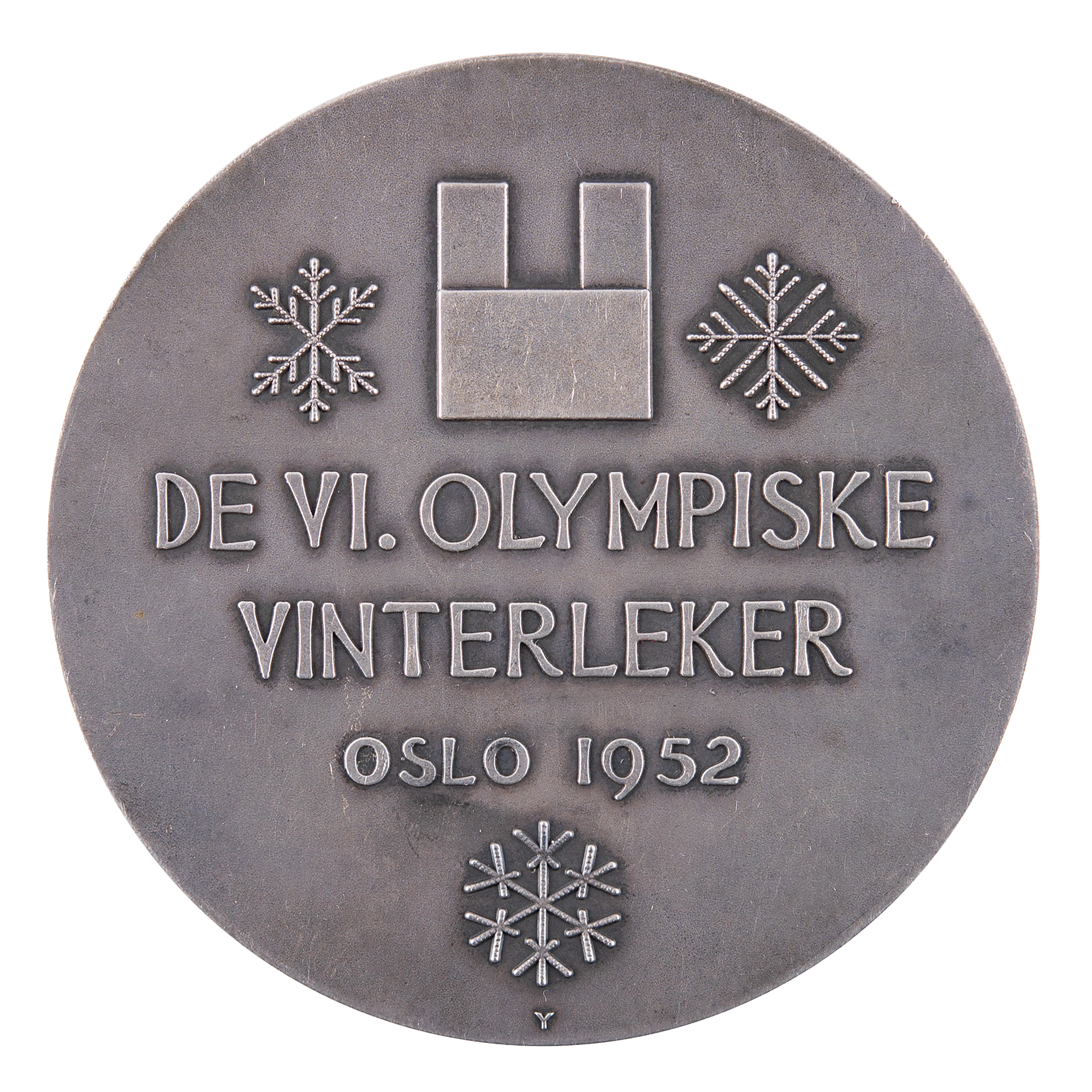 Especially rare winner's medal issued for the Oslo 1952 Winter Olympics. Silver, 70 mm, 139 gm, designed by V. Falireus/Knut Yran, and minted by Th. Marthinsen of Tonsberg, Norway. The front features a raised torch set in the Olympic rings within a French legend with the Olympic motto, "Jeux Olympiques, Citus - Altius - Fortius," with Greek lettering in the background, "Olympia"; the reverse, inscribed "De VI. Olympiske Vinterleker, Oslo 1952," features a silhouette of Oslo City Hall and three snowflakes. Stamped on the edge, "Th. Marthinsen Norway, Sterling." Only 48 silver medals were manufactured for the Oslo Winter Games, 44 of which were awarded to second-place winners. It stands as one of the rarest of all modern Olympic silver medals, and of winner's medals in general—this is the first example of an Oslo silver winner's medal that we have offered.