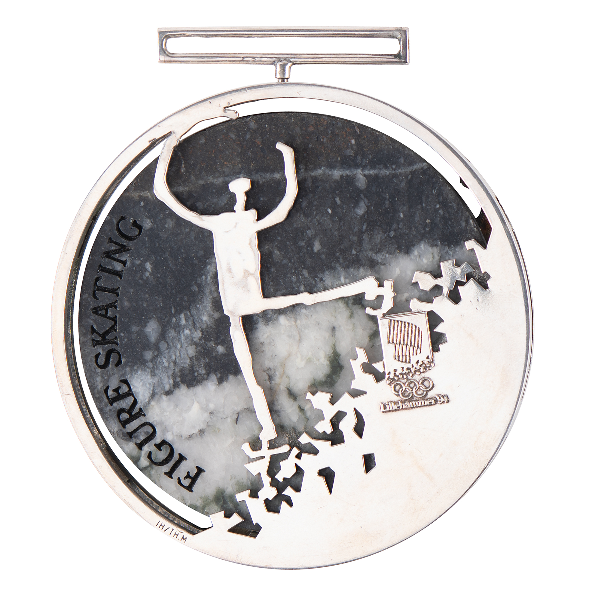 Highly desirable winner's medal issued for the Lillehammer 1994 Winter Olympics. Silver, 82 mm, 125 gm, by Ingjerd Hanevold; manufactured by Th. Marthinsen of Tonsberg. The medal contains a polished circular piece of 600 million-year-old sparagmite that was collected from the Lillehammer Olympic Park during the construction of the Lysgardsbakkene Ski Jumping Arena. The front of the medal features the Olympic rings in silver, with the case’s ice crystal design and the interior stone engraved, “Lillehammer ‘94” and “The XVII Olympic Winter Games”; the reverse retains the ice crystal design and includes the Lillehammer Games emblem with a large pictogram of a figure skater, and the inset stone is engraved with the sport: “Figure Skating.” The rim bears the initials of the designer and mint, and the medal bears slight scuffing.