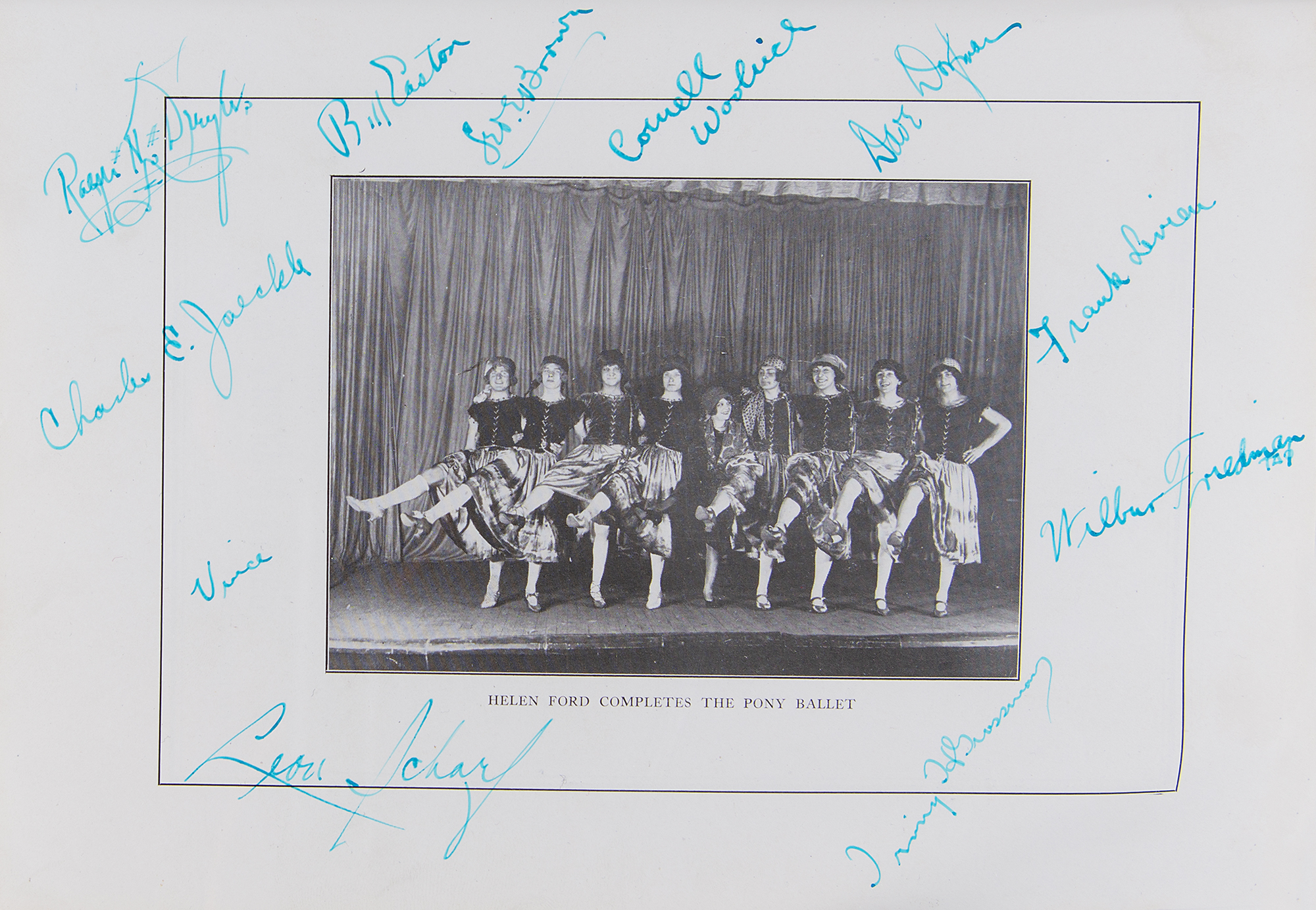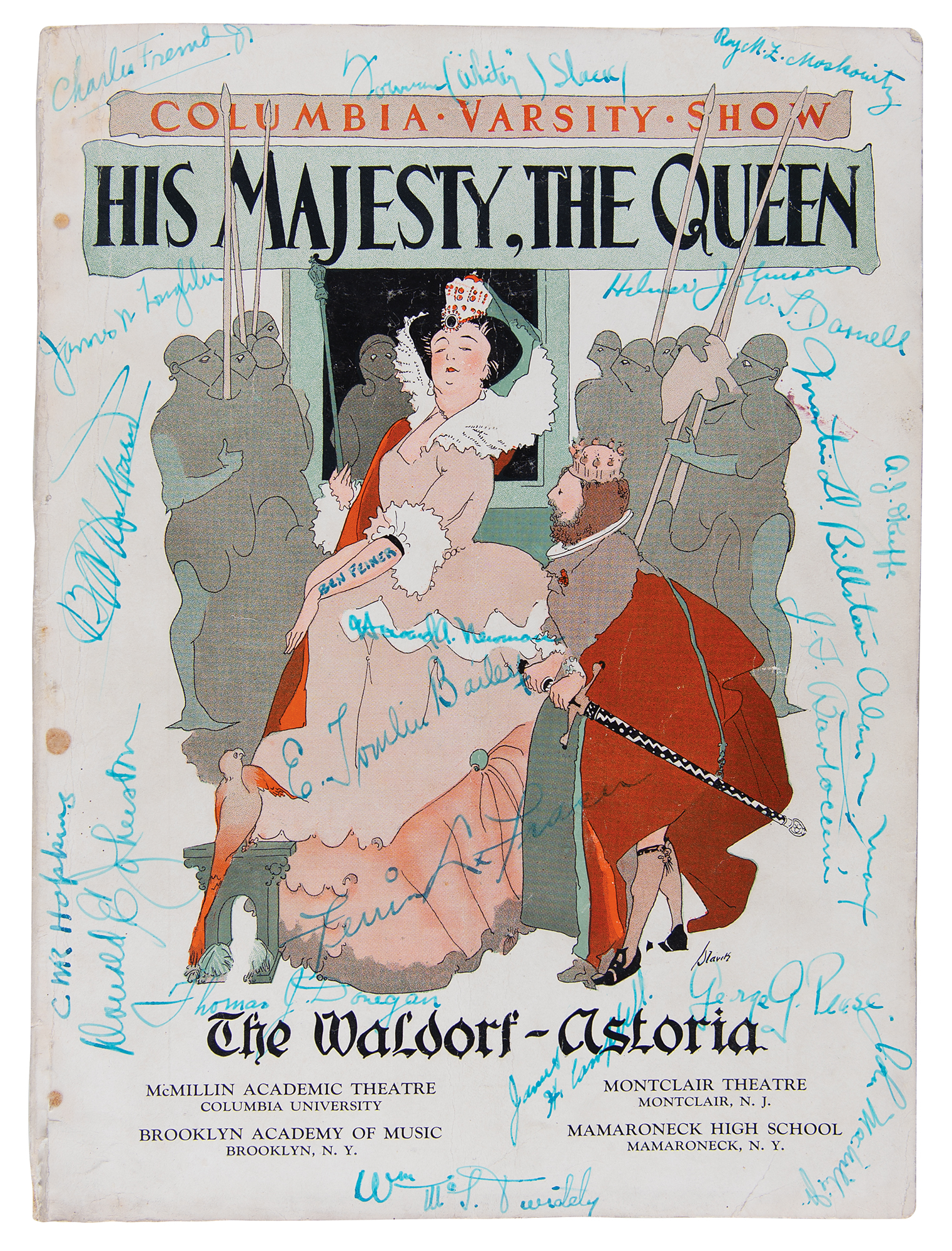 American writer (1903-1968) who is best known for his crime fiction; his story It Had to Be Murder served as the source for Alfred Hitchcock's 1954 classic Rear Window. Program for the Columbia University Players' Varsity Show, "His Majesty, The Queen," at the Waldorf-Astoria, March 9-13, 1926, 7.75 x 10.5, signed on the front cover and inside in fountain pen by numerous members of the cast and crew; Woolrich signs inside as a member of the 'Pony Ballet.' In very good to fine condition, with creasing to the upper right corner and scattered creasing to covers. A rare, early autograph by Woolrich, who attended Columbia University but left in 1926 without graduating when his first novel, Cover Charge, was published.