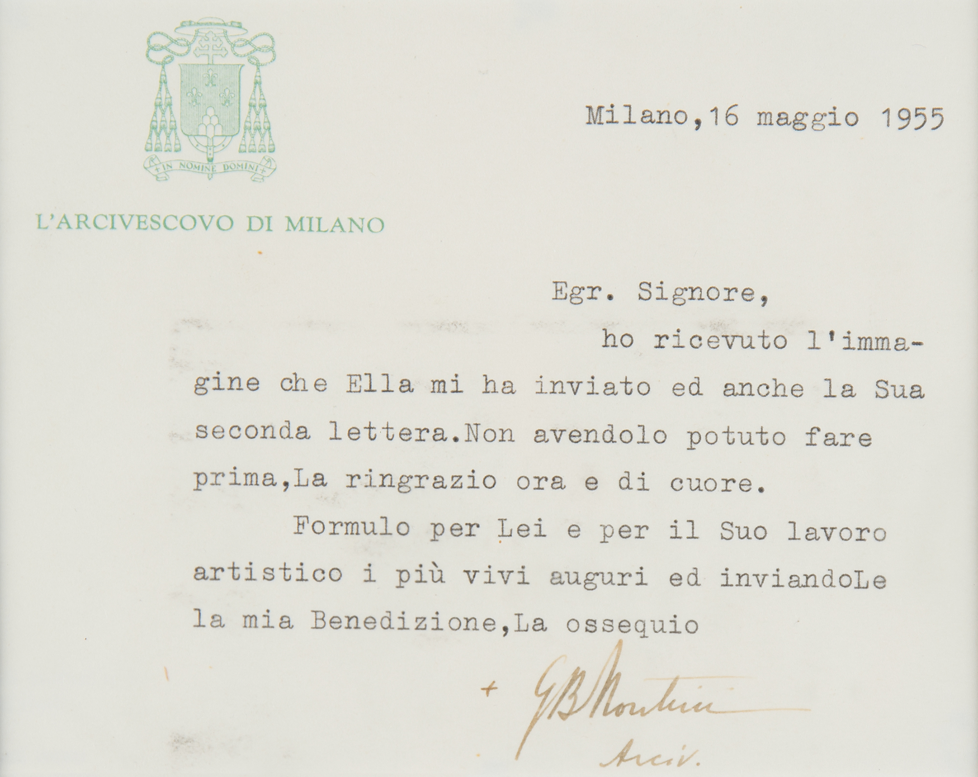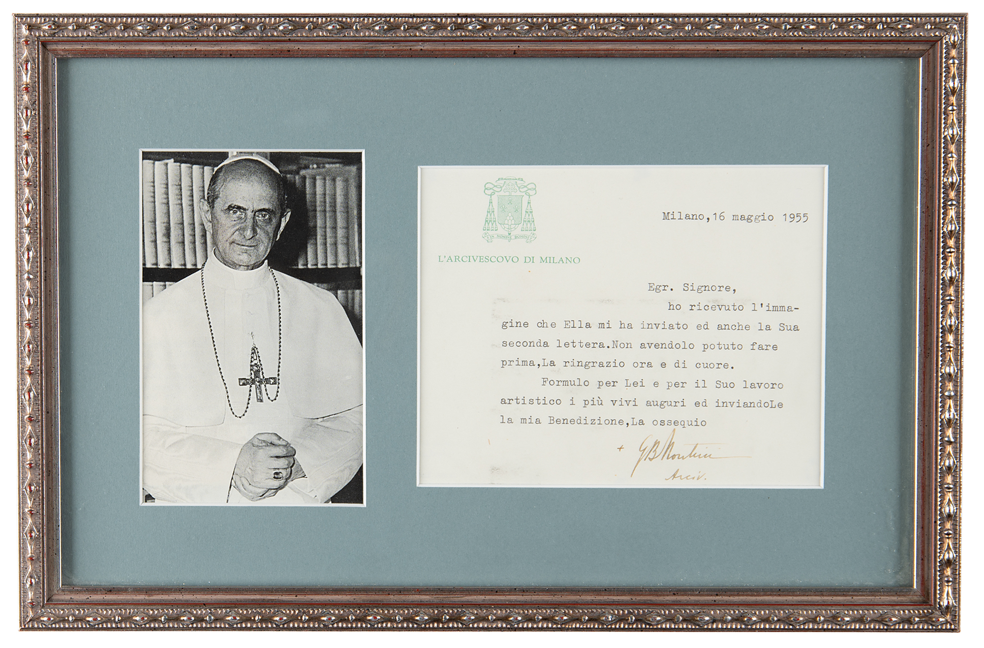 Born Giovanni Battista Enrico Antonio Maria Montini in Italy in 1897, Paul VI reigned as pope from 1963 until his death in 1978. TLS in Italian, signed “G. B. Montini, Arciv.,” one page, 5.25 x 4, Archbishop of Milan letterhead, May 16, 1955. Letter to Walter Bauer, in full (translated): "I received the image that you sent me and also your second letter. Not having been able to do so before, I thank you now and from the bottom of my heart. I extend my warmest wishes to you and your artistic work." Matted and framed with a small photo to an overall size of 12.25 x 8. In fine condition. Accompanied by the original mailing envelope.