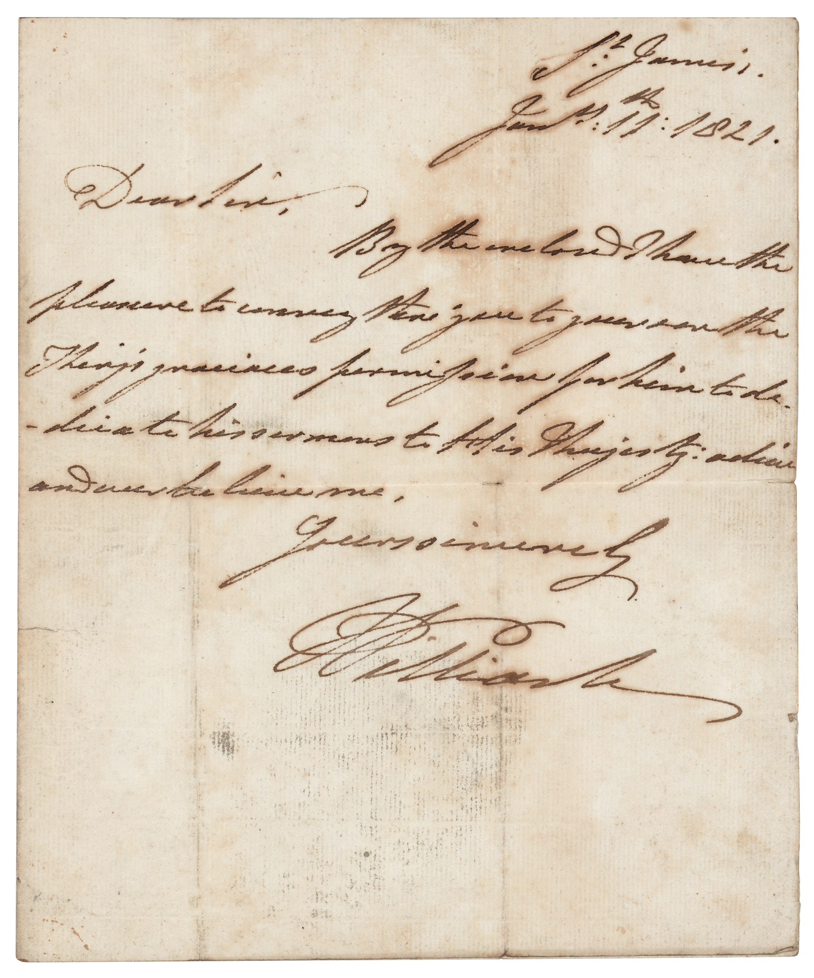 ALS signed “William,” 7.5 x 9, January 11, 1821. Handwritten letter to the theologian and antiquary Reverend Thomas Boys, conveying the King’s permission “to dedicate his sermons to His Majesty.” Includes a letter to the prince from the King’s private secretary, Sir B. Bloomfield, regarding the same subject: “The King has been pleased to accept the dedication of the volume of Sermons about to be published by the Reverend Thomas Boys.” In very good to fine condition, with a short edge tear and some light staining. Accompanied by a modern photo print of King William IV, the reverse of which bears a label from the National Portrait Gallery of London.